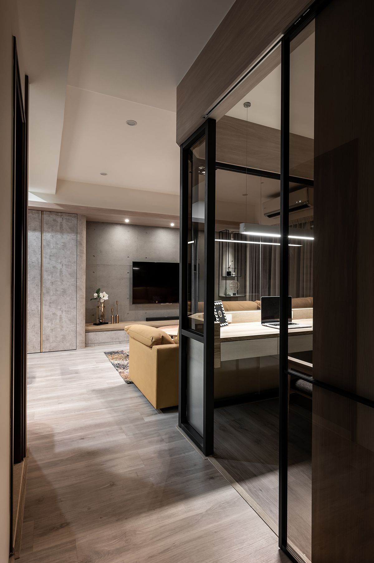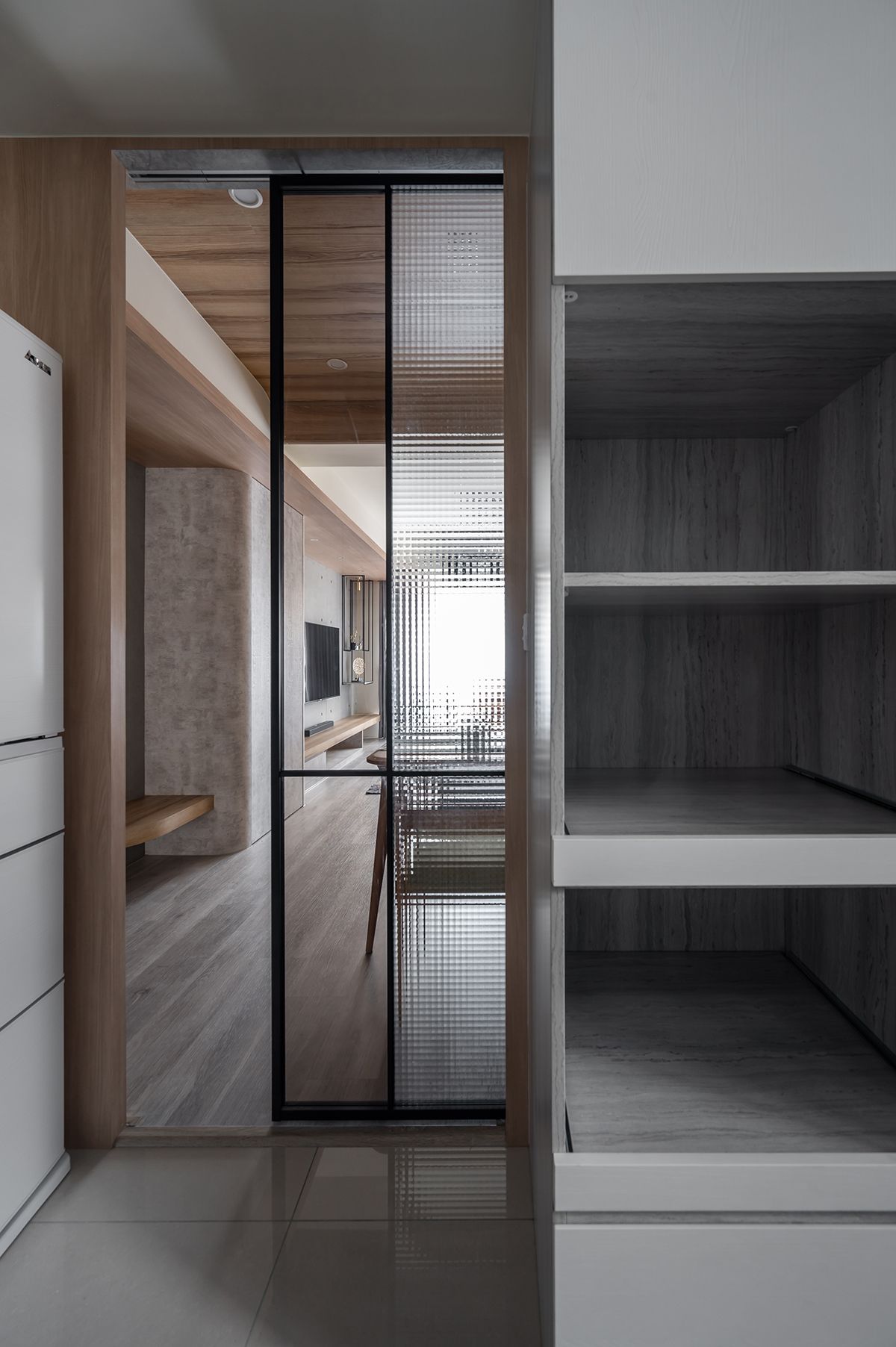 餐廳作為入門即見的端景,上方鋪設弧角深色木紋板材,與紋理清淺的玄關天花板鮮明區分,奠定穩重柔和的區域調性,下方懸掛鐵件造型吊櫃,搭配輕巧木質餐桌椅,於氣氛燈光渲染下,呈現咖啡館般的悠閒愜意;一旁原為開放式的廚房,外部加裝玻璃推拉門,有效阻隔烹飪油煙,同時與對面透亮的客廳、書房遙相呼應。