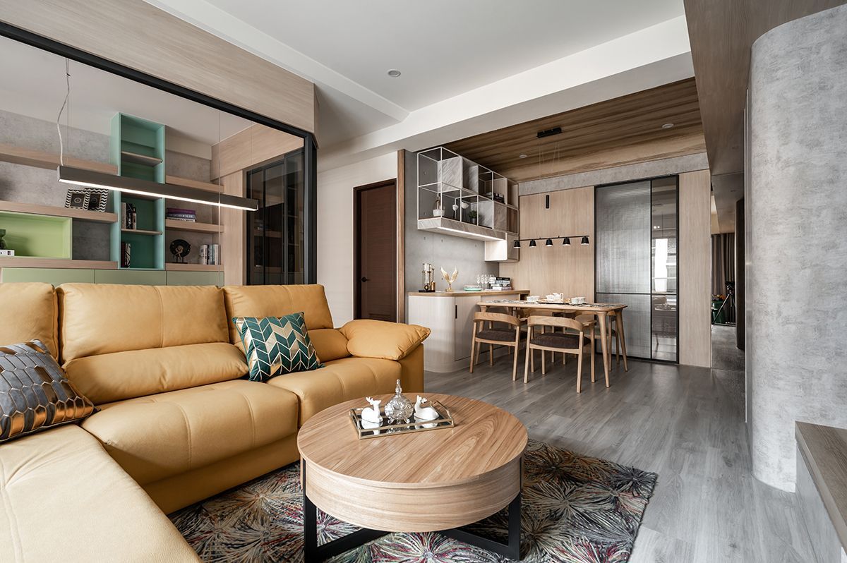 全屋鋪設溫潤的木紋超耐磨地坪,立面施作繁複的仿清水模工法,帶出混凝土般的樸實質感,兩者共同定調清爽自然的空間基底;暖橘、粉綠二色的客廳軟裝及書房櫃體,除了以色彩界定區域定位,更為生活增添活潑彩度,讓身為高階工程師的業主,回家即遠離冰冷的工作環境,享有一室溫馨暖意。
