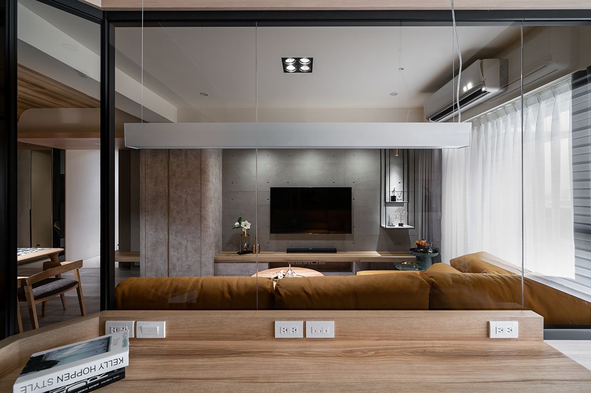 客廳的明亮採光,透過低調的灰藕色窗簾,溫柔地照耀暖色軟裝,形塑溫馨和質感並具的居家畫面;主牆的木質電視櫃,延伸至玄關轉作穿鞋椅,前後分別搭配混凝土色木紋收納櫃、清水模背牆,臨窗處則懸掛一座鐵件展示櫃,加以燈光聚焦視線,共組立體感十足的豐富層次。