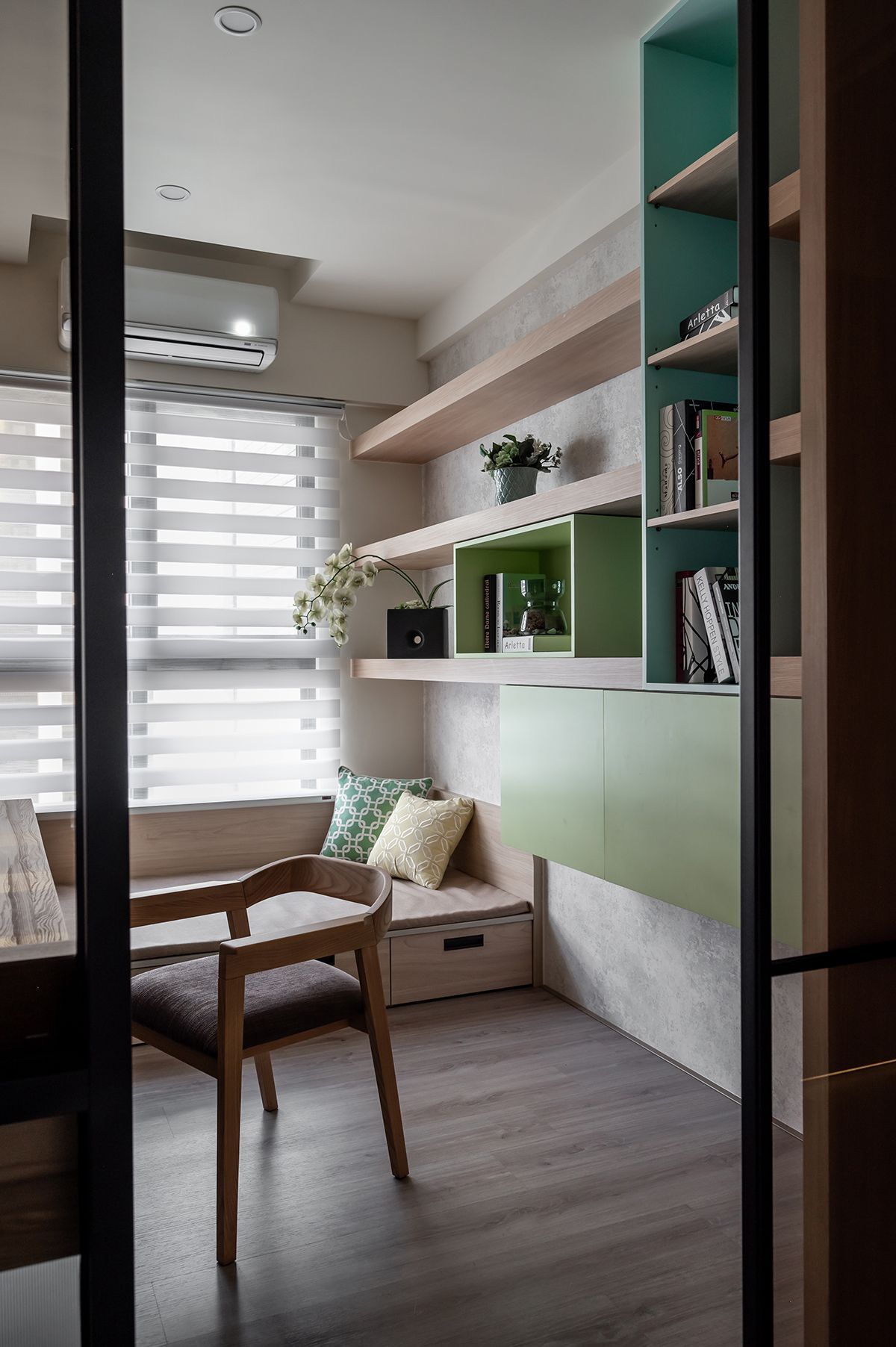 書房窗邊設置一座寬敞臥榻,並於玻璃隔牆旁預留捲簾裝設空間,方便未來轉作客房使用;後方的背牆櫃體,上下分作開放與封閉兩種形式,施以柔和的藍綠、粉綠色,搭配橫向延伸的木質層板,既保有輕盈視感,亦兼具多元收納、展示機能。