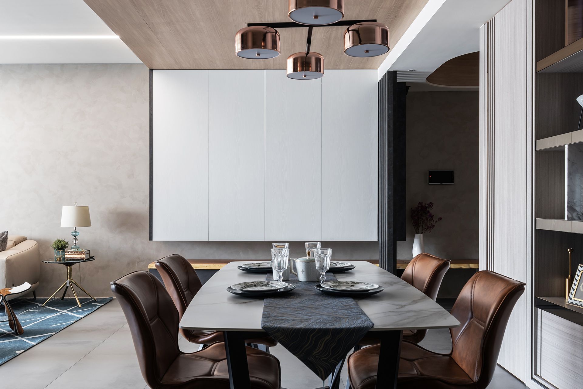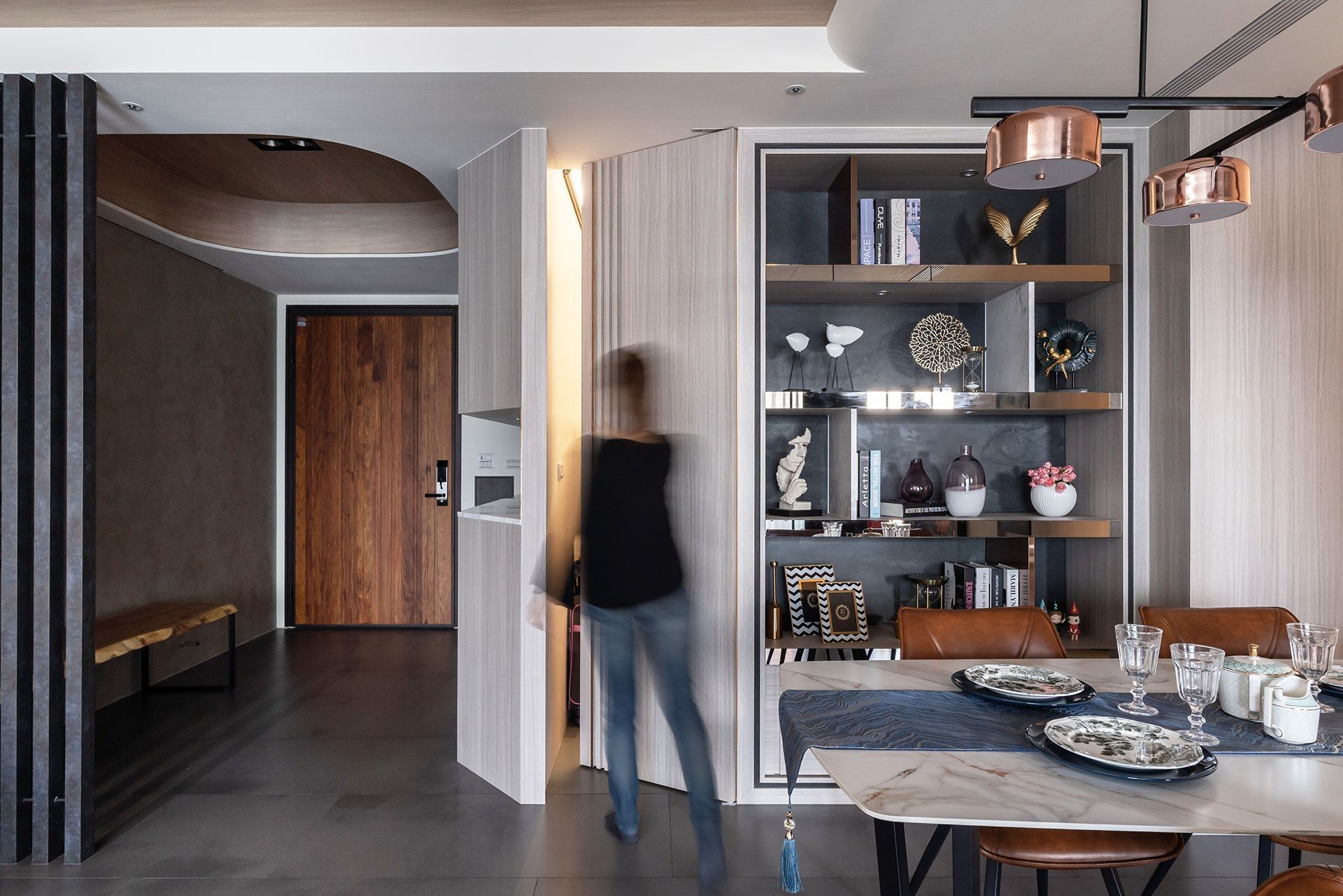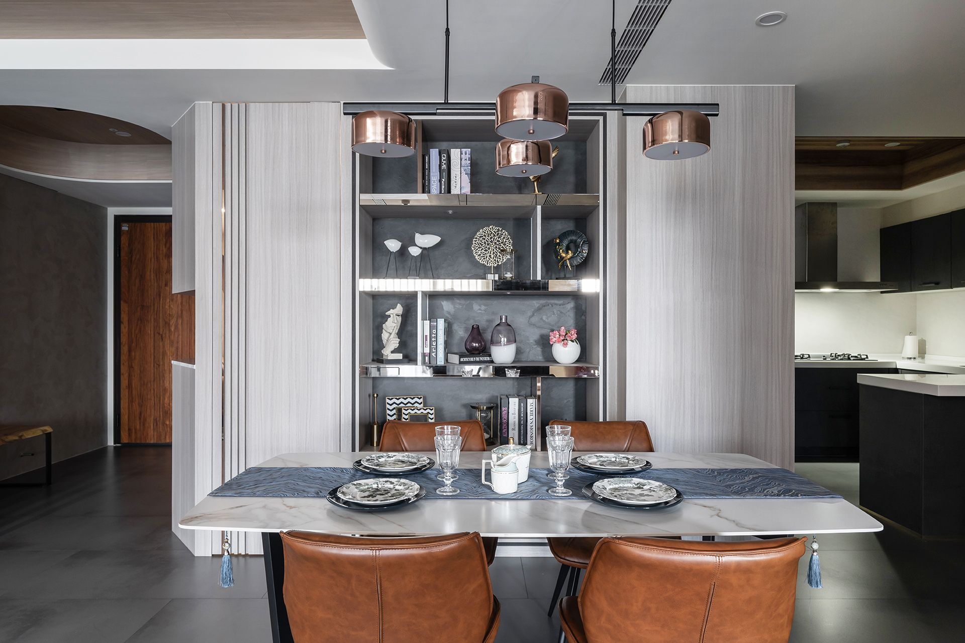 優化格局,讓餐廳不只是餐廳,而是女主人休憩以及宴客的寬敞空間。餐桌上方閃耀黃銅光澤的吊燈,綻放現代質感。餐桌旁的隱藏門,打開即是大型儲藏室。中島旁也有隔柵設計門板的隱藏門,裡面是小孩房。隱藏門旁邊是大型展示櫃,放置咖啡杯等精品瓷器收藏,彰顯主人的獨特氣質。