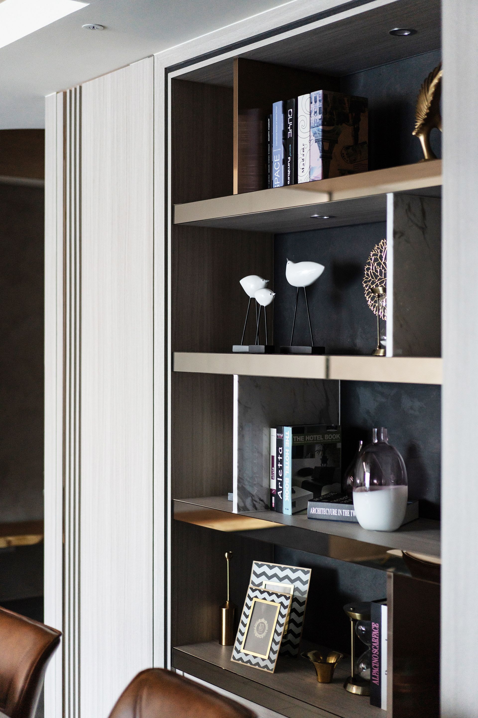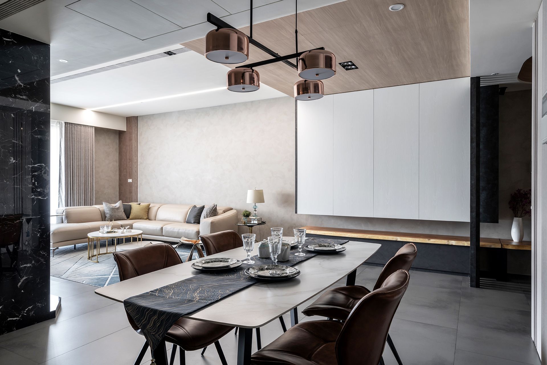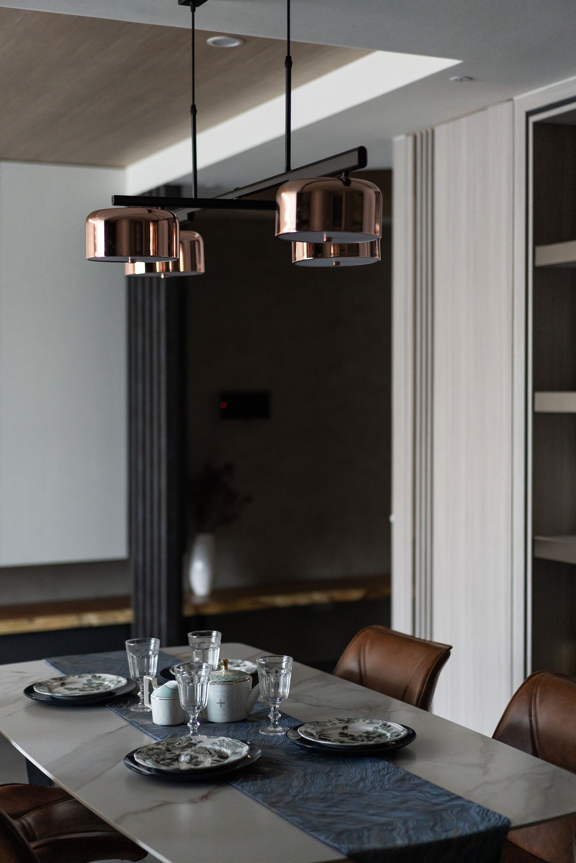 優化格局,讓餐廳不只是餐廳,而是女主人休憩以及宴客的寬敞空間。餐桌上方閃耀黃銅光澤的吊燈,綻放現代質感。餐桌旁的隱藏門,打開即是大型儲藏室。中島旁也有隔柵設計門板的隱藏門,裡面是小孩房。隱藏門旁邊是大型展示櫃,放置咖啡杯等精品瓷器收藏,彰顯主人的獨特氣質。