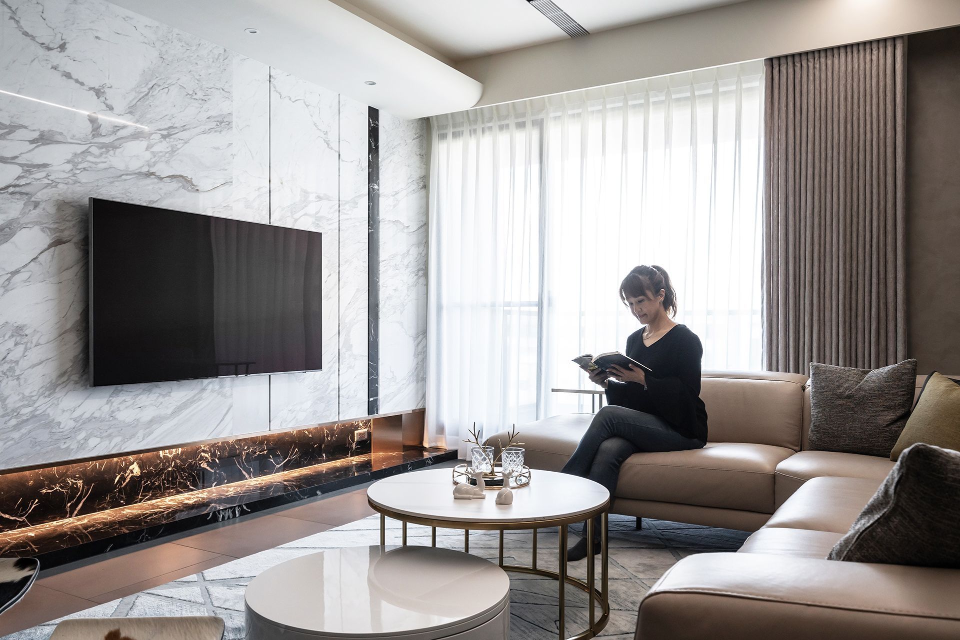 為擔任醫師和企業主管的夫婦規劃具有石材紋理、內斂風格、精緻質感的優雅空間。猶如置身於充滿藝術氣息的殿堂,感受大理石流淌水墨畫般的灰色筆觸,穿透黑色格柵迷人的光影和景深,白色器具在金色燈光照耀下的質地,不同肌理和層次激盪出的感性。細細品味牆面的畫作、展示櫃中的瓷器收藏,此刻彷彿停駐為永恆。
