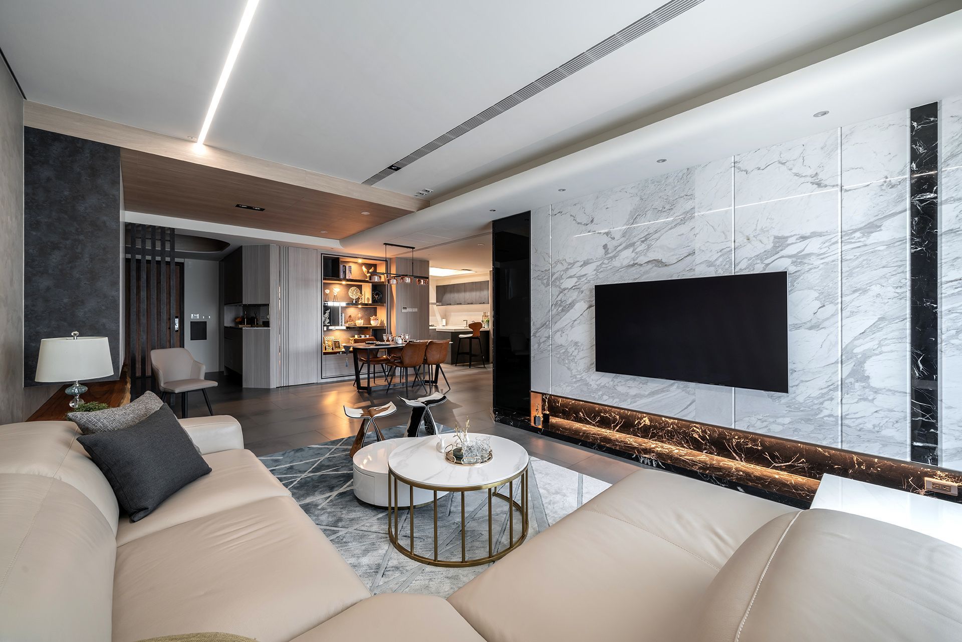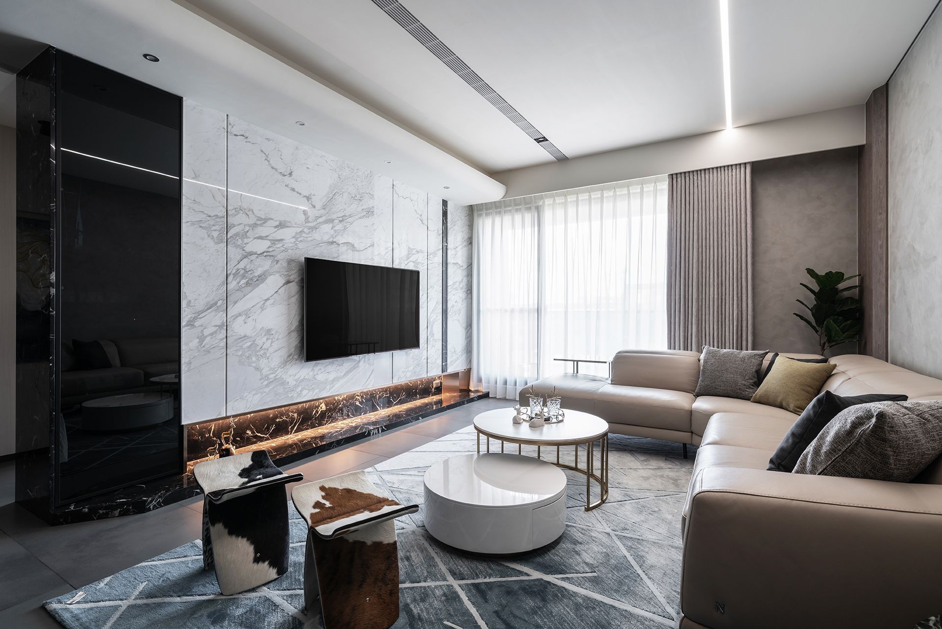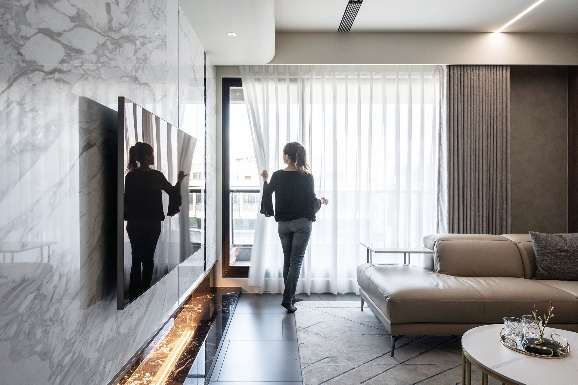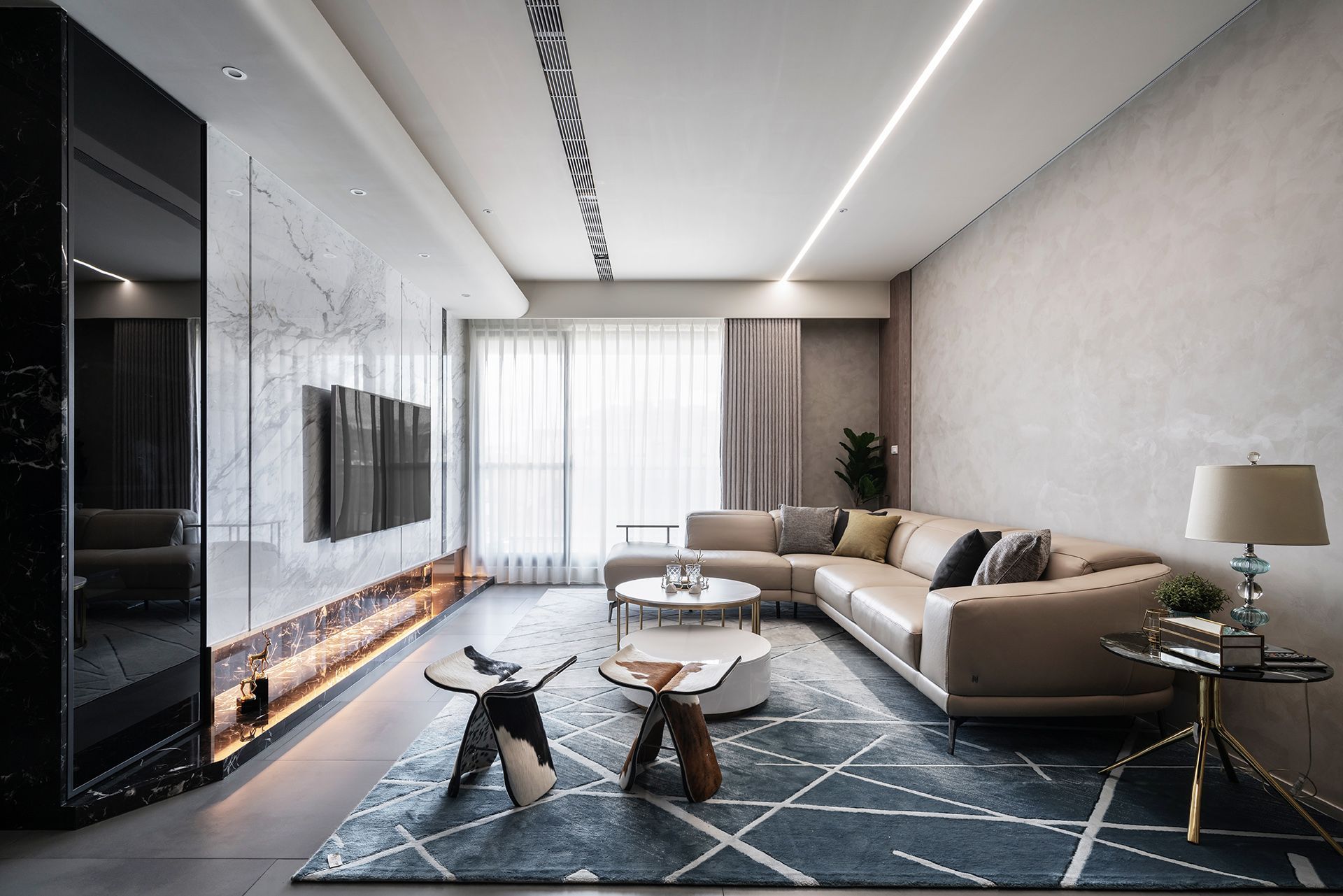 擺放視聽家電設備的黑色玻璃櫃延伸了客廳的主牆,發揮放大空間的效果,也消除了視訊線路可能帶來的裸露雜亂。沙發背牆以駝色手工塗料粉刷,帶出輕盈柔和的質感。天花板內嵌多功能的線性燈,可因應情境需求,搭配明暗不同的光源。