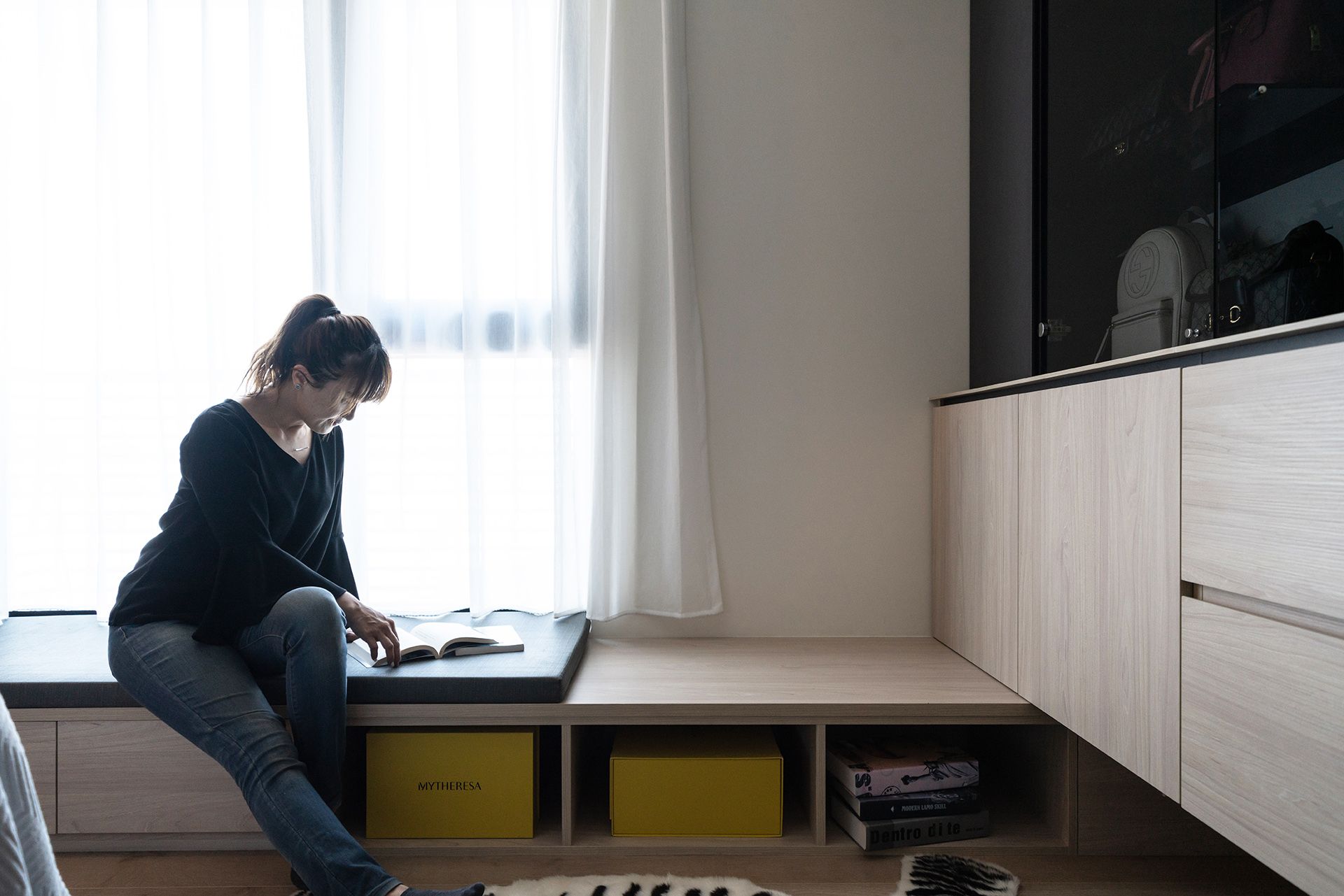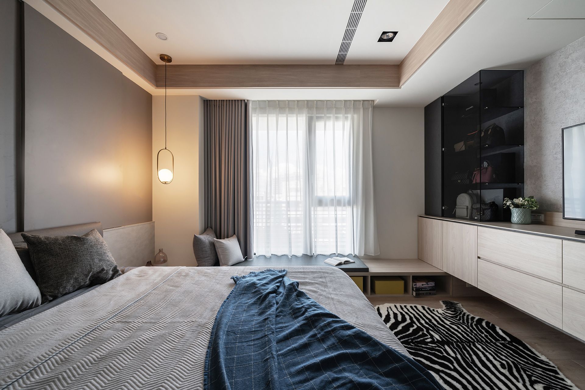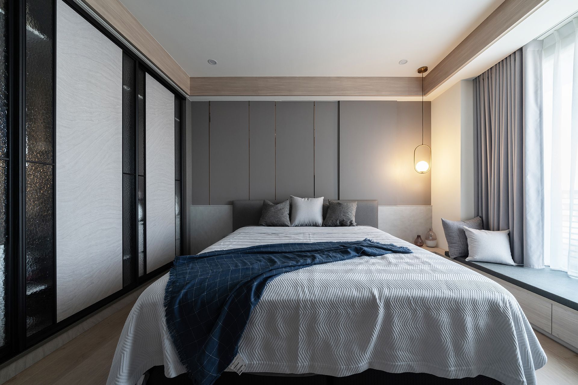 編排原有格局,擴大主臥更衣室空間,衣物、包包、精品等都能一一歸類擺放。床頭背板將鈦金板鑲嵌在木作牆面,打造時尚線條。窗邊增設舒適的長形臥榻,以及線條簡約的吊燈,布置出另一個空間,供女主人在此做家務、或坐或躺地放鬆歇息。