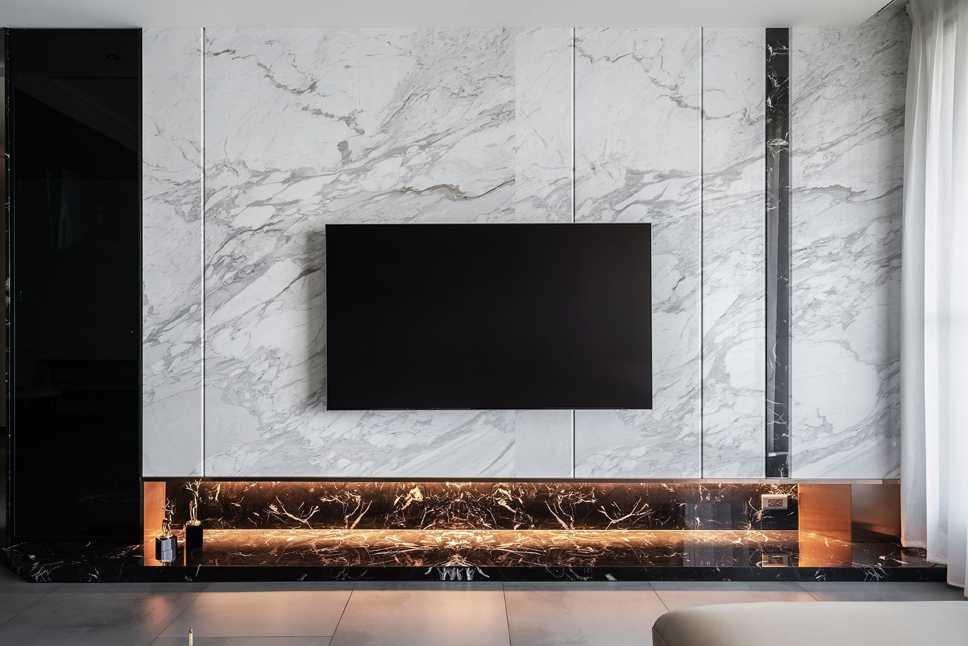 為了平衡灰白銀狐大理石的冷色調,客廳主牆下方以黃色光源打亮深色花崗石,營造有火光映照的暖爐意象,製造出不一樣的氛圍。獨立書房的書櫃背牆運用白色銀狐大理石和灰色岩板做拼貼,搭配溫潤的木質,激發出活潑的趣味。