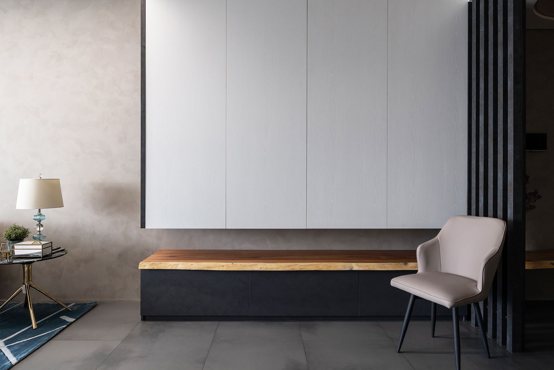 以黑色格柵界定玄關和客廳,同時保有光線穿透性,製造更豐富的光影變化。穿鞋椅使用厚實溫潤的五葉松原木與鐵件椅腳,當客人來訪時,穿鞋椅也可移到餐桌旁,機動性地滿足社交宴客需求。