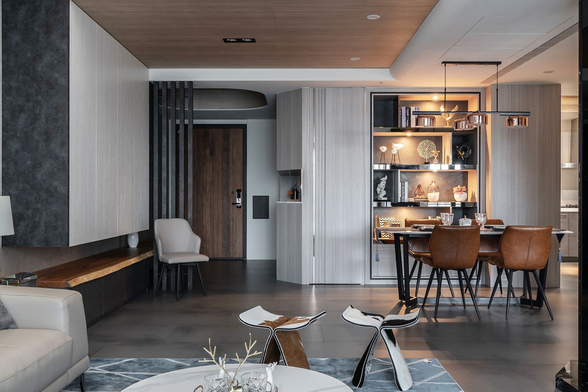 從玄關到餐廳區,以灰色和駝色系等具有生命力的石材和木質,做出綿長連貫的穿透感。玄關黑色格柵的設計,扮演了區隔不同空間的角色,也將視覺自然引導到寬敞明亮的客廳。