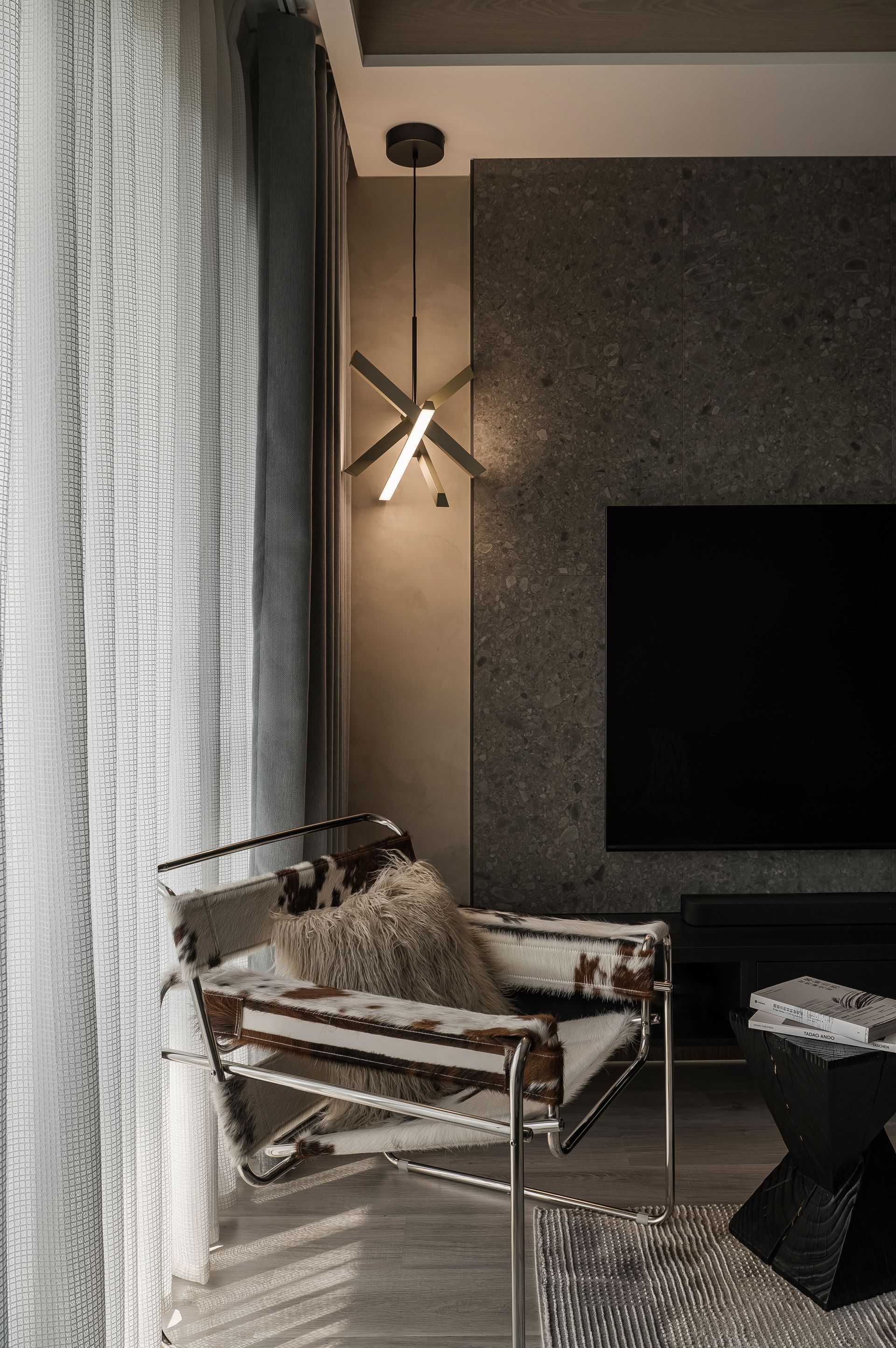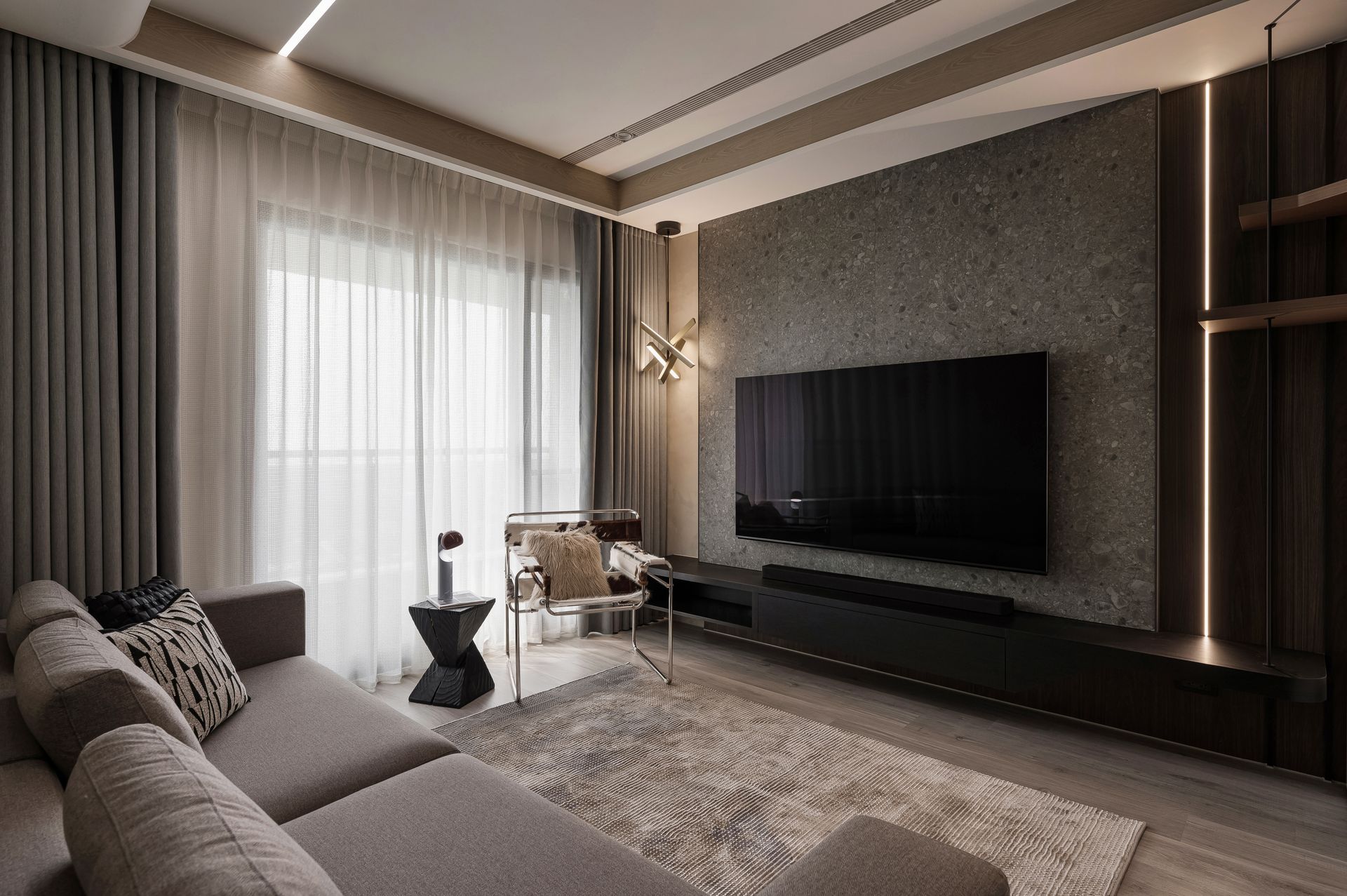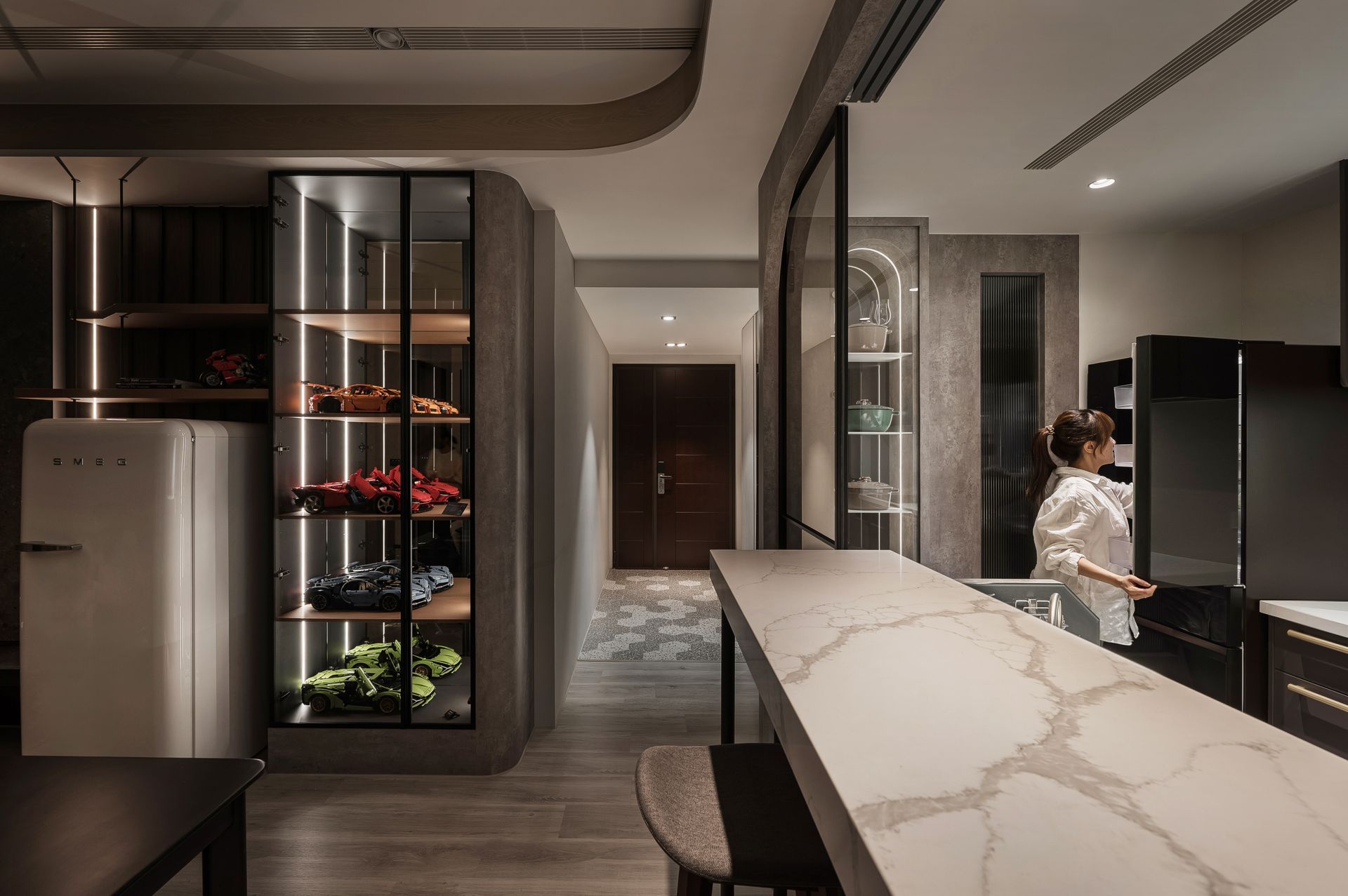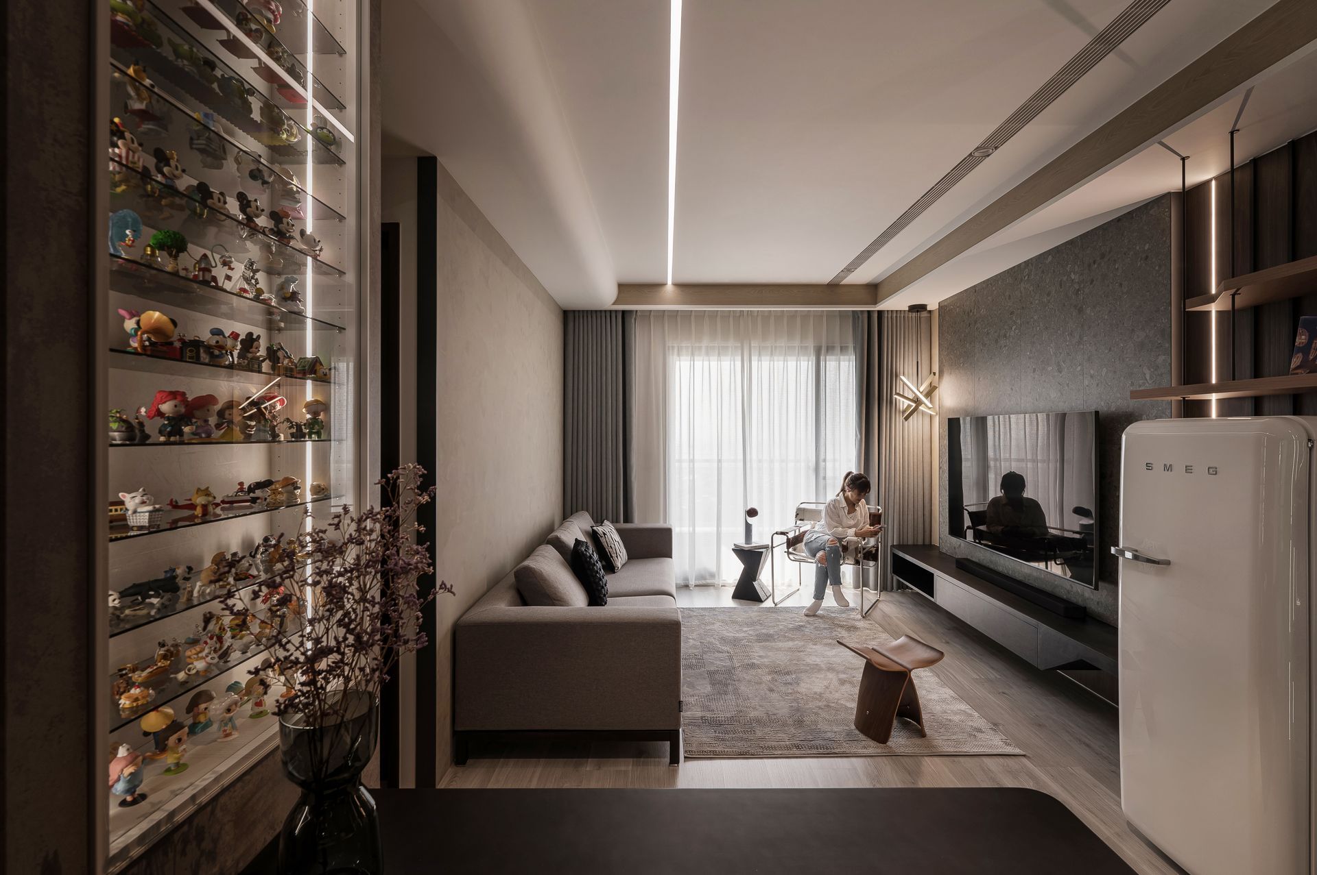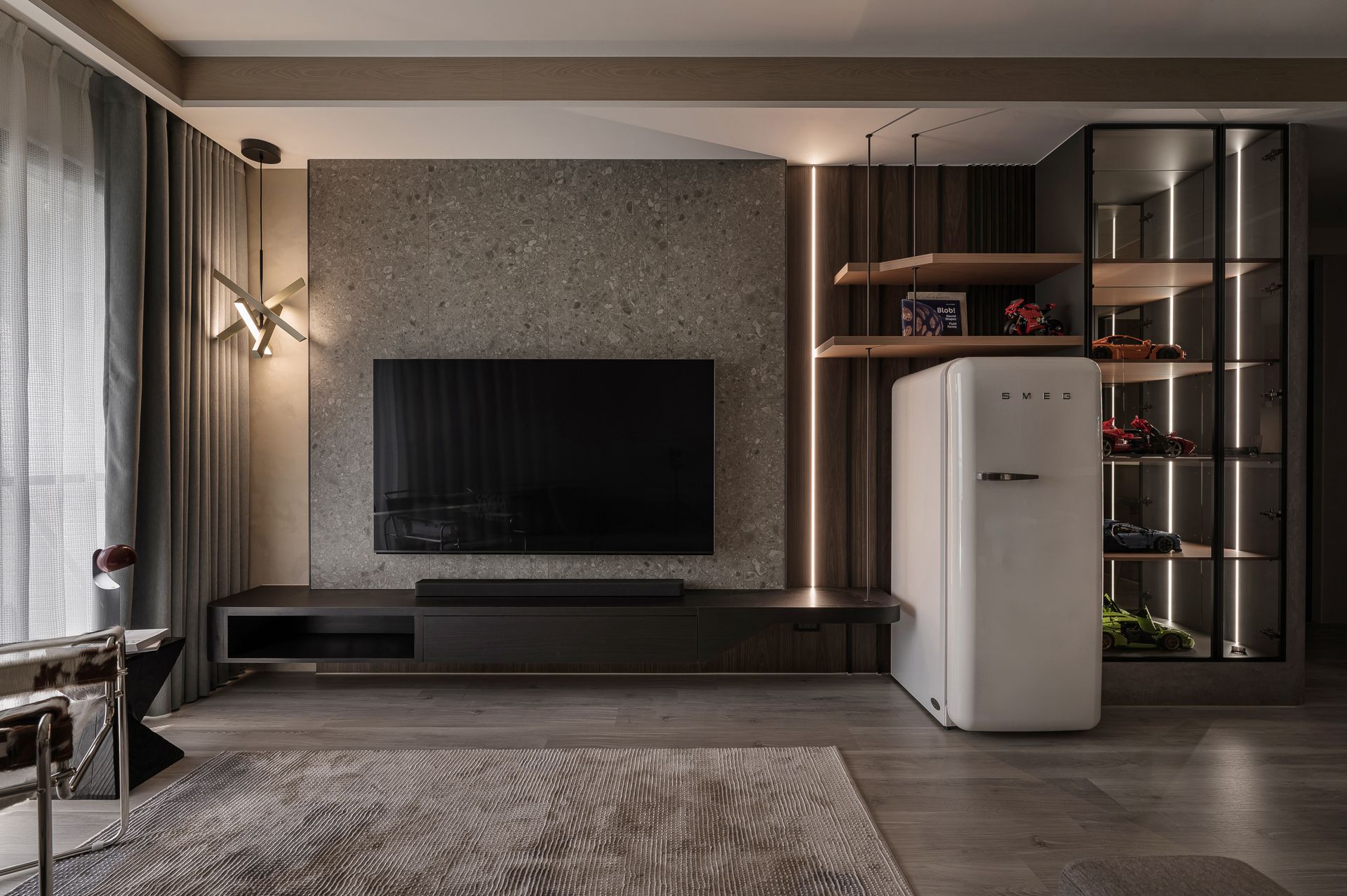 廳的電視主牆以進口水磨大版磁磚與線性燈搭配,勾勒出現代感十足的主牆。一旁的大型玻璃展示櫃,收納著精品與樂高,彰顯了主人的品味。客廳內展示的復古冰箱,放滿了日常的飲品,為生活增添了無限情趣。