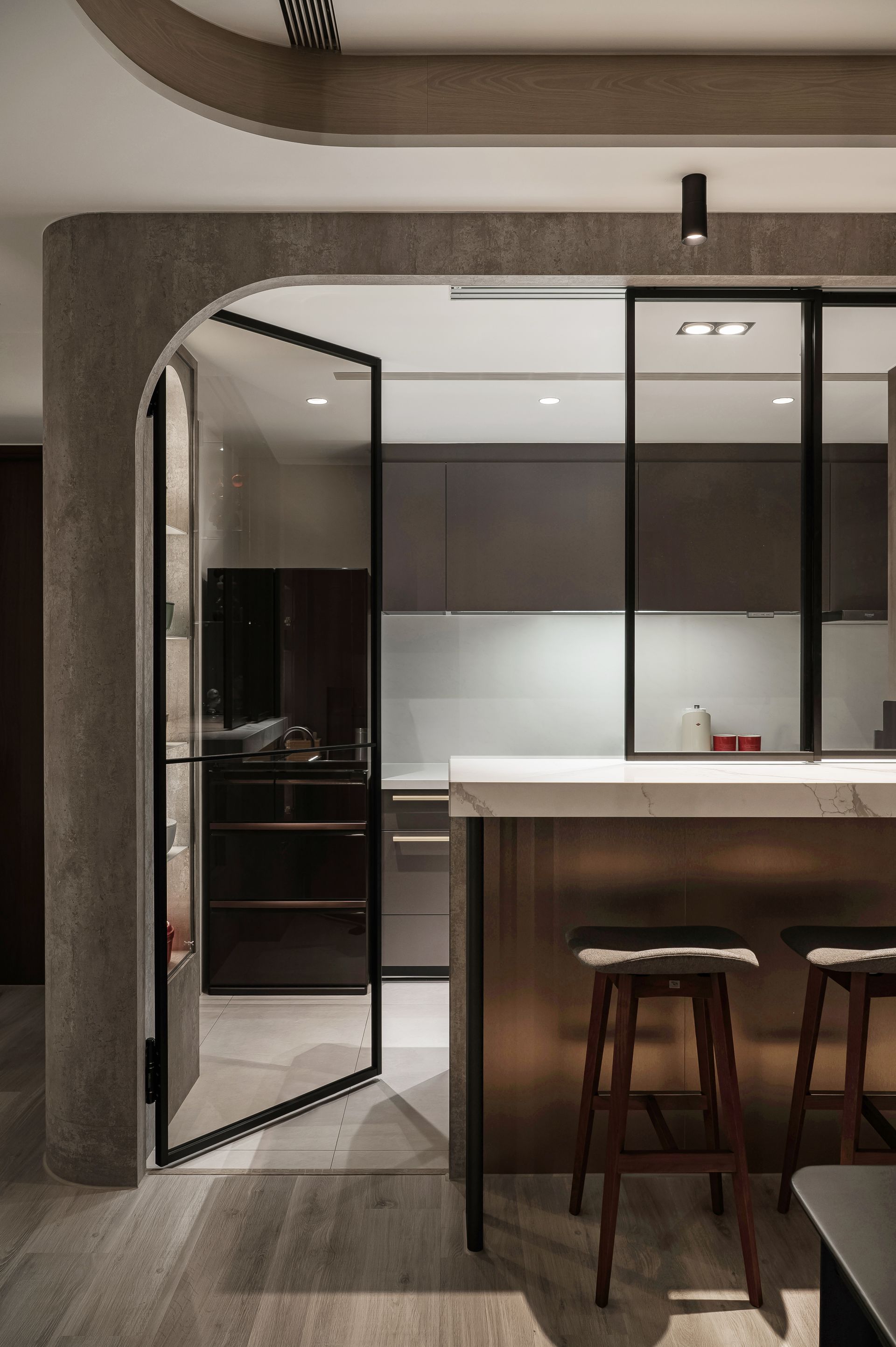 餐廳與廚房的結合,通過中島區隔開放且獨立的空間,鐵件玻璃拉門與可摺收的門片,讓空間既能通透又能隔絕油煙。朝向廚房的中島吧檯,成為製作輕食的理想之地,內設水槽方便泡茶與咖啡製作;朝向餐廳的中島吧檯椅,則是享受小酒與早餐的愜意空間。