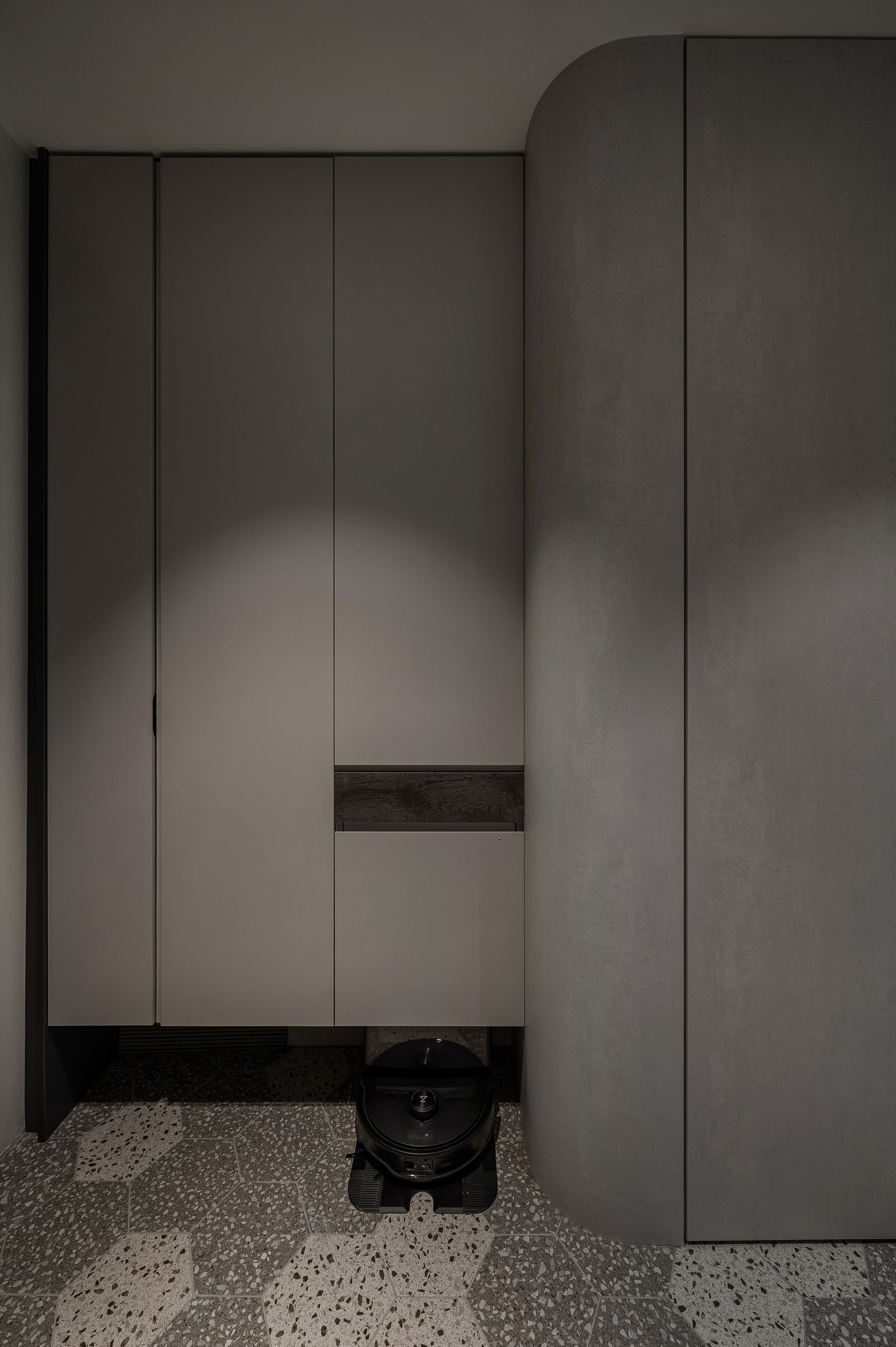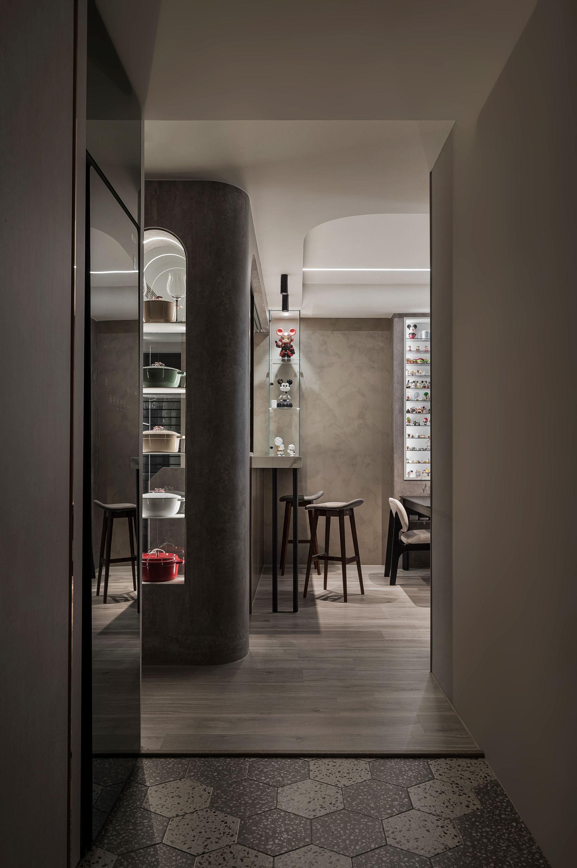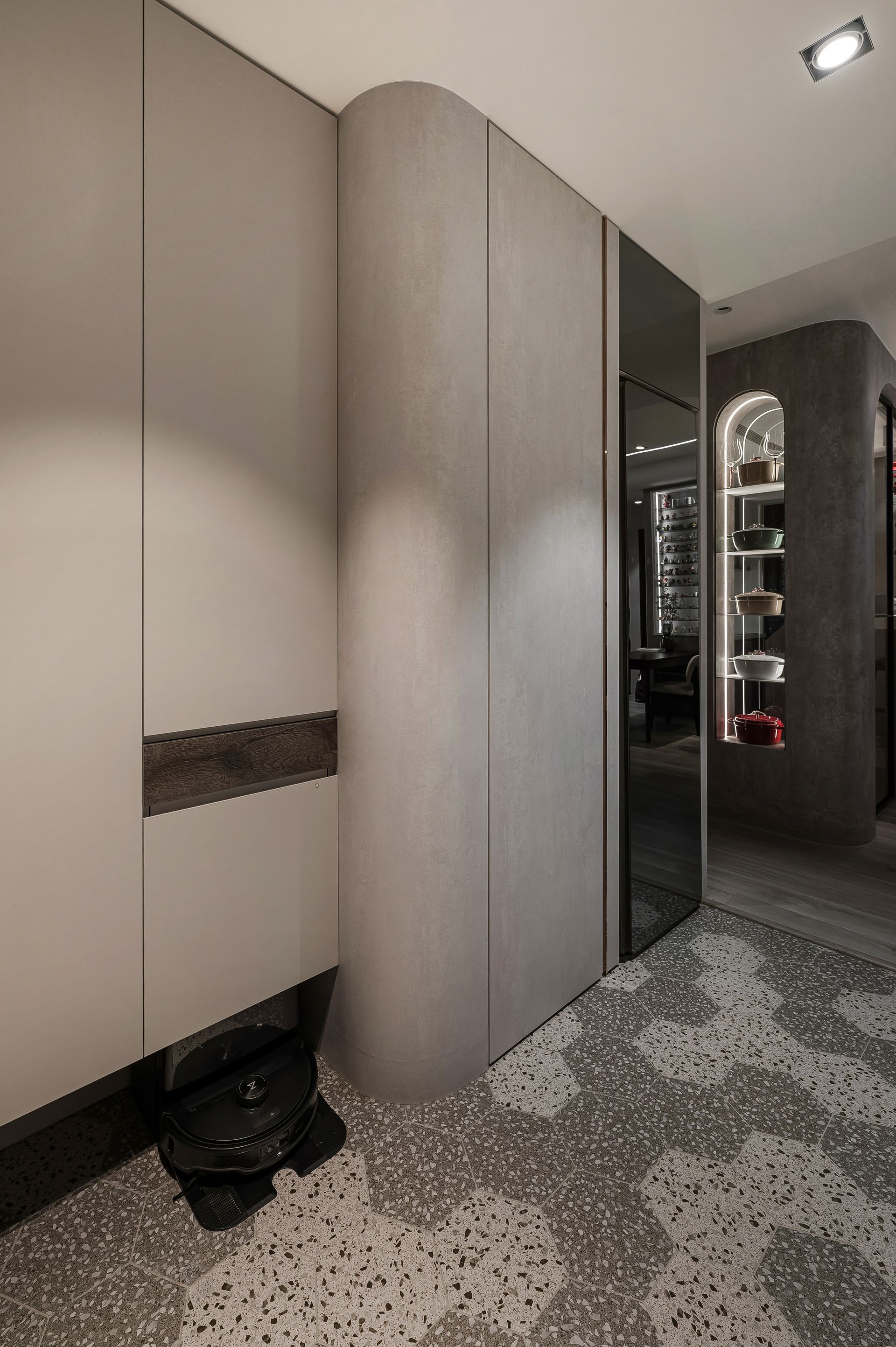 踏入家門,玄關處的水磨石細節與六角磚鋪陳,如晨曦的第一縷陽光,令人眼前一亮。高容量的鞋櫃收納結合電子衣櫃與大容量儲藏室,讓空間井然有序。廚房的弧形隔間形成屏風,讓玄關區域既獨立又有空間感。