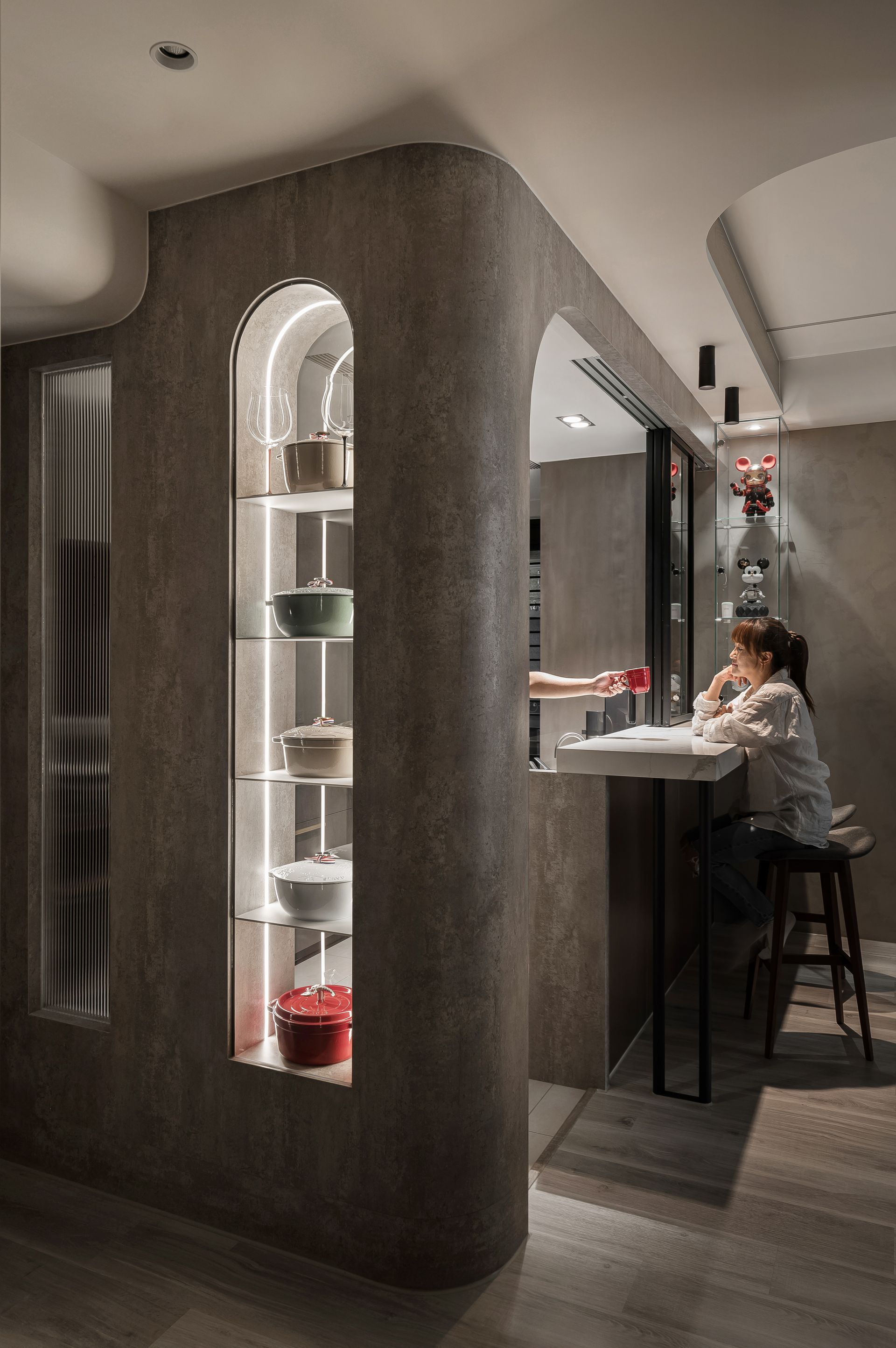 廚房利用隔間轉角設計一個鑄鐵鍋展示櫃,線性燈點亮了各色造型的鑄鐵具,既是收納也是展示。
