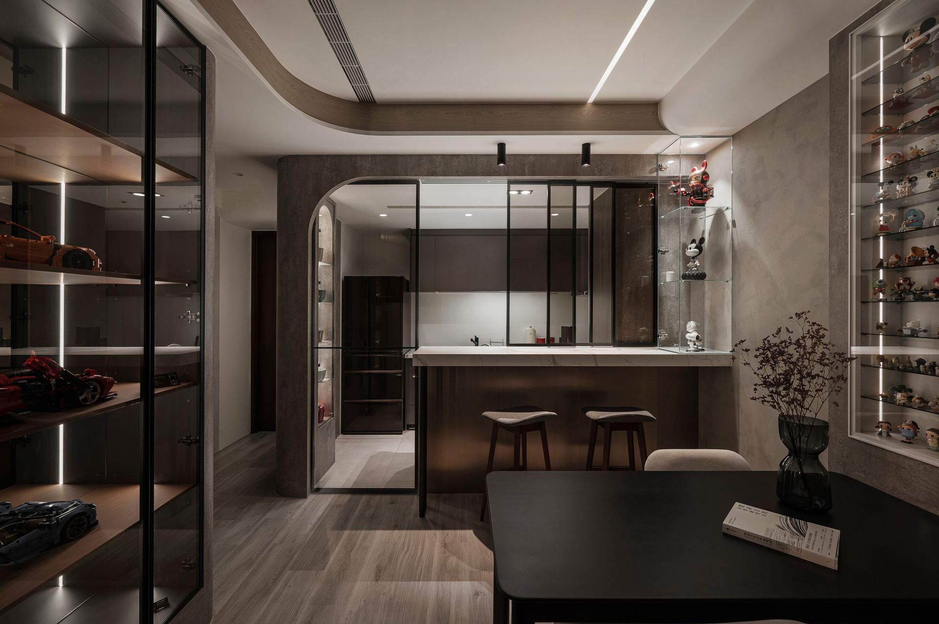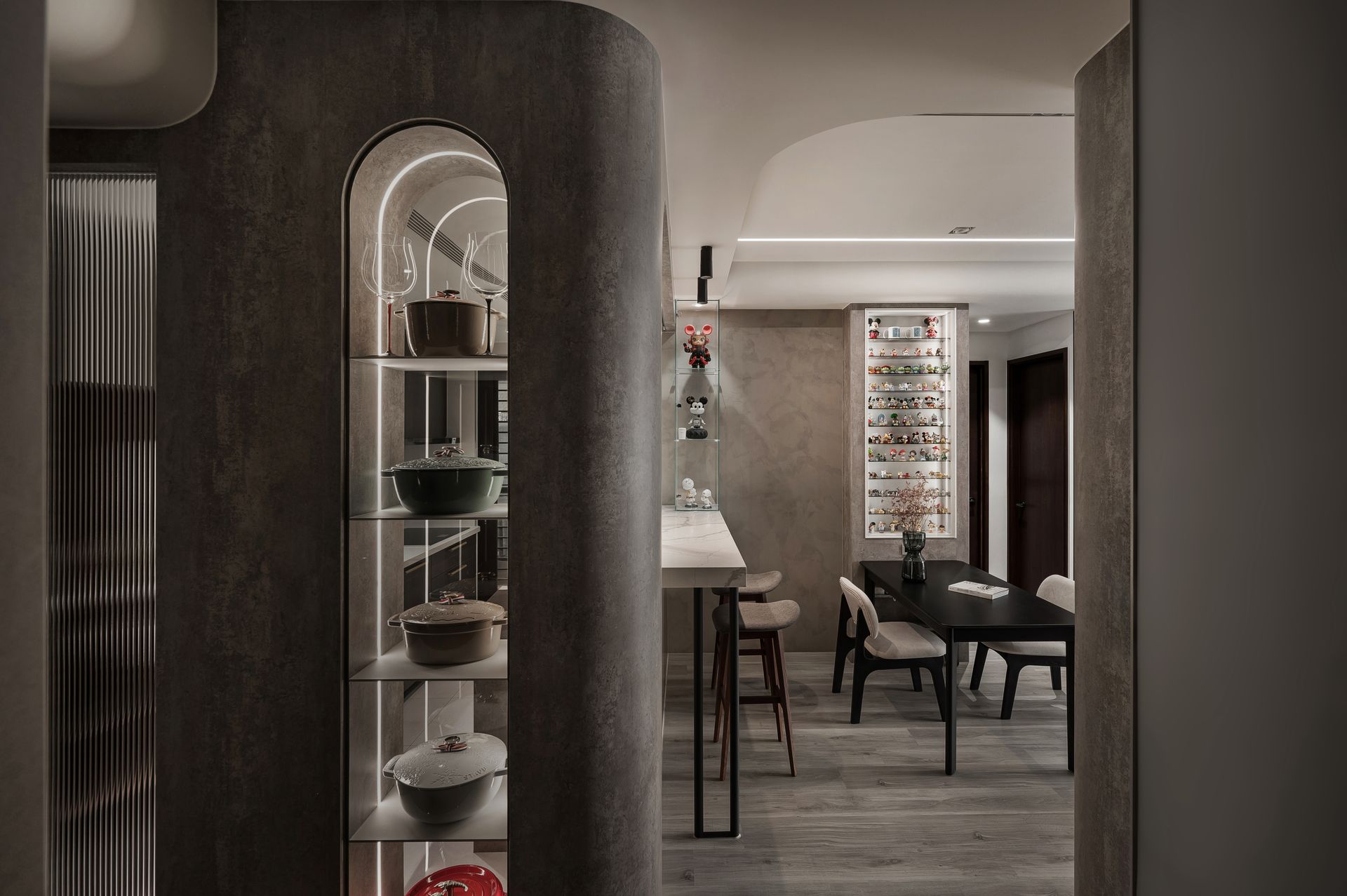 餐廳中,木製餐桌與薄型收納展示櫃相得益彰,展示櫃上擺放著珍貴展示品,下方則收納餐具與調味料,充滿了家的溫馨與藝術感。