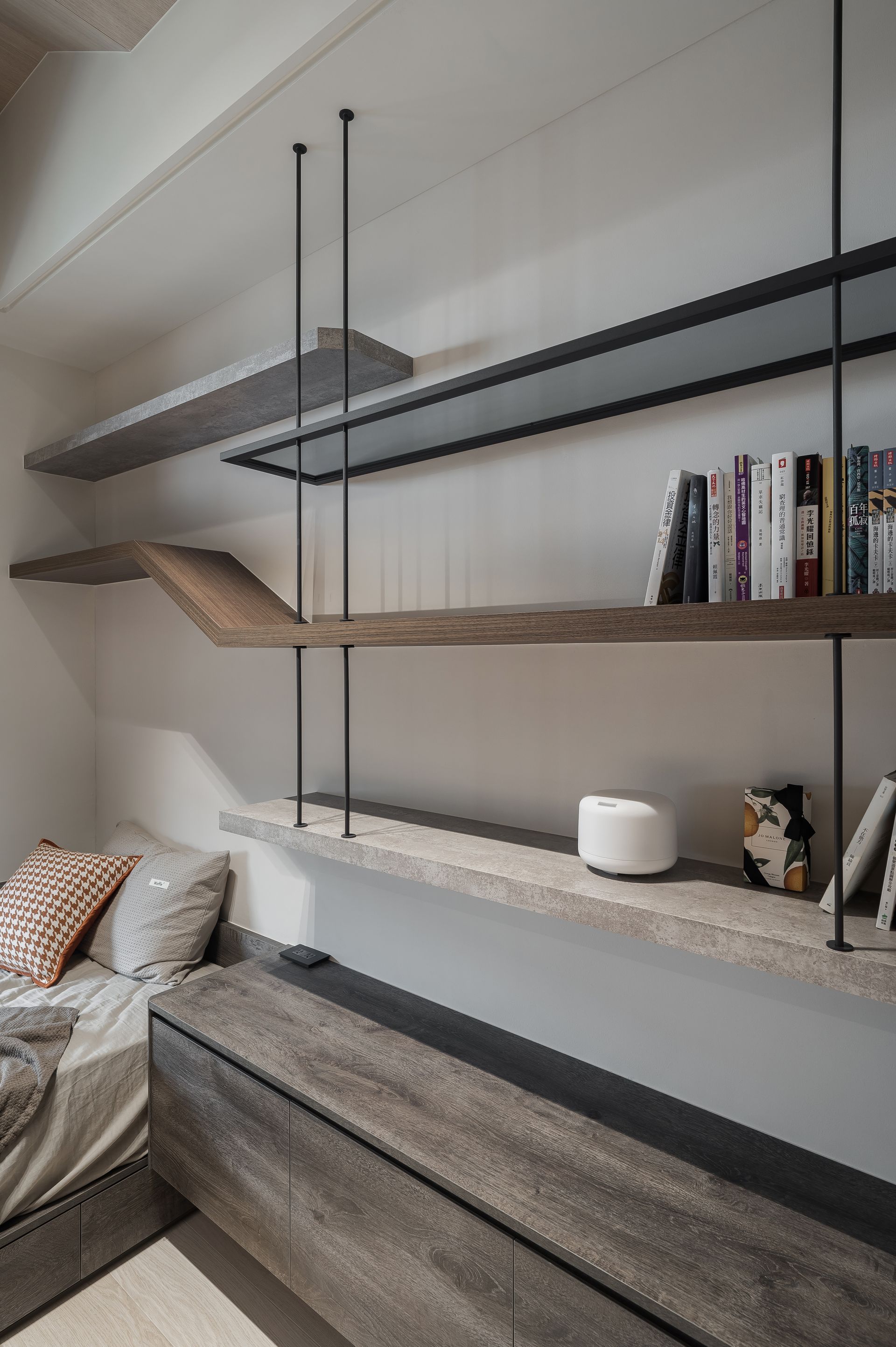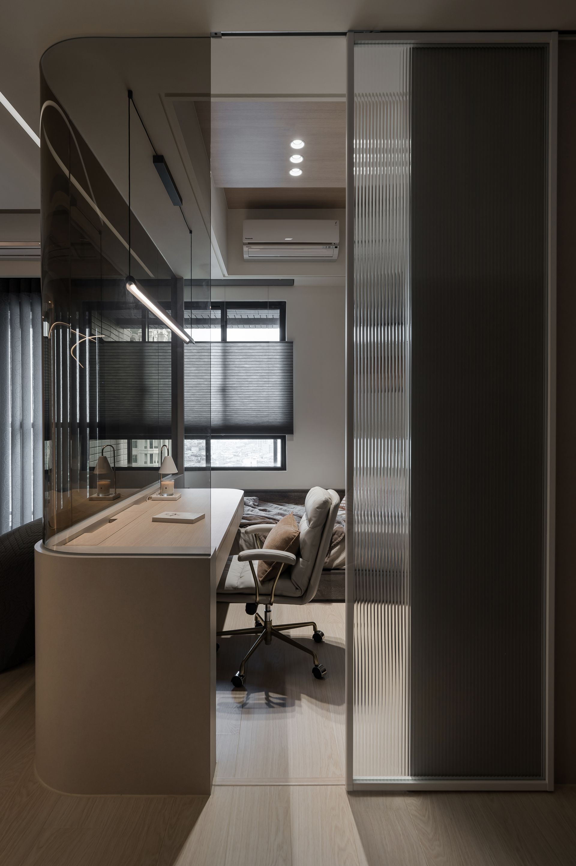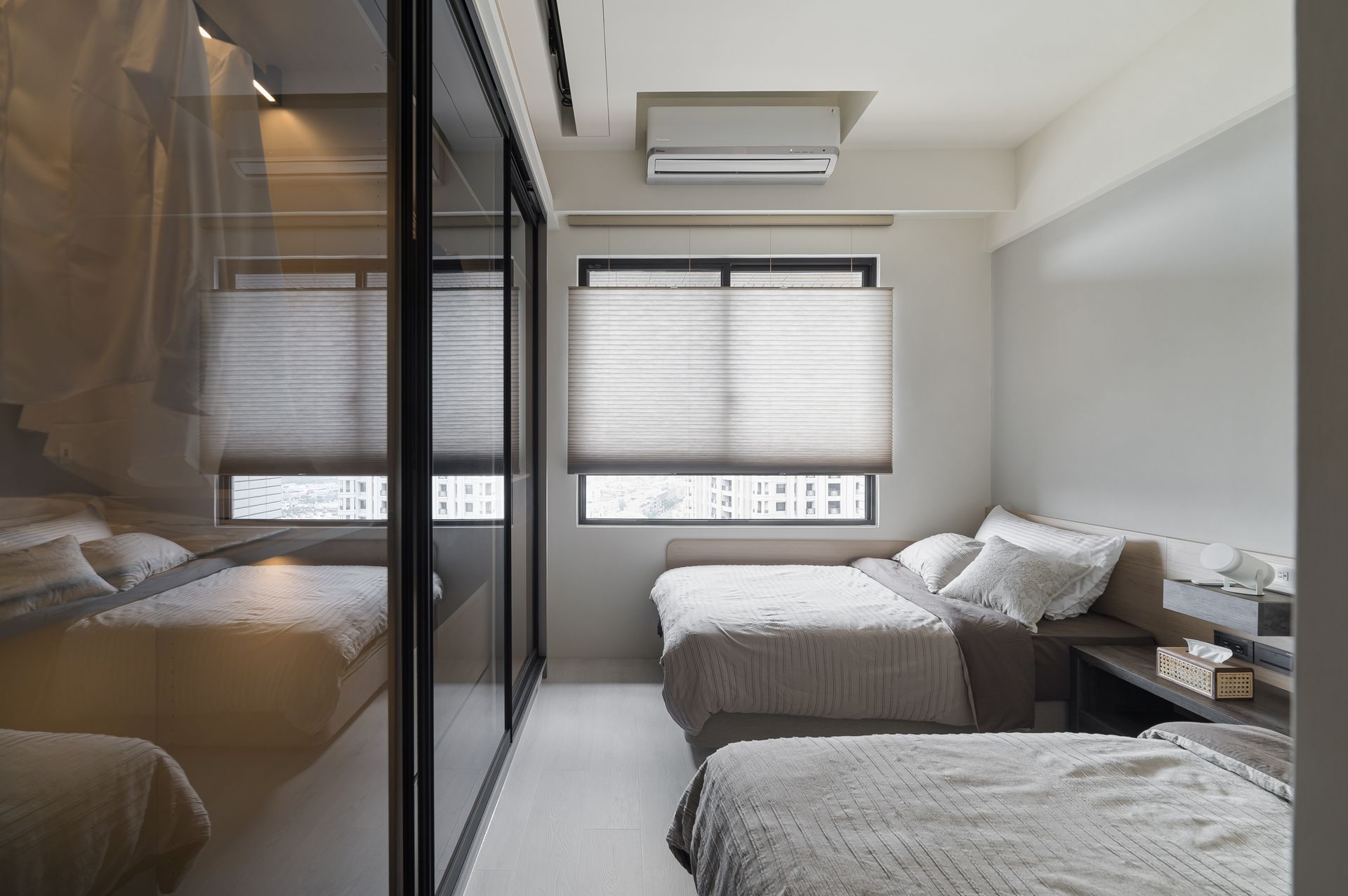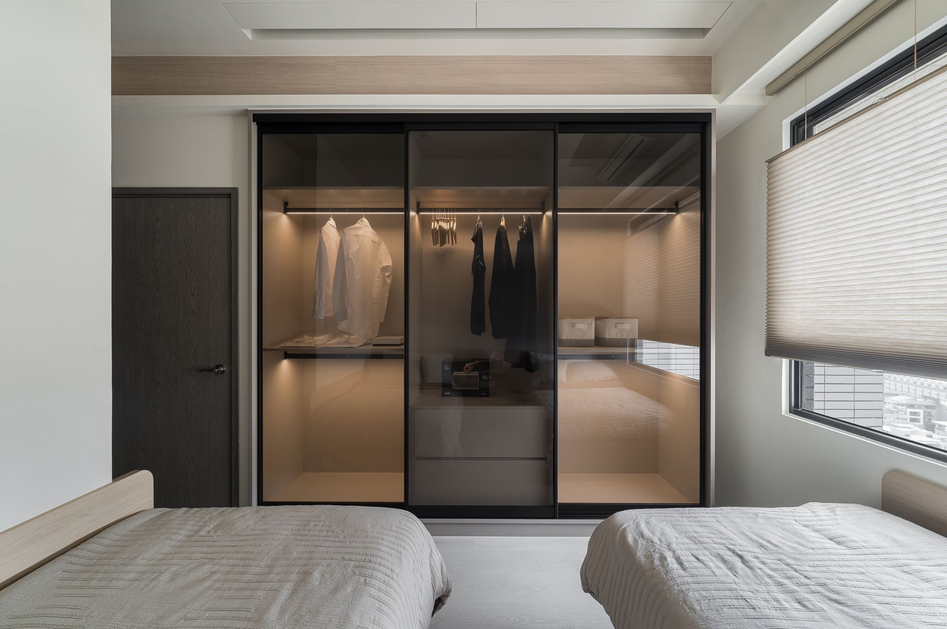 依男女主人因起居時間上的不同,雙床的設計讓各自都能自在與安穩進入夢鄉,周末的睡前追劇時光,可放下玻璃衣櫃前的電動投影布幕,開啟床頭的投影機,輕鬆進入影音世界放鬆追劇。