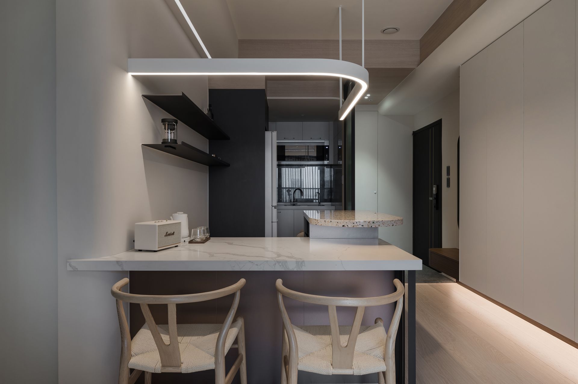 品味著另一種生活體驗,以不同高低差的中島分隔,有時能若坐或站於吧檯椅,悠閒的啜飲手沖咖啡,另一端能夠坐著經典餐椅,品嘗餐點或閱讀書籍,中島另一面下方有著大量收納,與各式大小廚房電器設備,屏蔽住視覺上雜亂。在家不再只是圍繞在客廳沙發活動,中島區也成為其中一環,補充著生活所需能量來源。