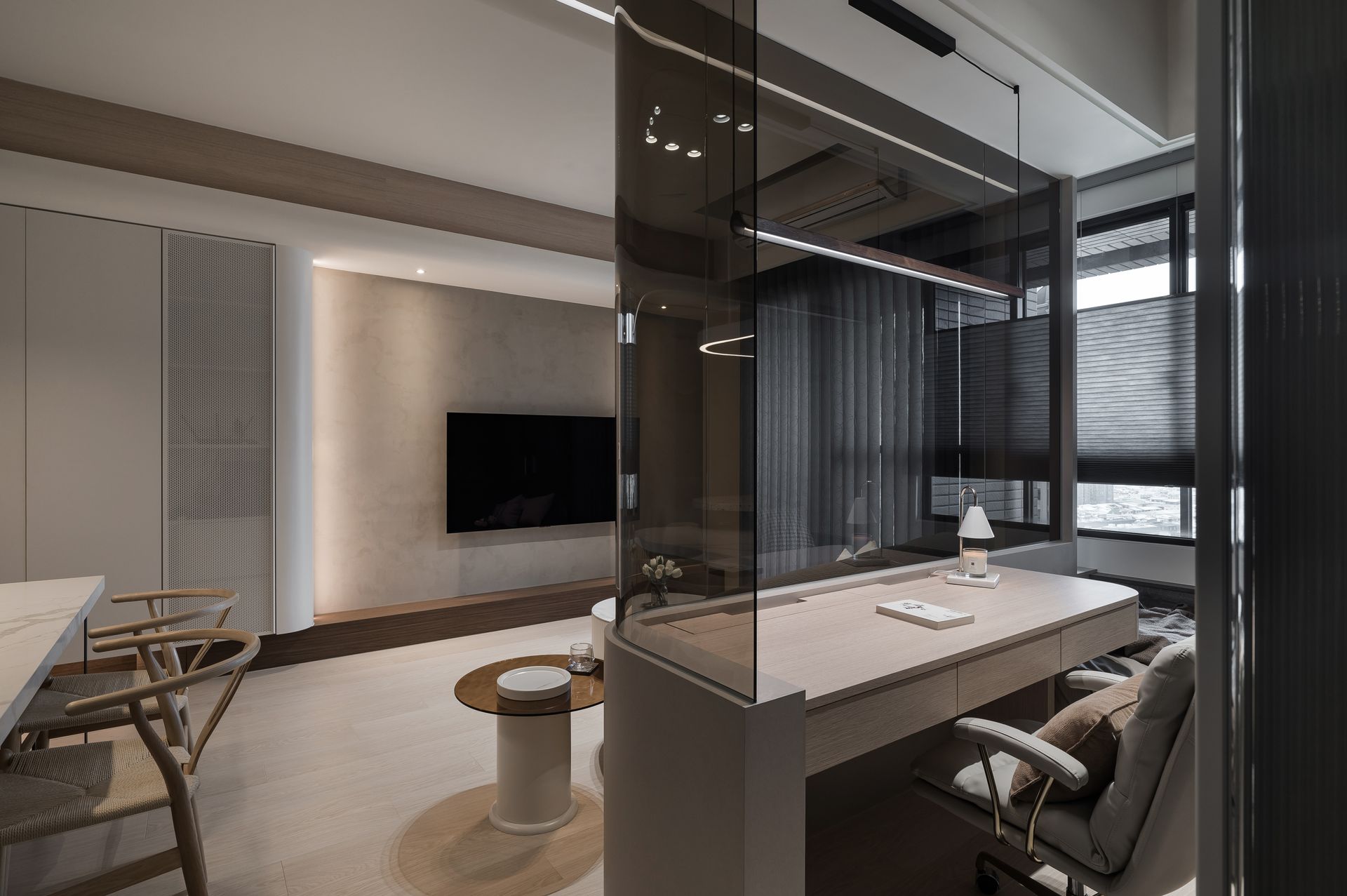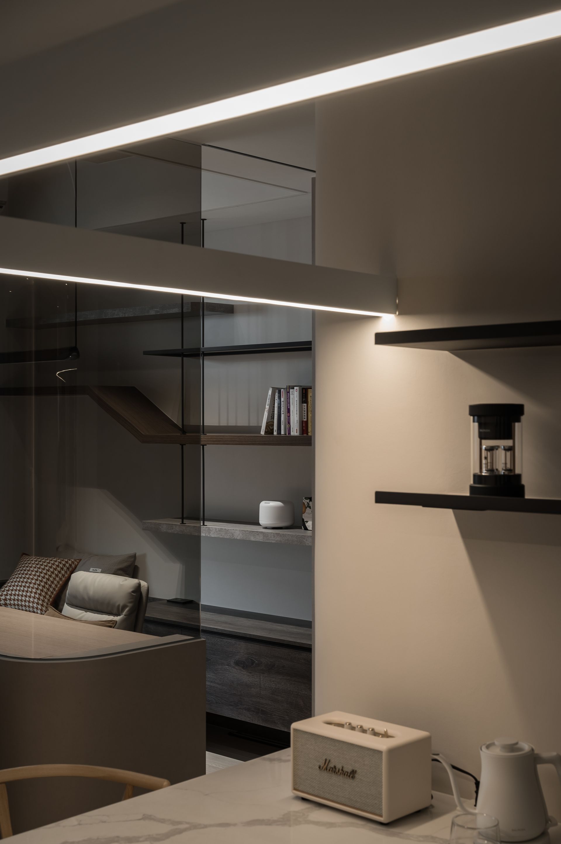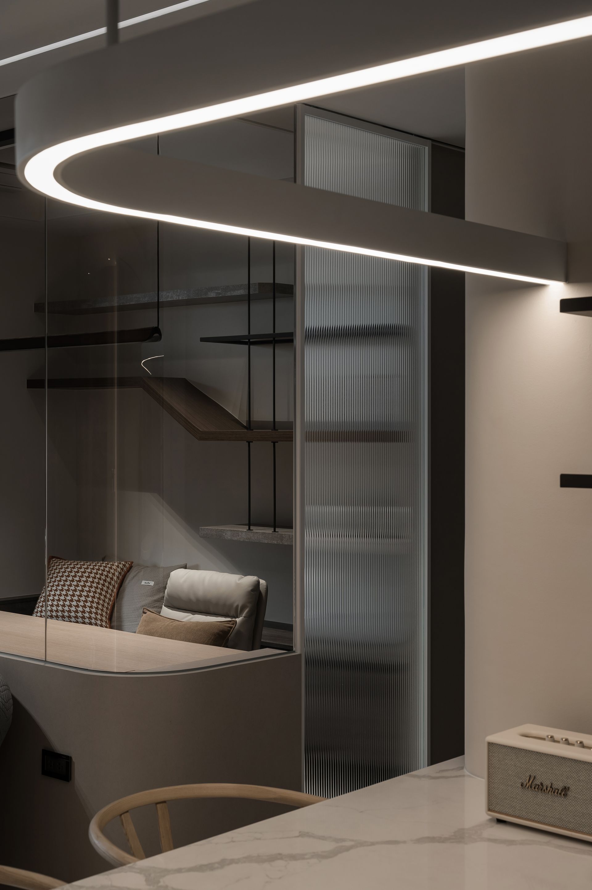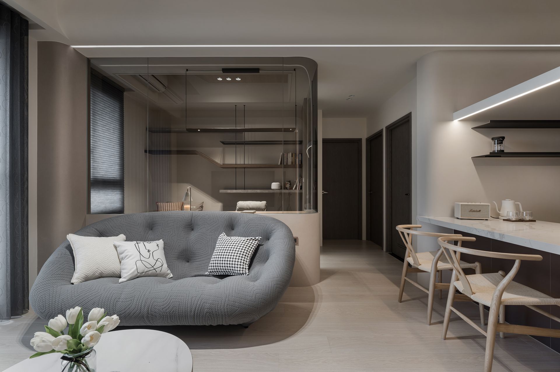 以弧形玻璃區隔出起居空間與書房,在書房裡有休閒臥榻,也有能專心工作弧形桌面,雖室內空間不大,透過以玻璃手法,讓視野放大,木作造型書架搭配細緻的鐵件,放著屋主收藏精心擺設與藏書,擁有獨處又觸碰心靈的私人空間。