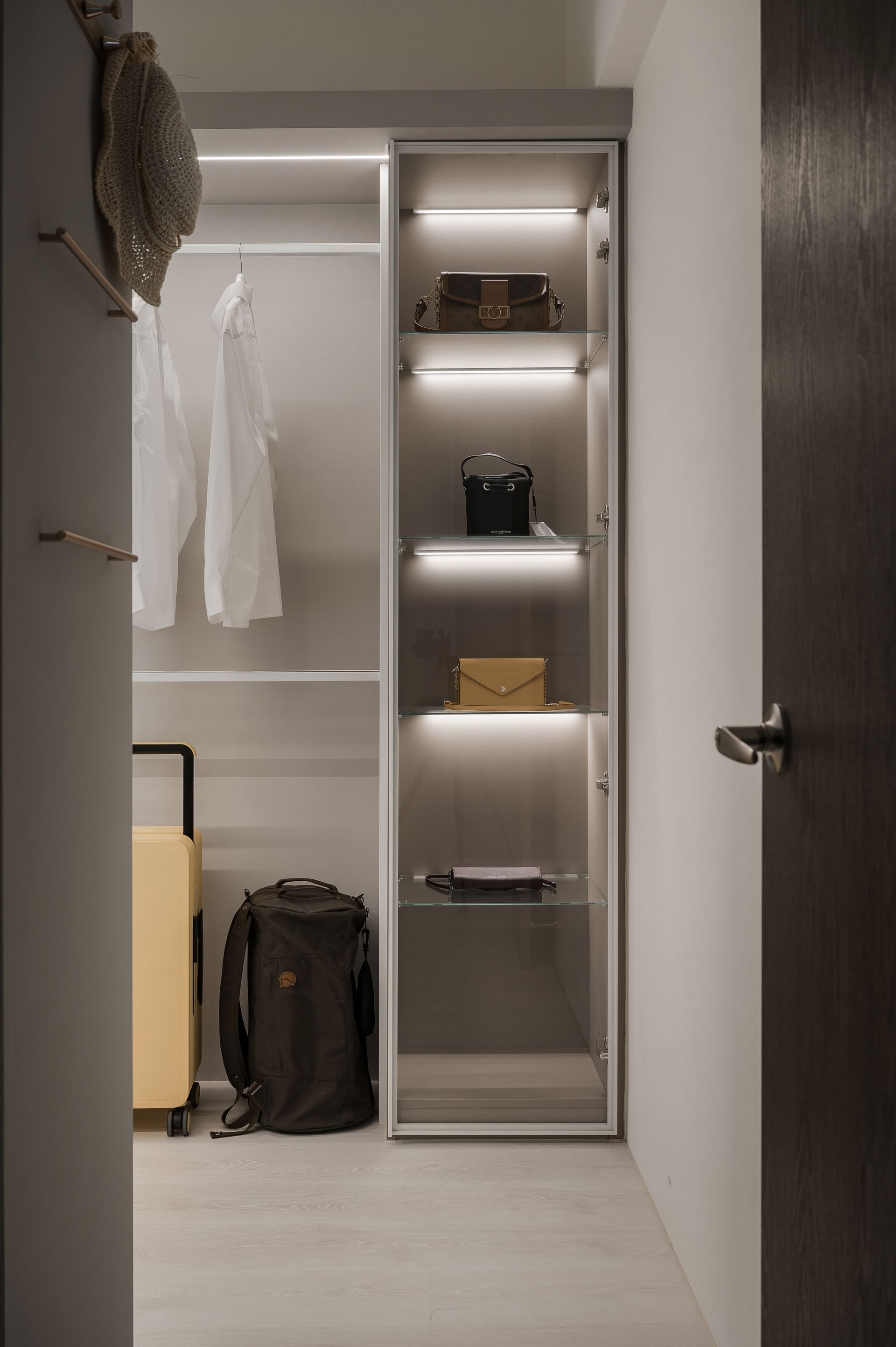 獨立屬於女主人的私密空間,經典包的收藏,各式衣著的陳列,大型梳妝台與可推拉的化妝鏡,企圖能讓女主人在這空間無論梳粧或保養都能有舒適與放鬆的感受,衣物與包包的收納不只是收藏,也能變成視覺上的欣賞,讓每日精心搭配的穿著都能盡情揮灑。