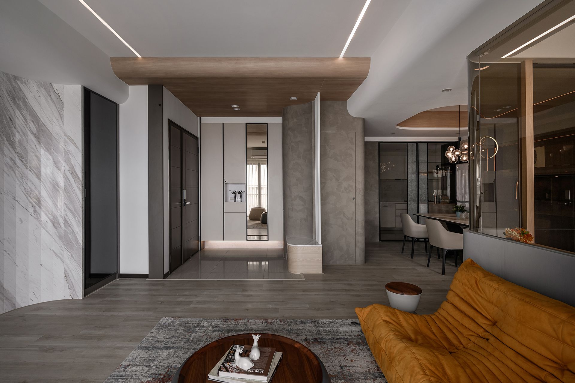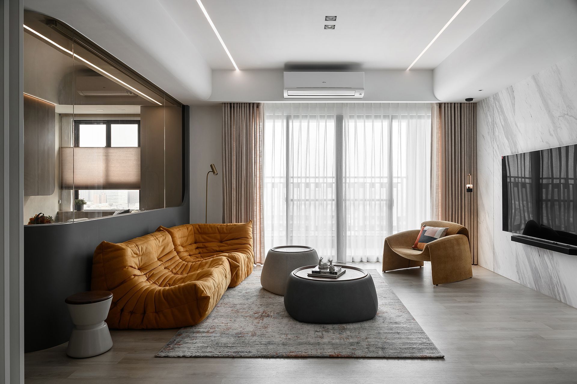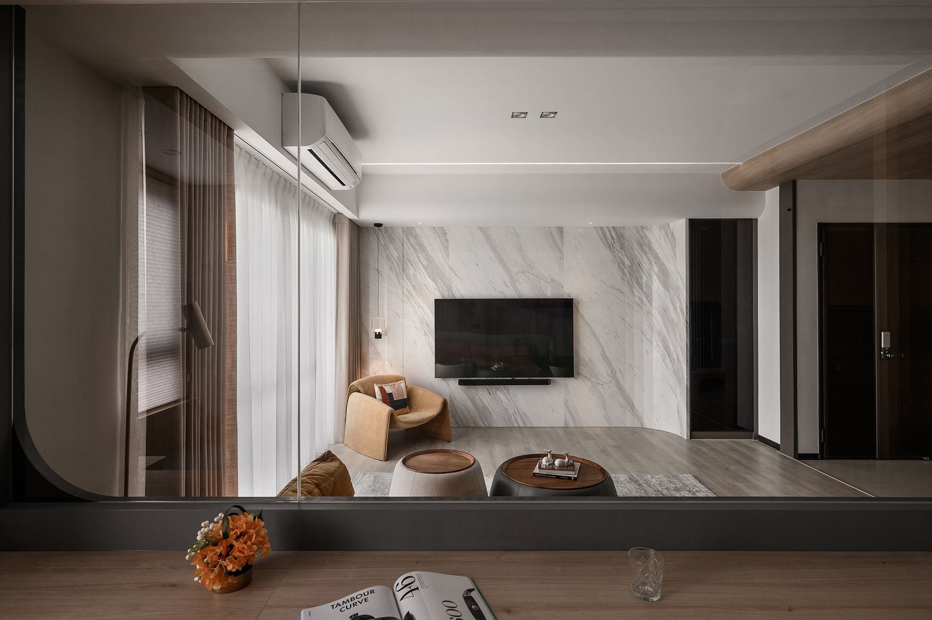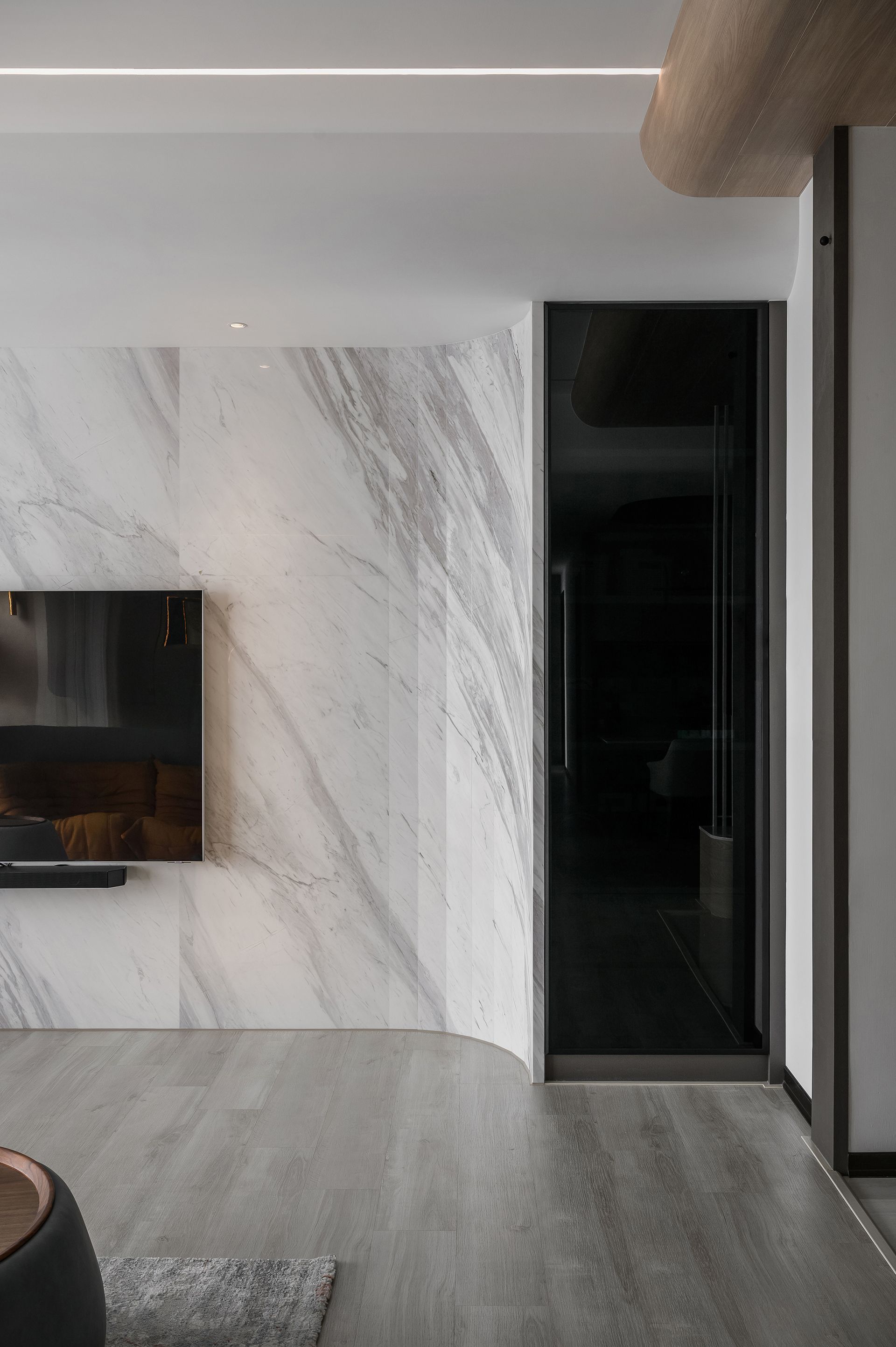 大面積的天然石銀狐作為中心主牆,將原本生硬直角的石材以難度更高的弧形收邊打磨,延伸主牆氣勢,營造空間放大感。為了減少生活上的雜亂感,將視聽設備收納在邊緣的黑色玻璃櫃,不但可大量收納視聽設備,也能降低打掃力度。