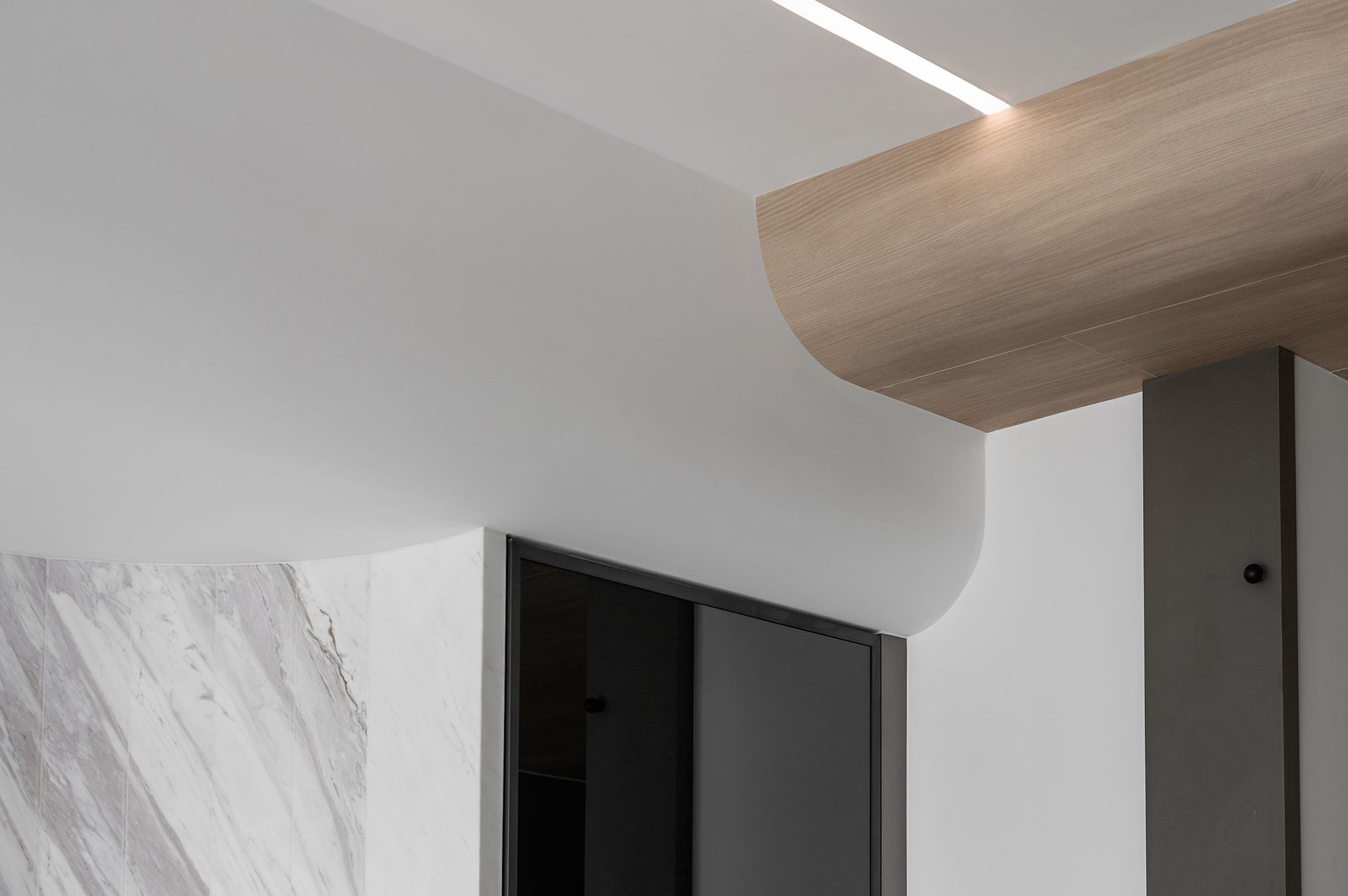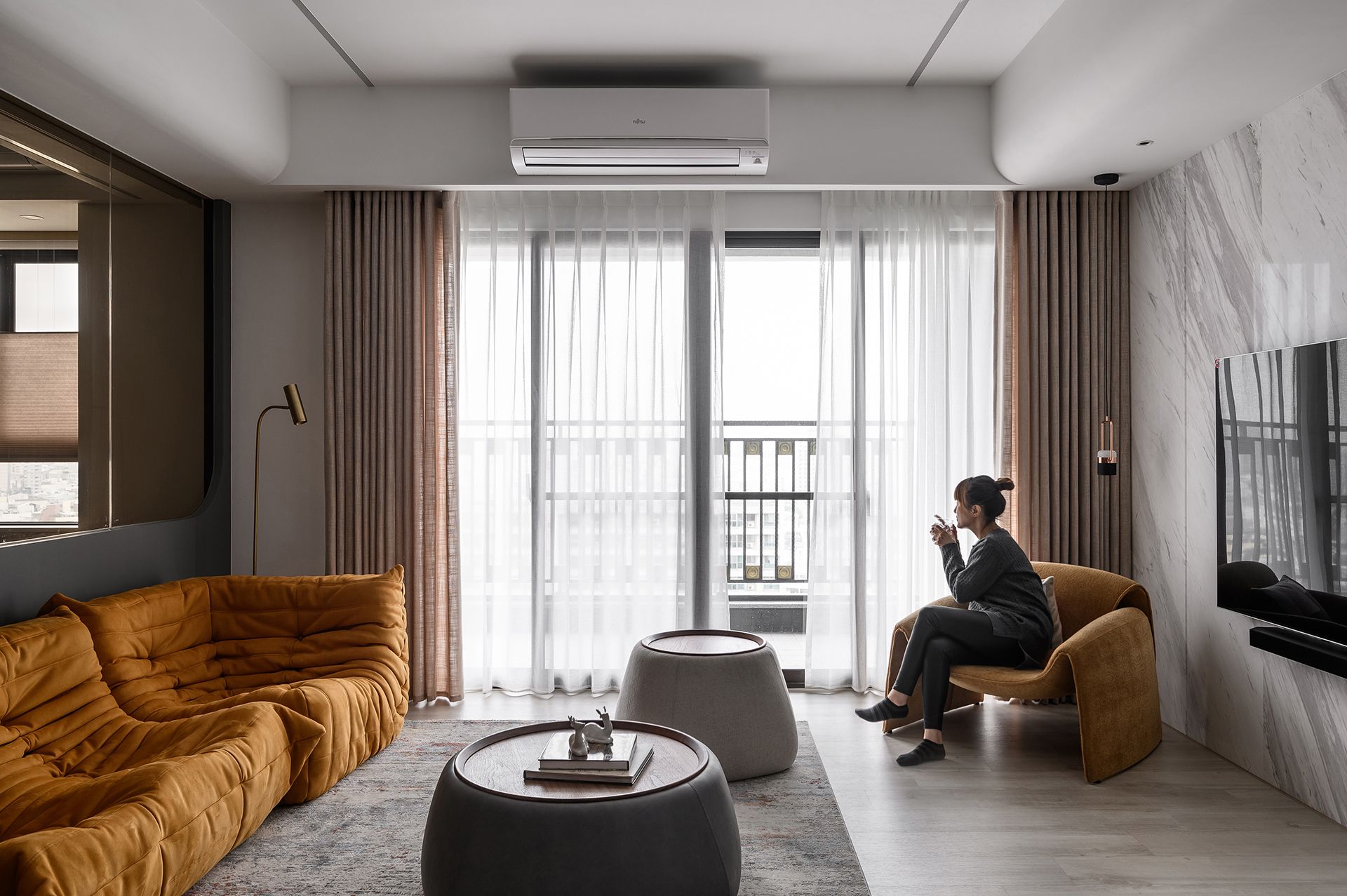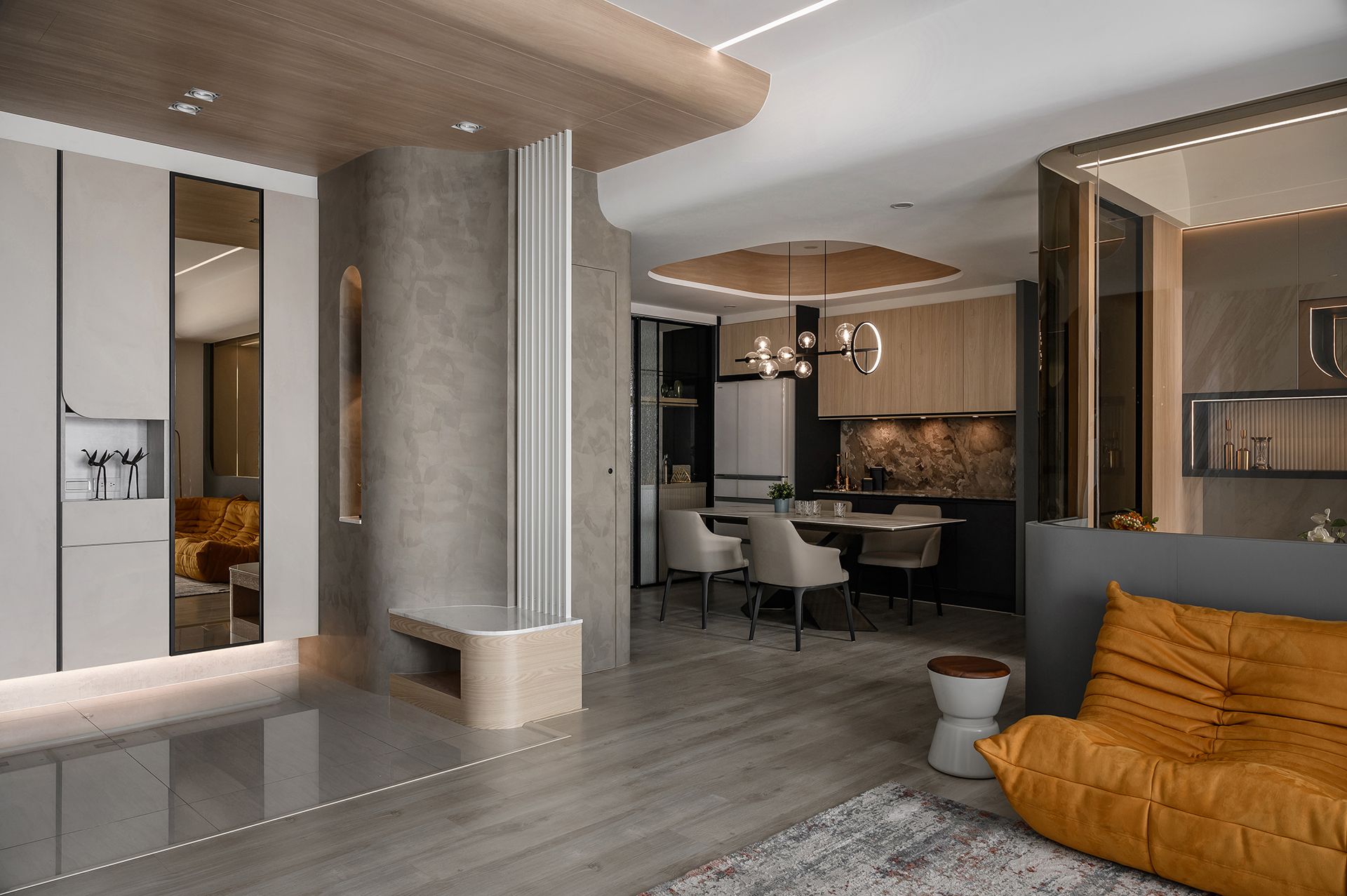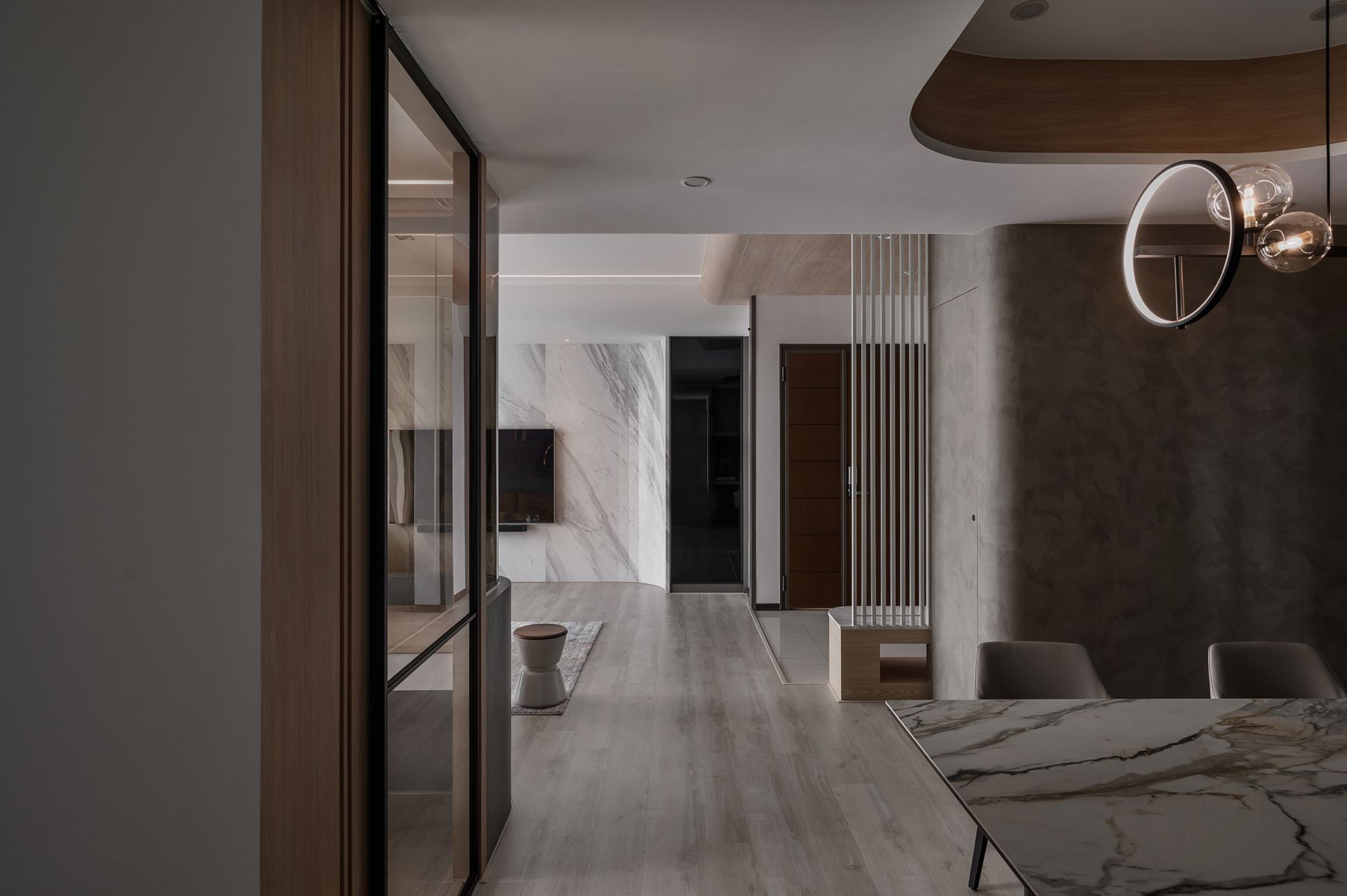 大面積的天然石銀狐作為中心主牆,將原本生硬直角的石材以難度更高的弧形收邊打磨,延伸主牆氣勢,營造空間放大感。為了減少生活上的雜亂感,將視聽設備收納在邊緣的黑色玻璃櫃,不但可大量收納視聽設備,也能降低打掃力度。