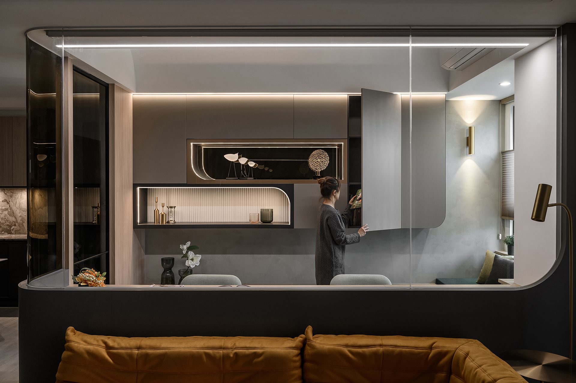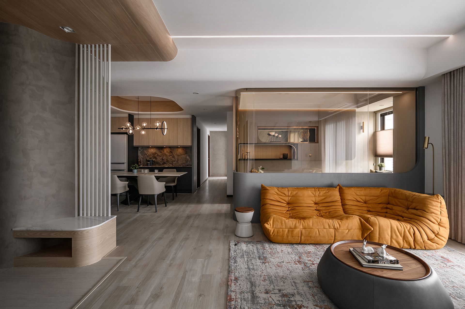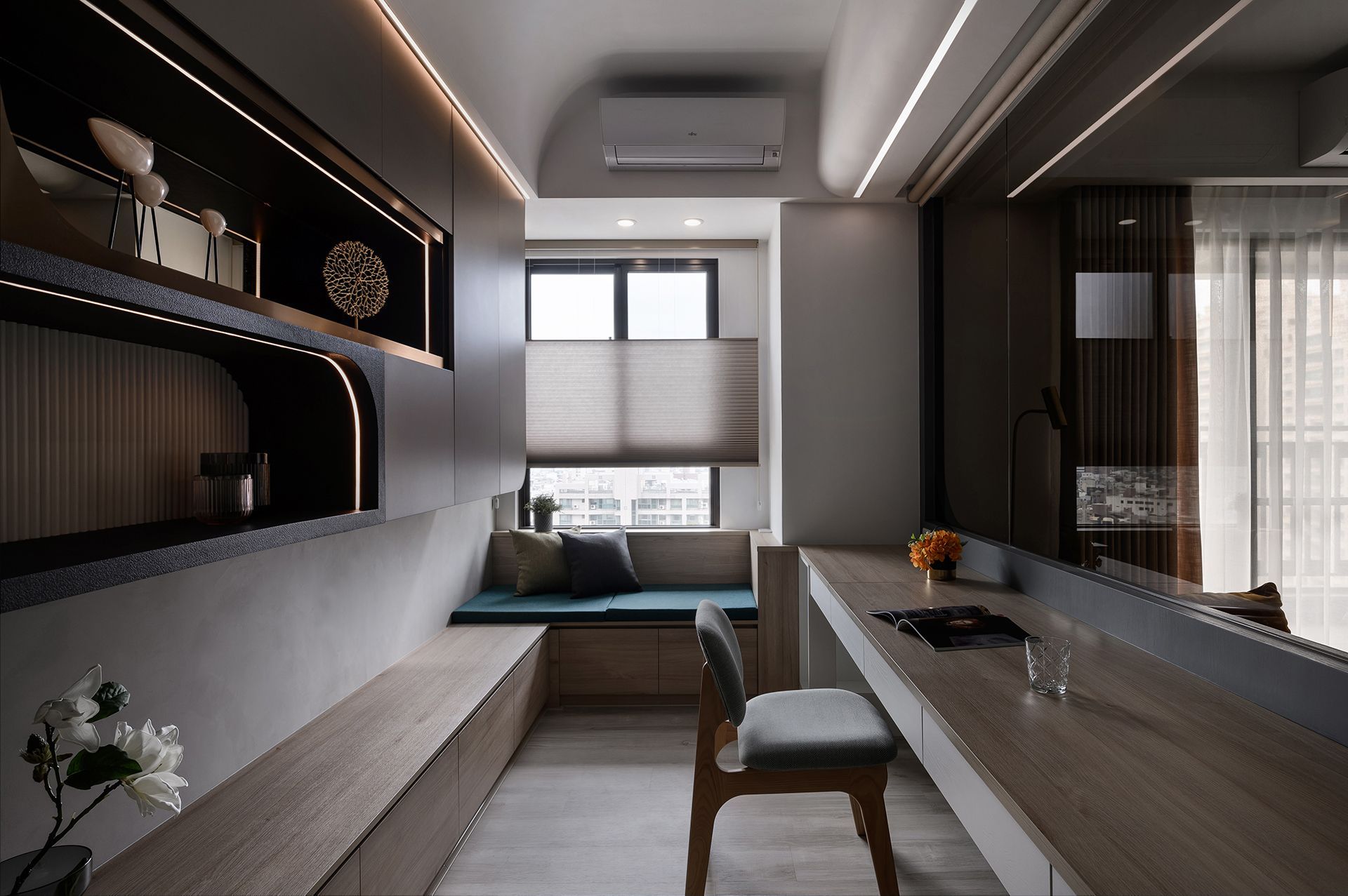 使用圓弧邊角的透明玻璃,讓客廳和書房在視覺上具有穿透性,從客廳即可看到訂製鈦金屬與半圓形的環保材質造型板組合的展示櫃,放置主人的精心收藏,灰色、金色、黑色融合交織出高雅質感。拉下窗簾後,書房可以是男主人享受一本好書、一杯好茶的安靜密室;也可以是一家人相處的溫馨角落,看太太、孩子坐在臥榻,開心分享白天時發生的趣事。