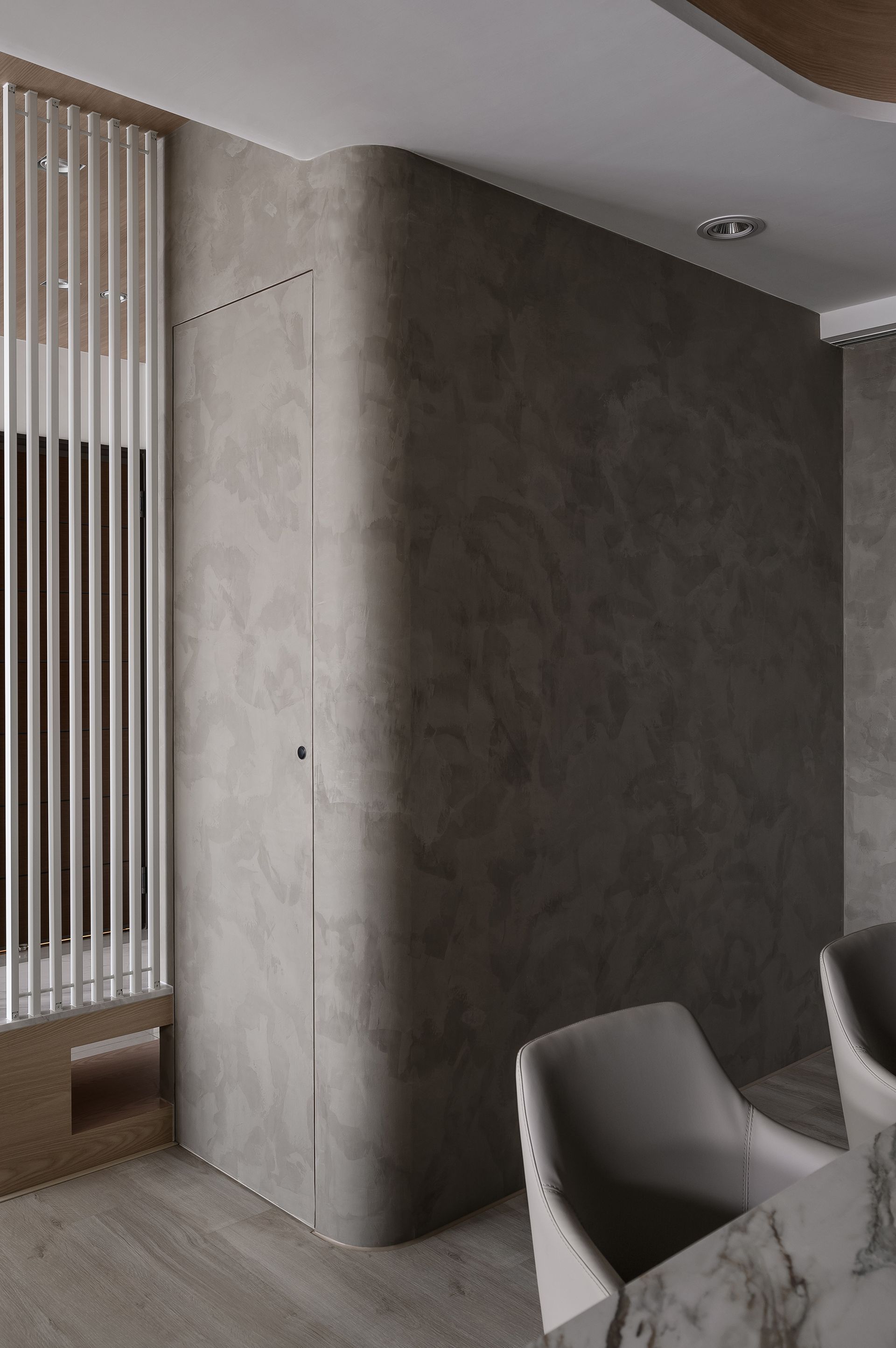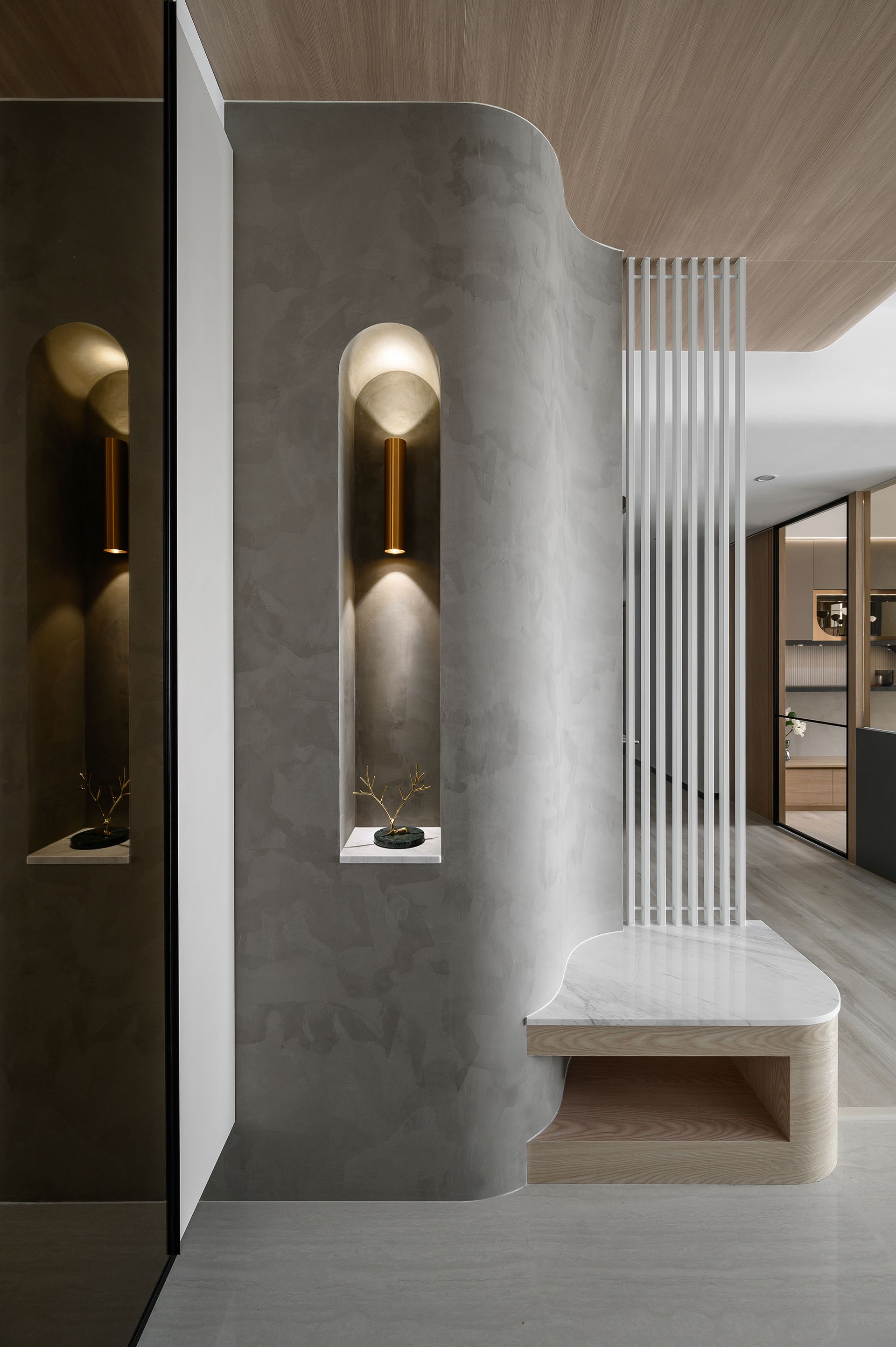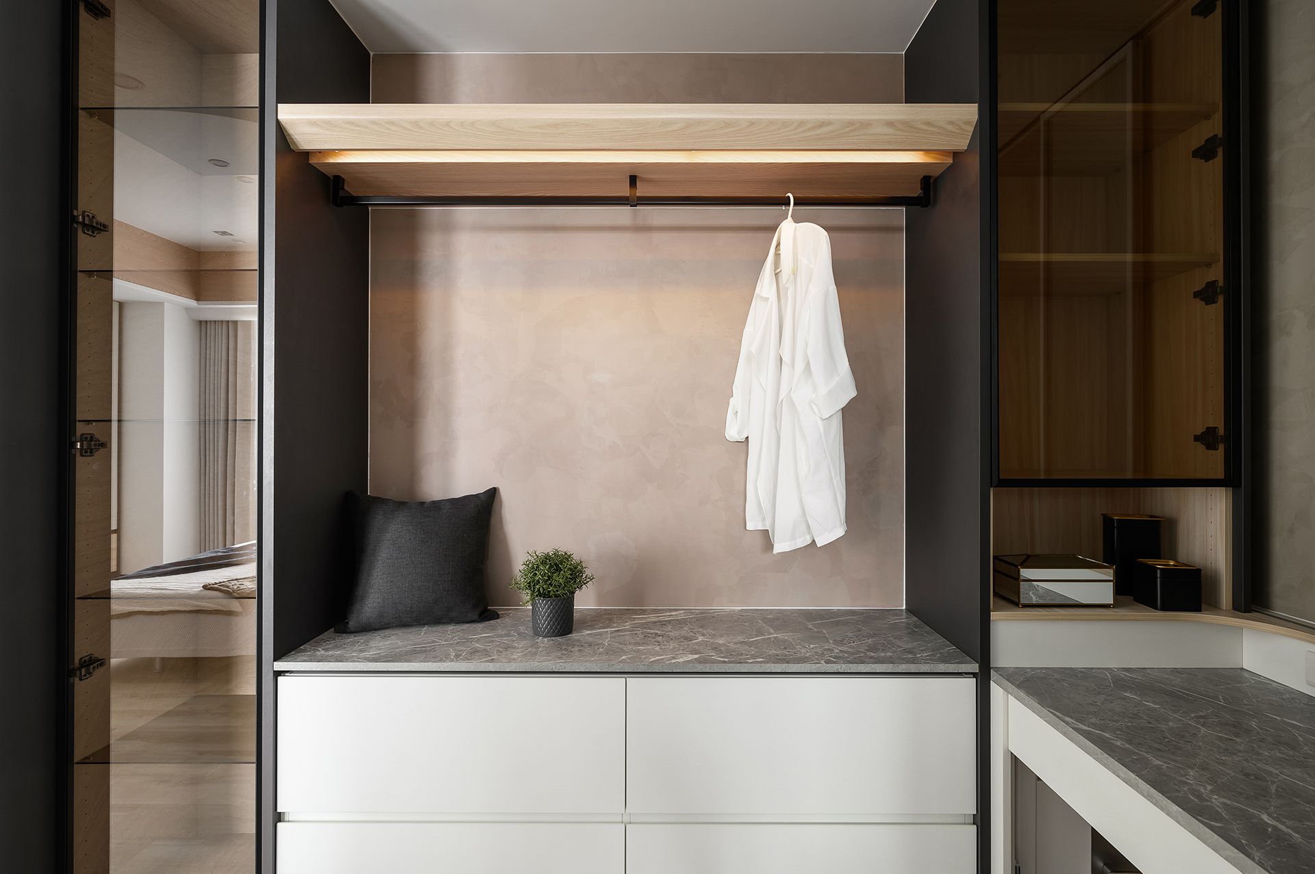 玄關清楚區隔了落塵區和非落塵區,轉換內外空間。天然石銀狐妝點的穿鞋椅,呼應了客廳主牆的材質。以手工塗料粉刷、具有洞穴感的屏風,背面其實是大型儲藏室,可收納大型行李箱、生活用品、衣物整理箱甚至是鋁梯。既有實用功能,又不會縮小整體空間。
