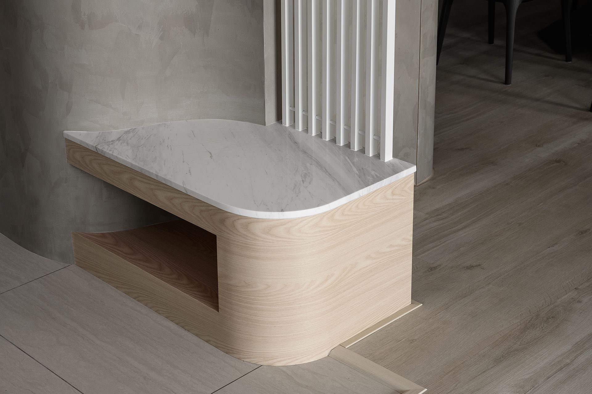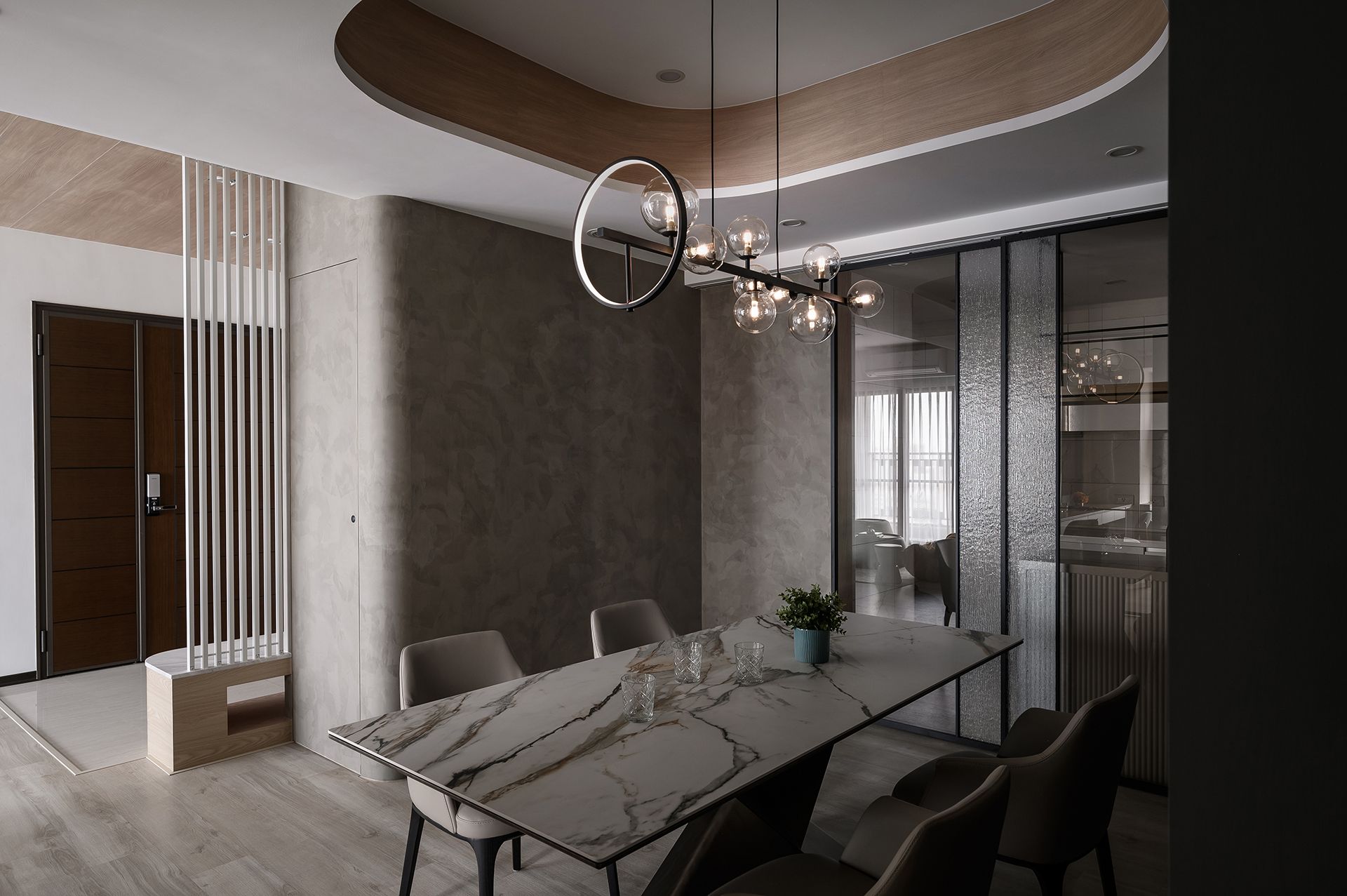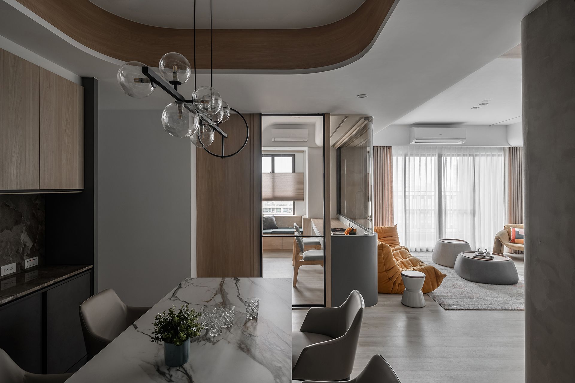 隱藏的廚房拉門隨時隔絕做菜時產生的油煙,廚房以中島區隔餐廳界線,是家人享受輕食的區域,中島面朝向廚房,增加了可整齊擺放收納家電的電器櫃,巧妙去除了雜亂感,滿足女主人希望能方便整理的需求。餐桌旁增設了茶色大理石的備餐檯,可擺放咖啡機等小家電,使用上更加機動靈活。
