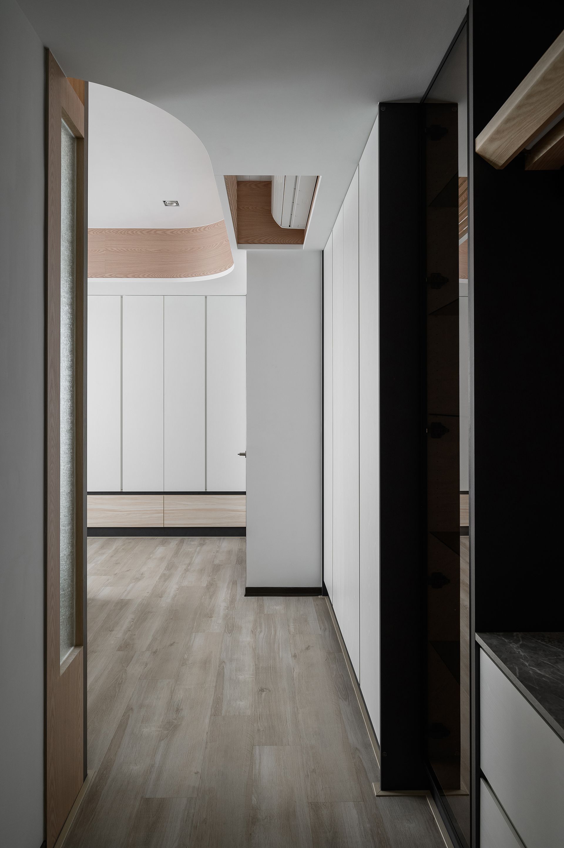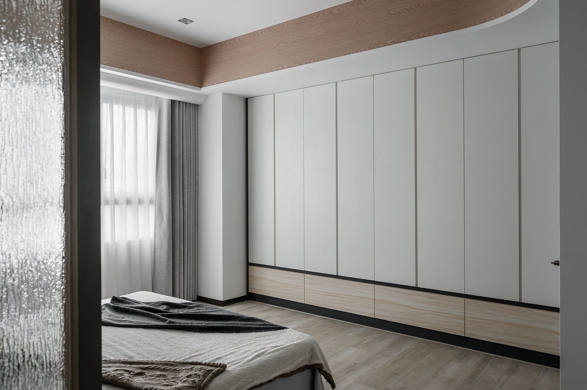 以木質溫潤調性為主軸,營造放鬆愜意的睡眠空間,床頭櫃旁邊以屏風區隔臥室和走道,更有安心感。大型收納衣櫃的容量足夠,即使不用換季也能放入全部衣物。開放式的衣物放置區,下方設有整理衣物、二次衣的平台,方便整理。化妝台使用滑動鏡面,因應女主人使用需求,可左右移動位置。天花板還有半隱藏的冷氣主機格柵設計,視覺上可修飾冷氣存在的不協調感,也可輕鬆拆卸,清潔冷氣更簡便。