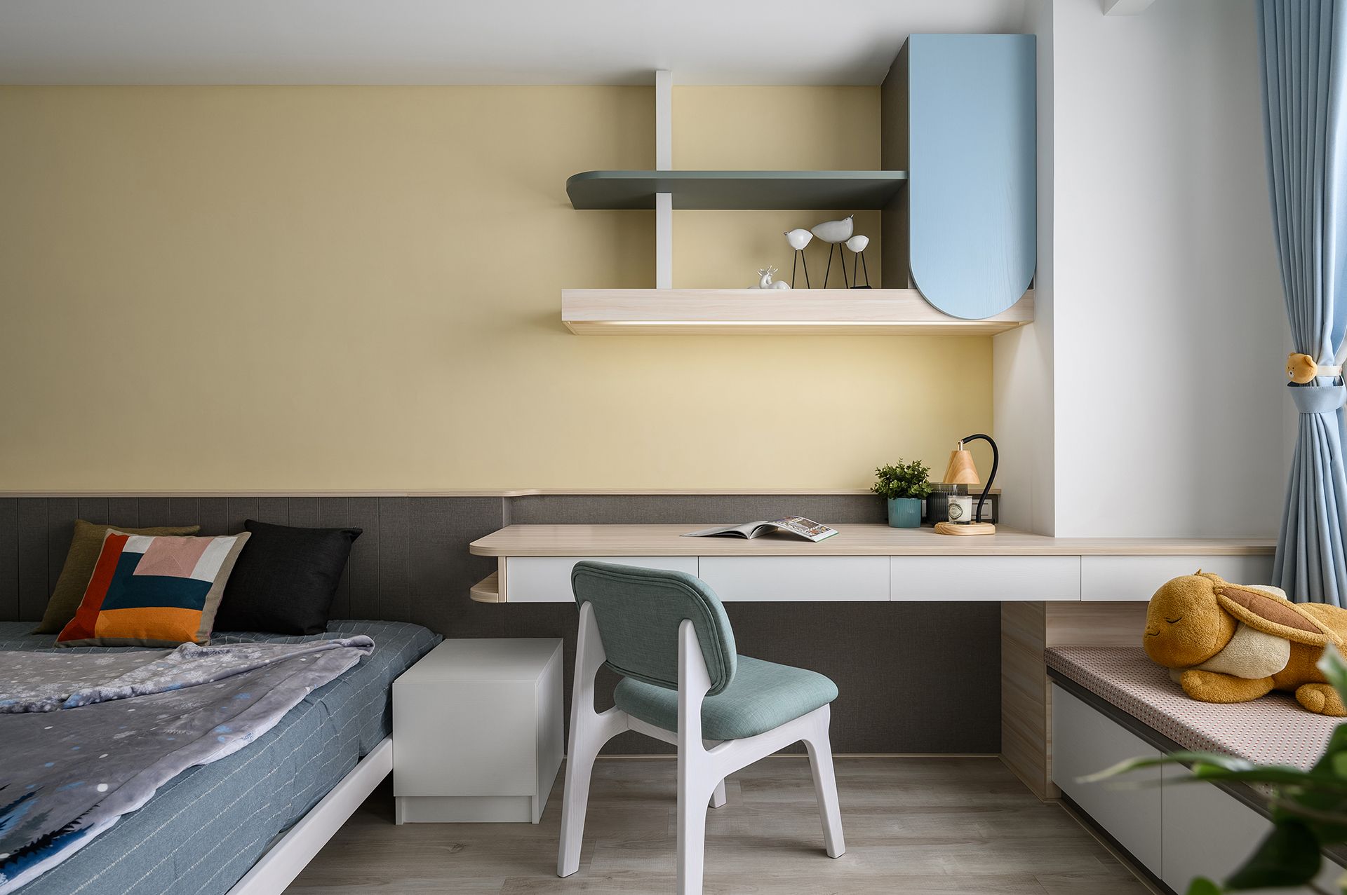 以孩子喜歡的黃色和藍色打造活潑調性,考量到孩子的健康,牆面使用能吸濕、過濾空氣的珪藻漆。窗邊特別安排了爸爸的專屬臥榻,不管是陪小孩做功課、聊天和遊戲,任何時刻都輕鬆自在。
