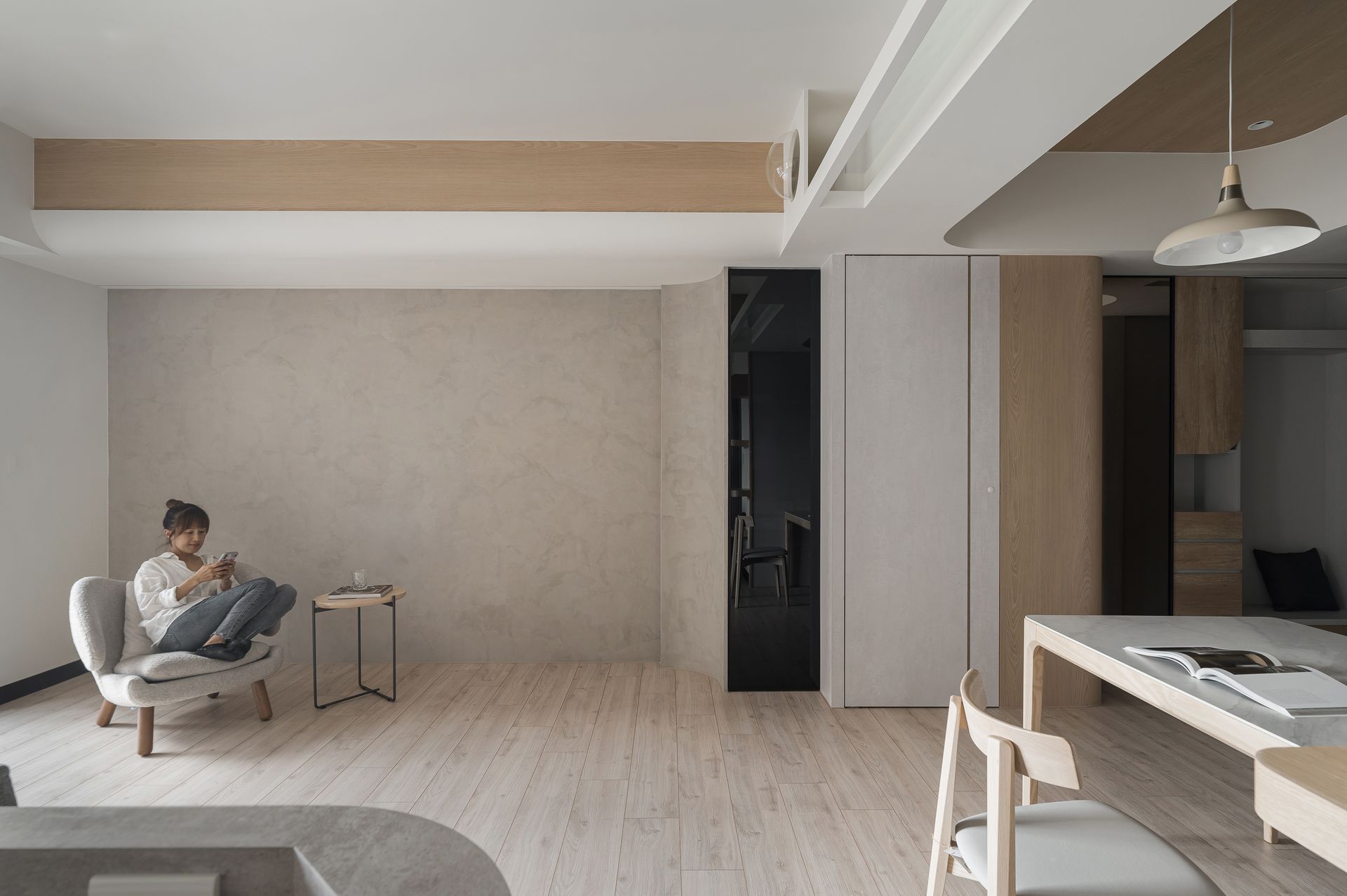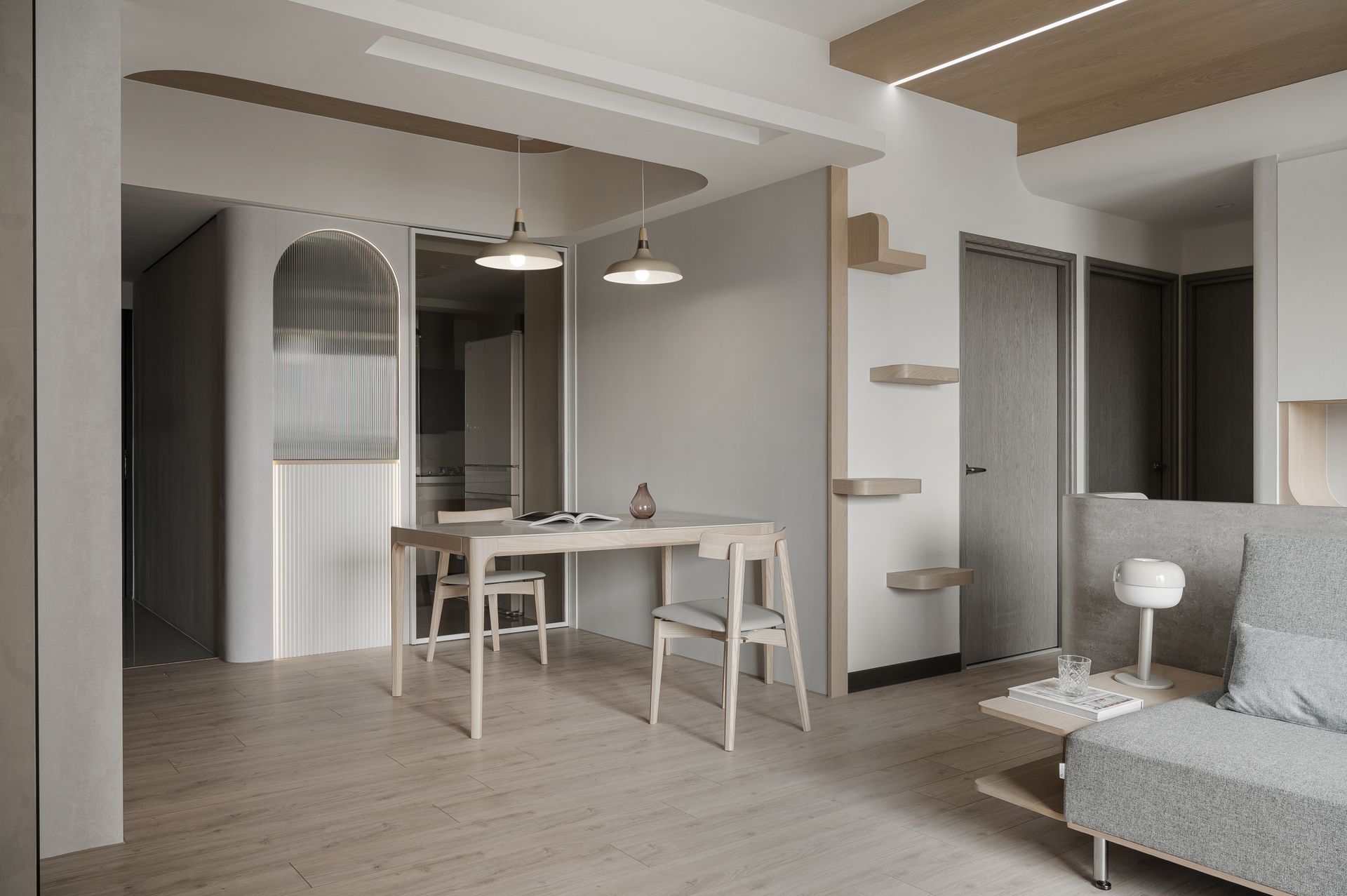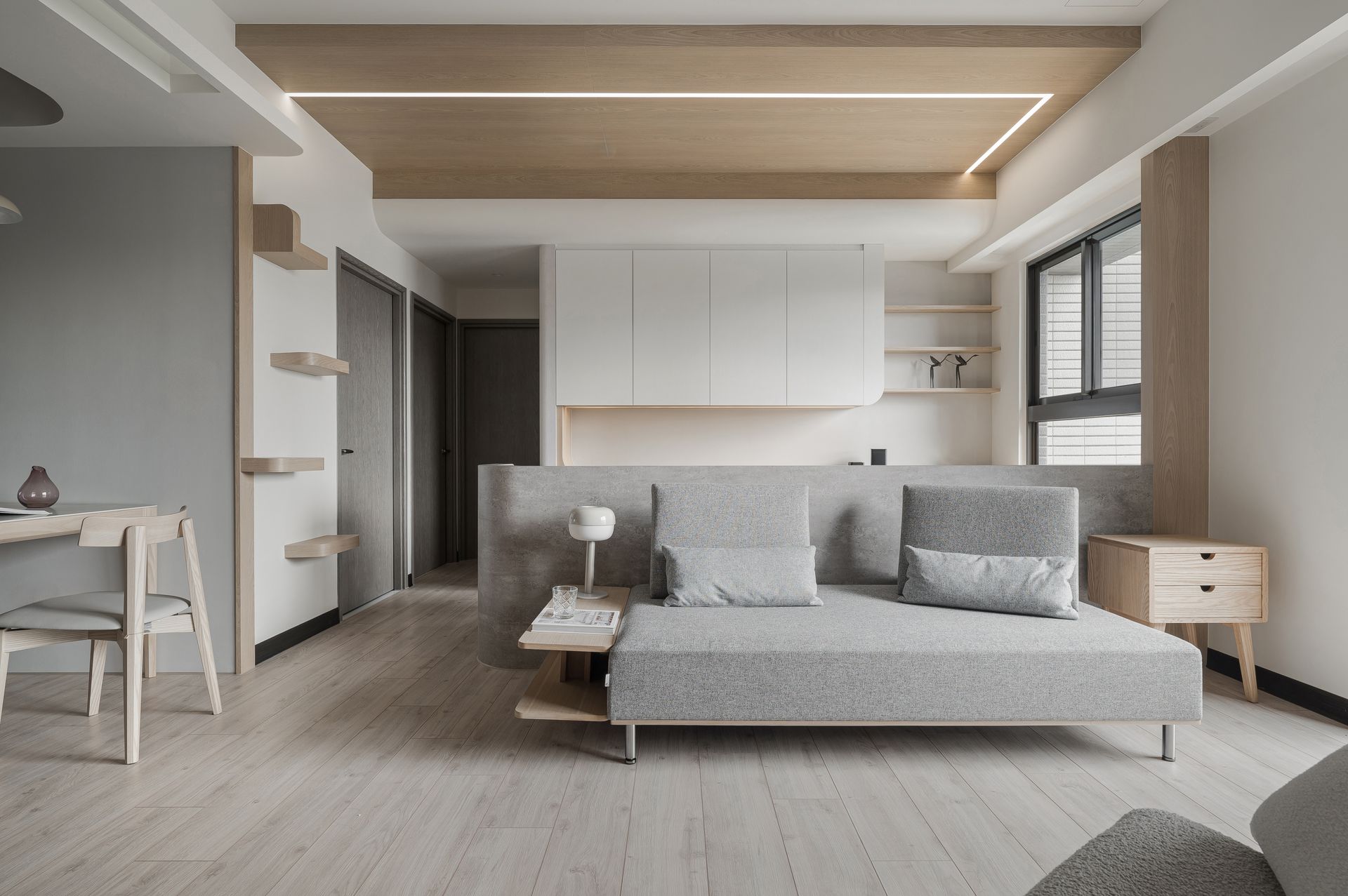 簡約設計鋪陳,奶灰色與木紋質感相融,營造寬敞感。