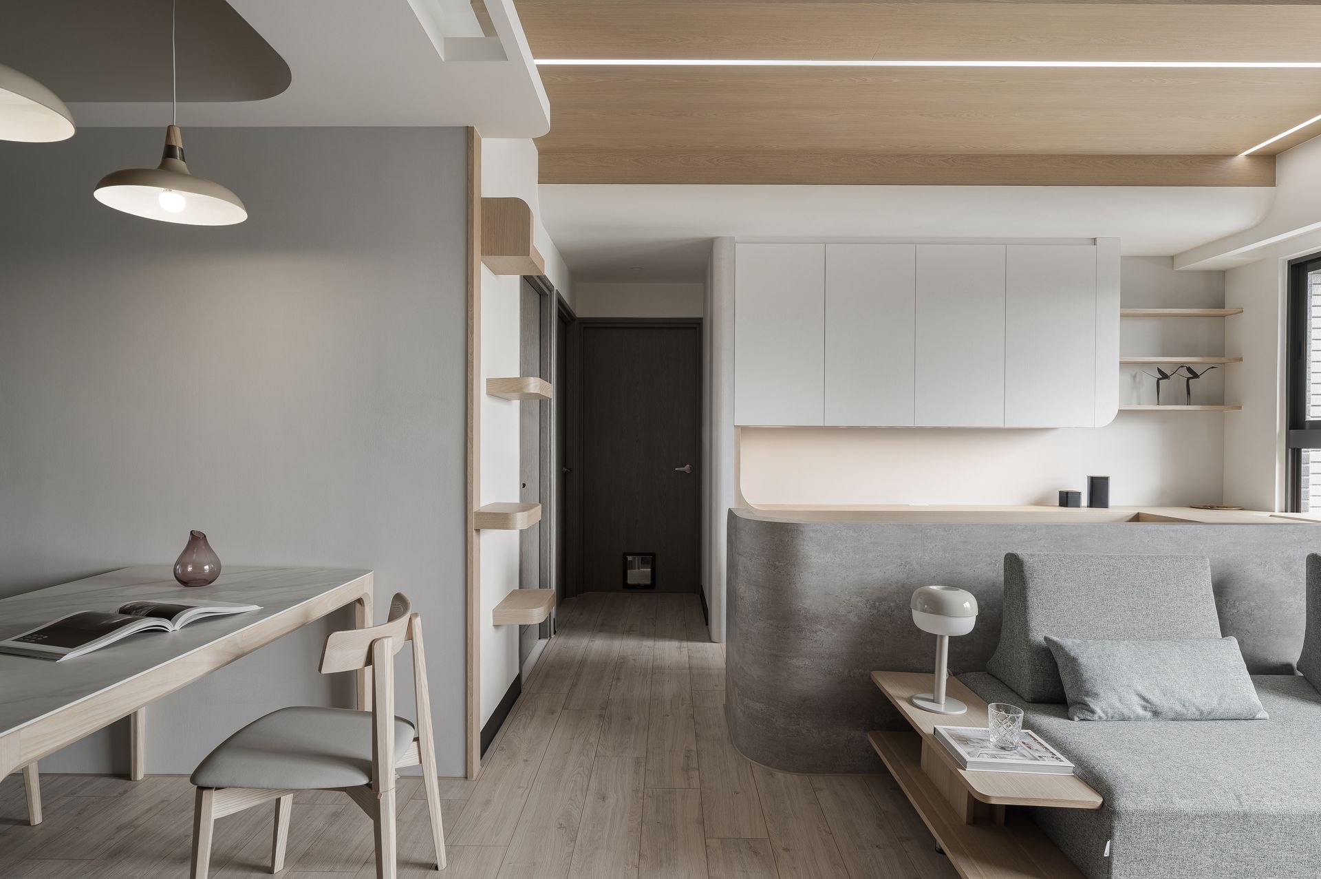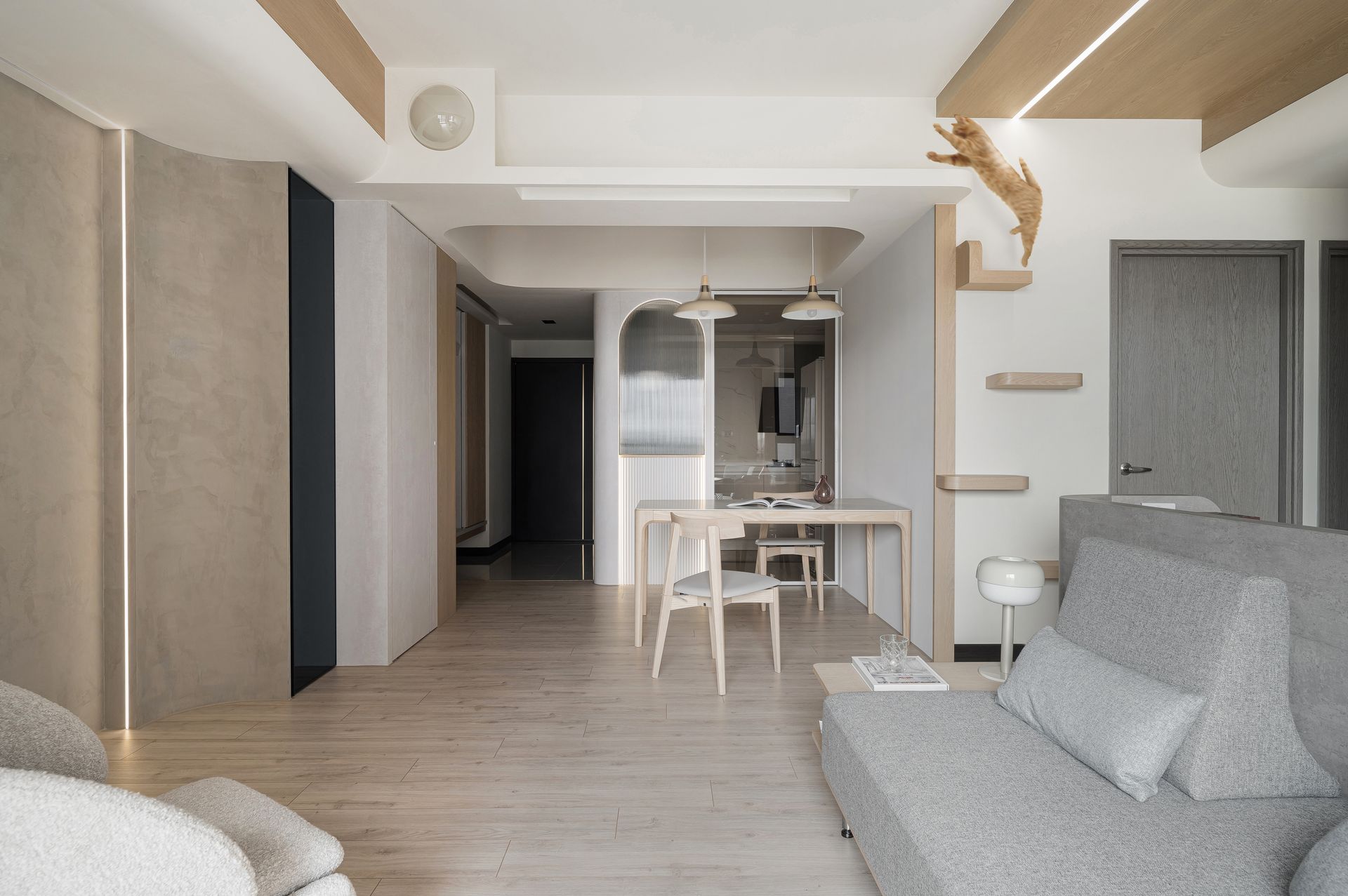 圓弧錯落的天花板造型融合了貓跳板與貓走道,增加垂直空間。