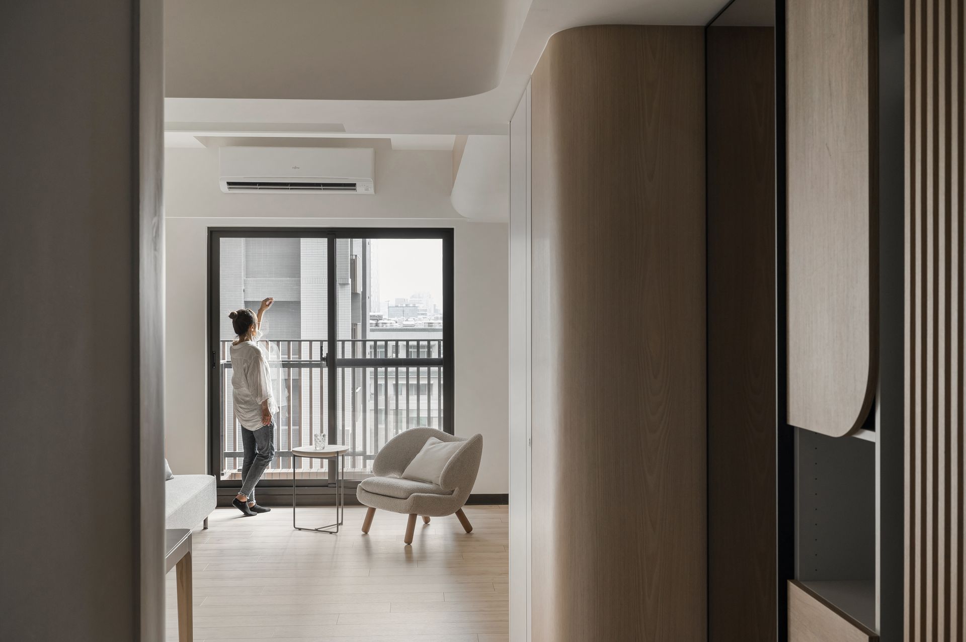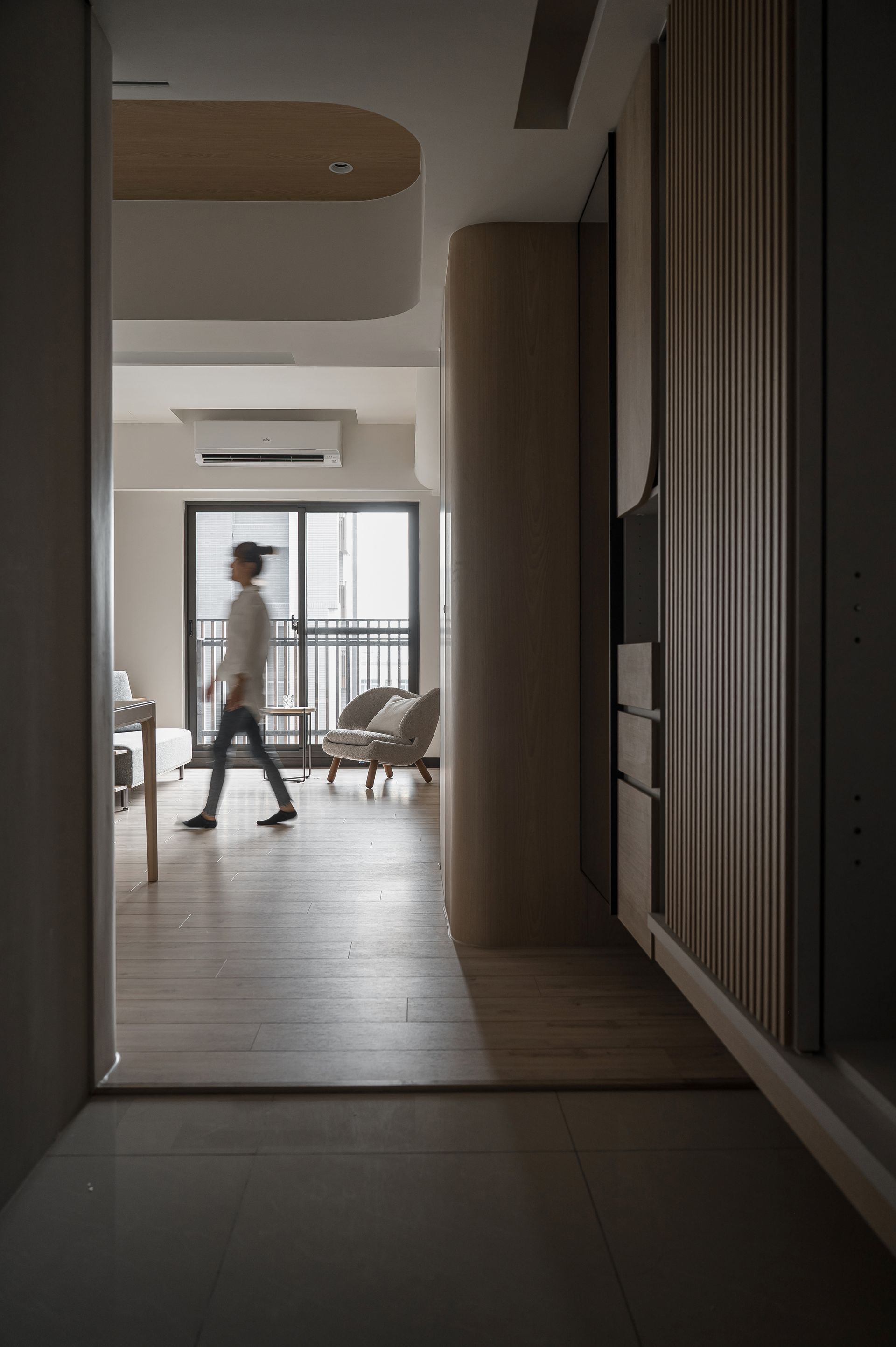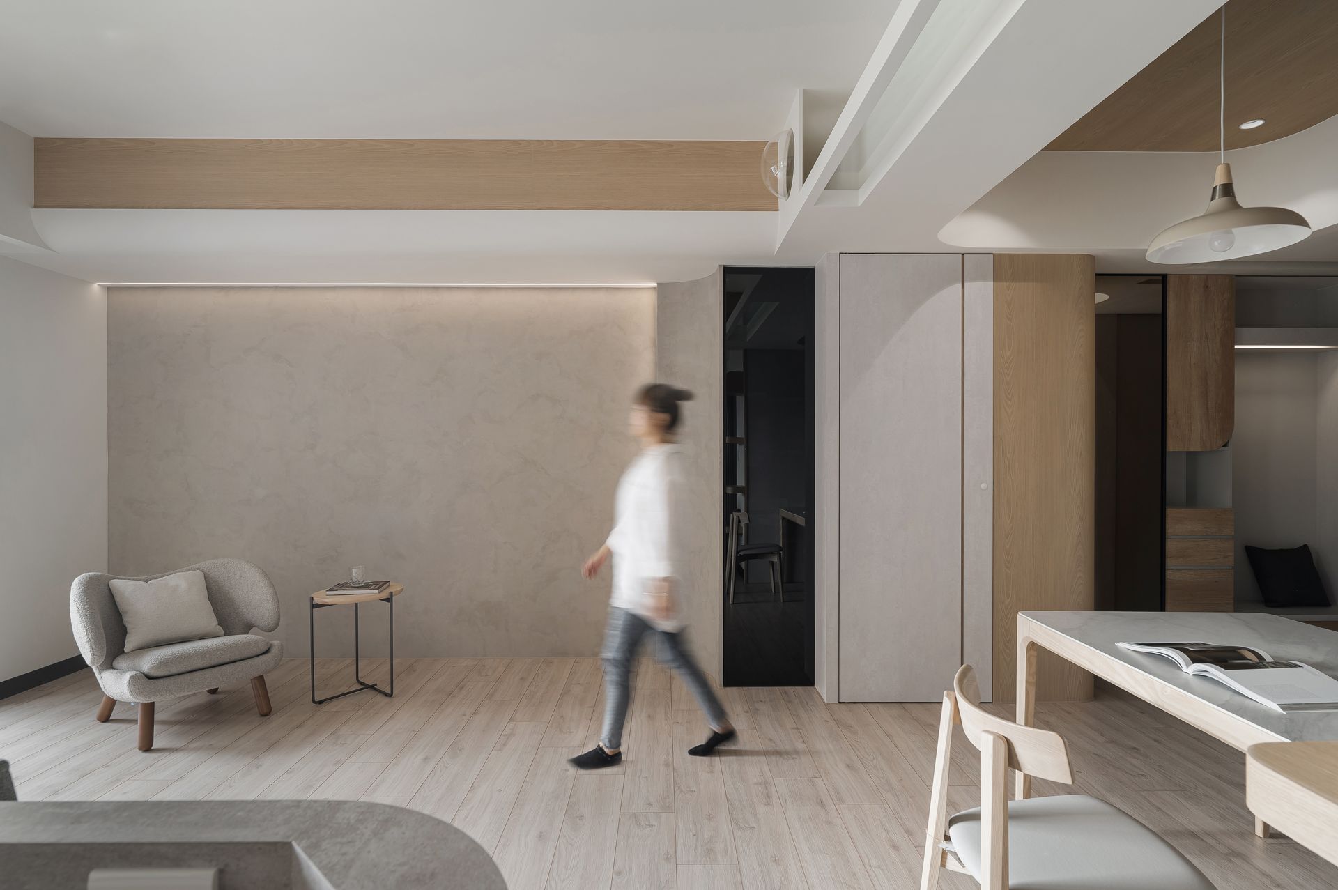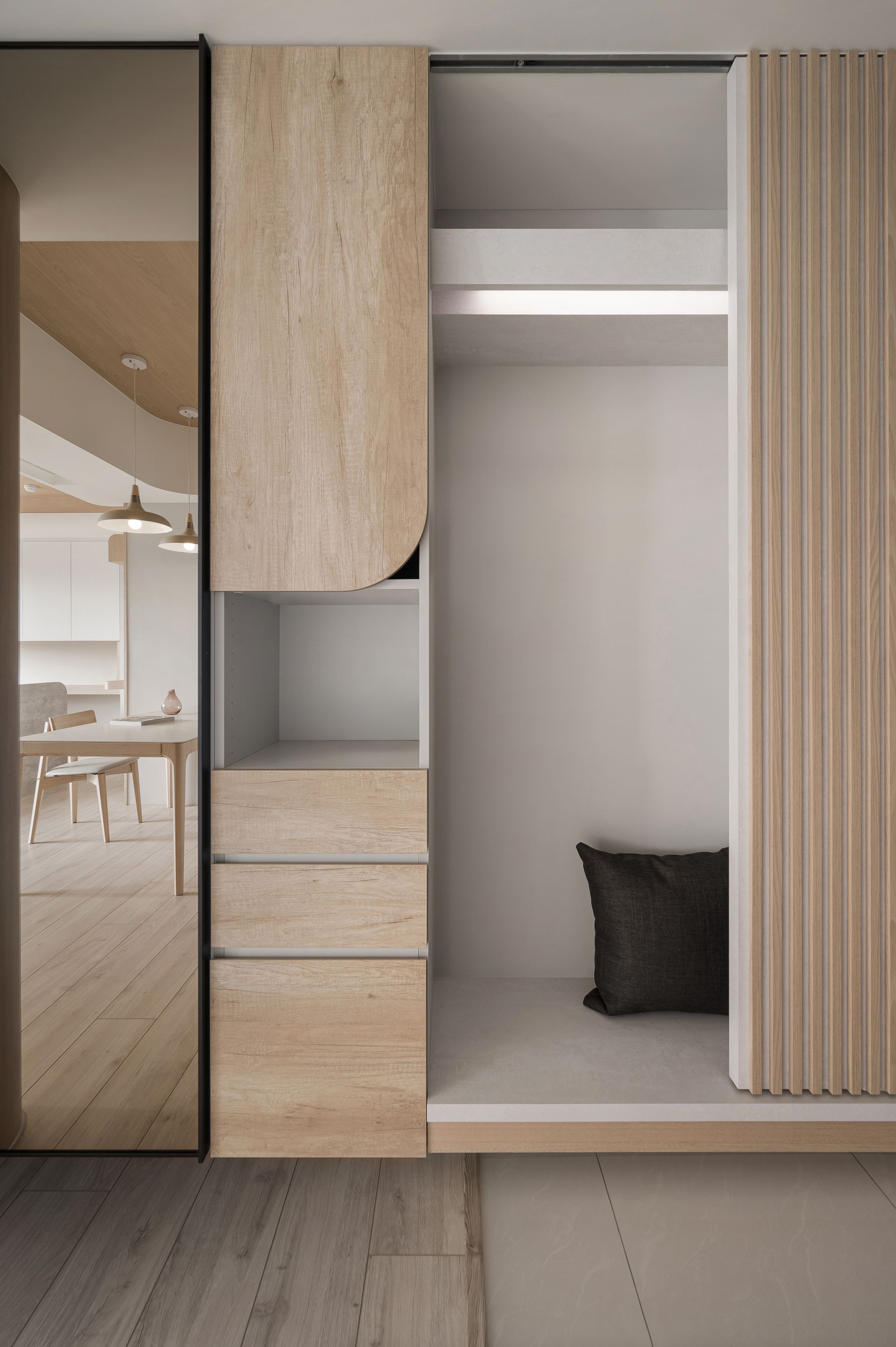入隱藏的圓弧造型牆面,實際上是大型儲藏室,方便收納大型物品。