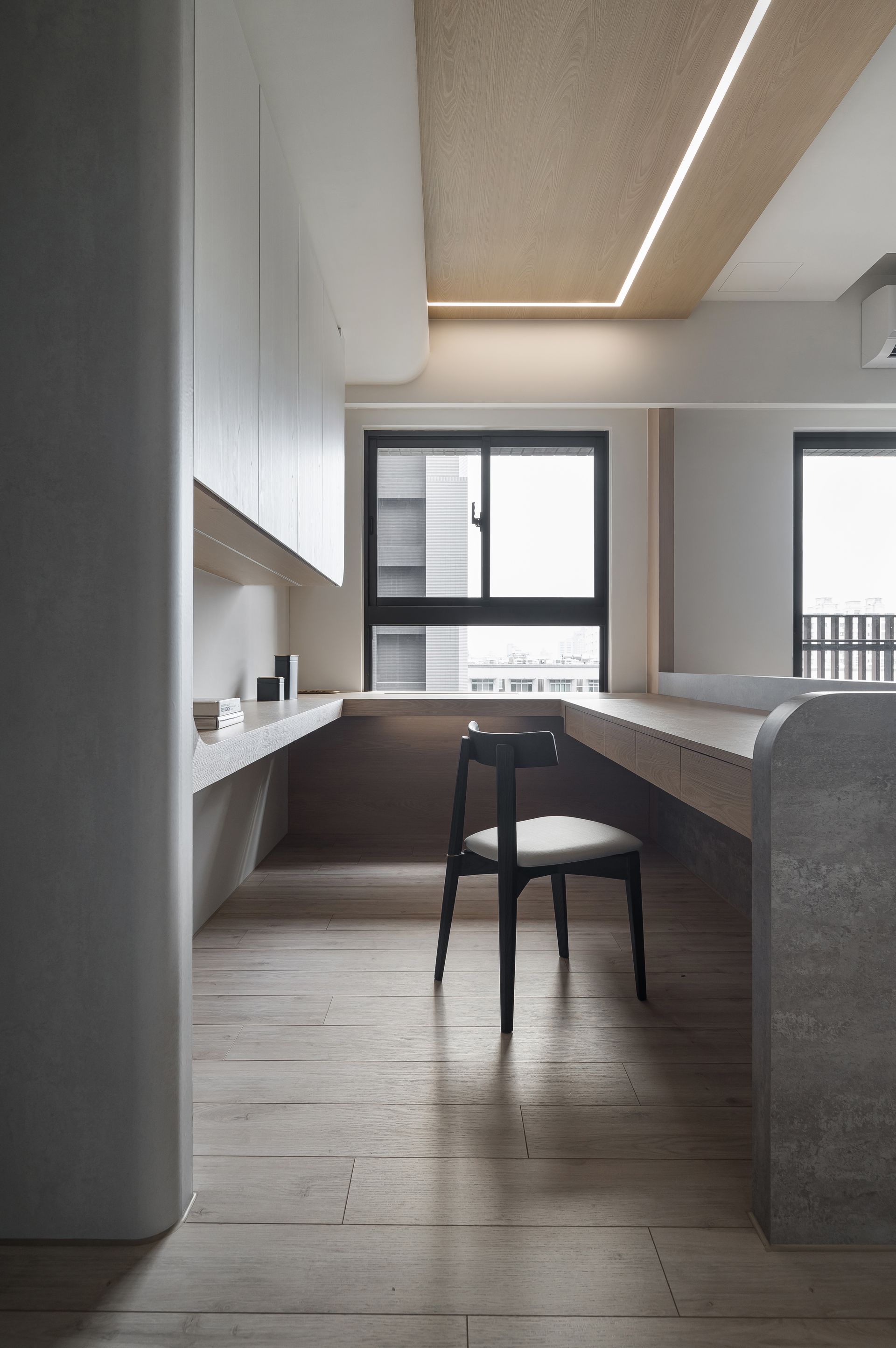 沙發背牆與長形書桌結合,大型收納書櫃採簡素門片設計,減少雜亂感。