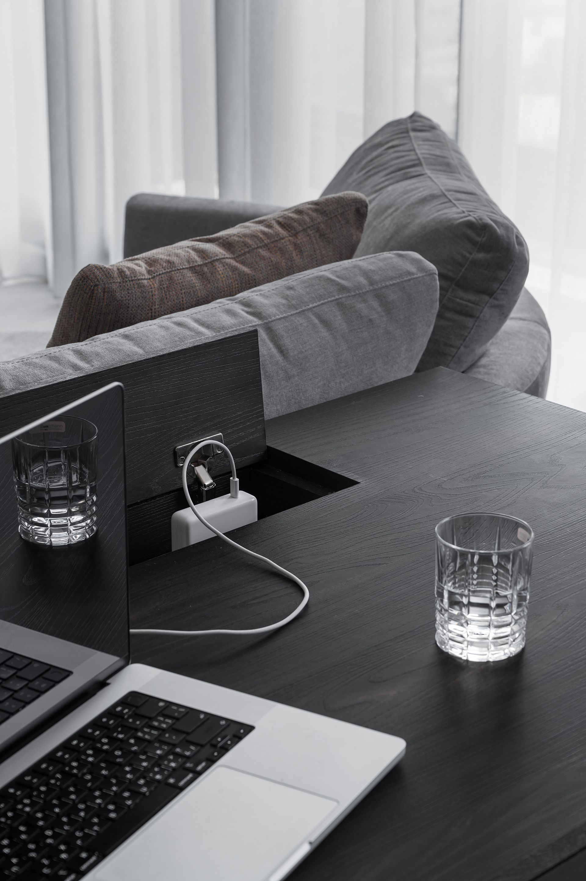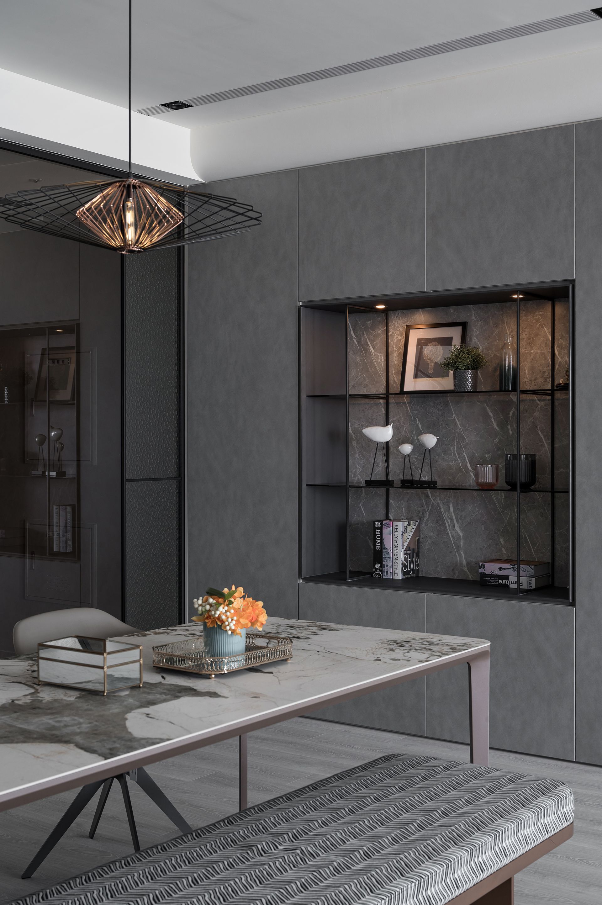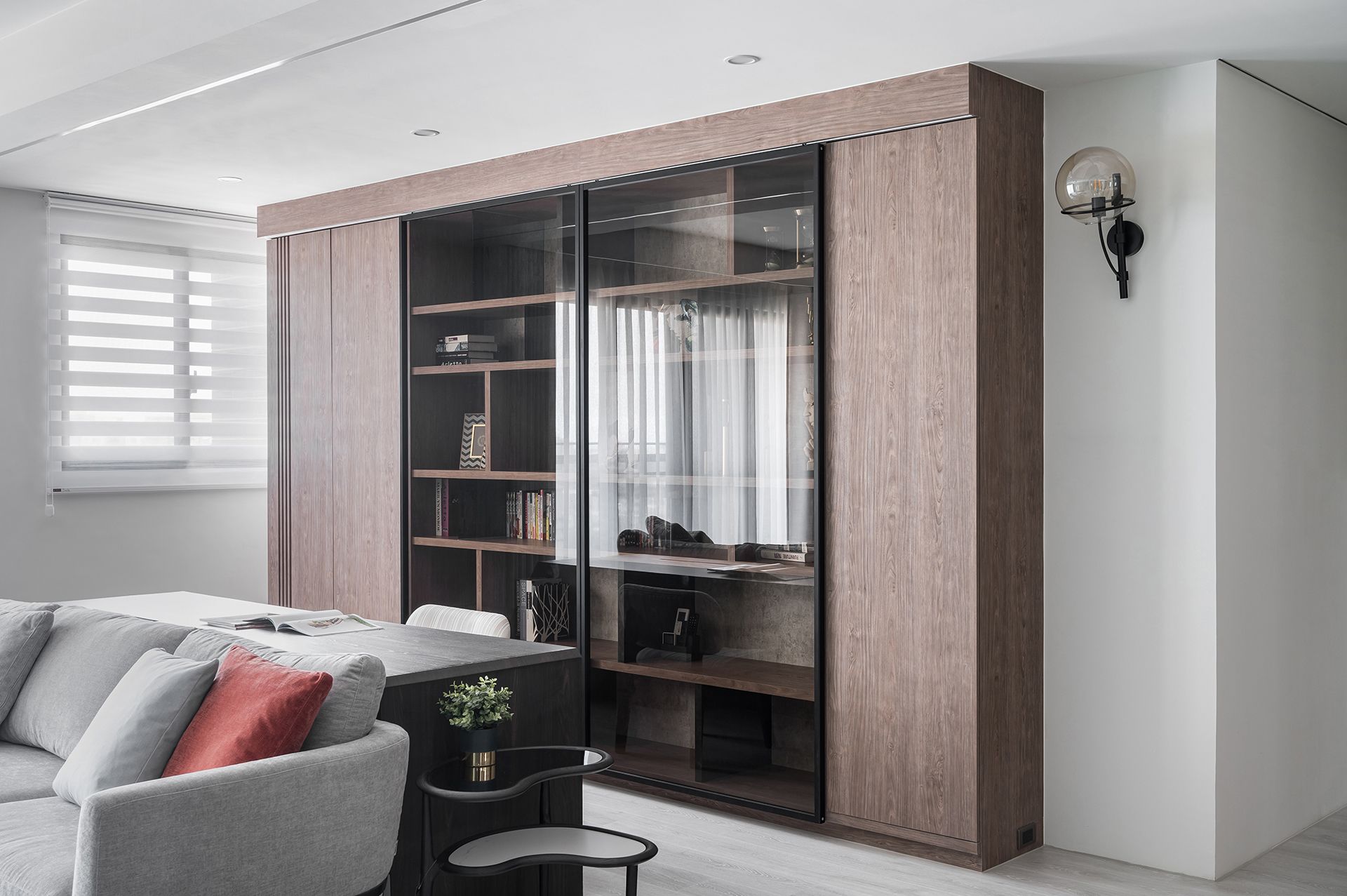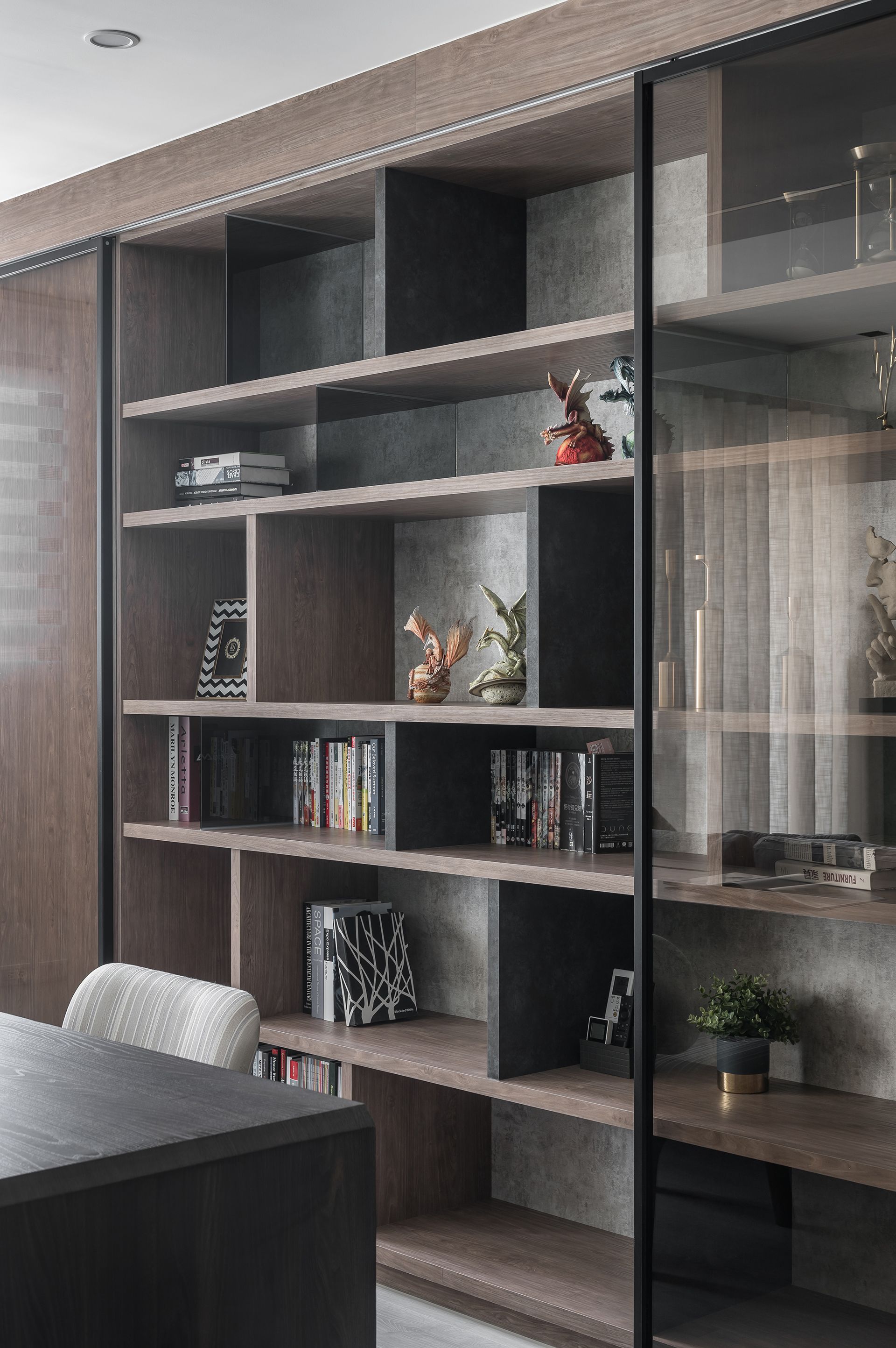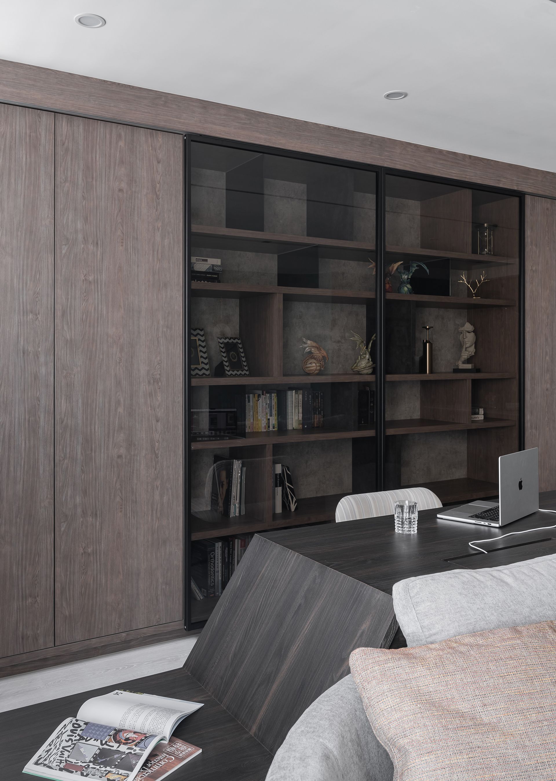 書桌後設有大型玻璃拉門書櫃,高低層次的展示層板,將不同尺寸的書籍和展示品,做更有效的分類與收納。長型訂製書桌將插座、網路等線材接口,隱藏至可掀蓋板中,兼顧簡約機能與視覺的舒適性。大尺寸的桌面,無論聽音樂、看書或工作,都能游刃有餘地利用,桌面設置延伸的斜板,適度隱藏電源線並配搭整體空間造型。