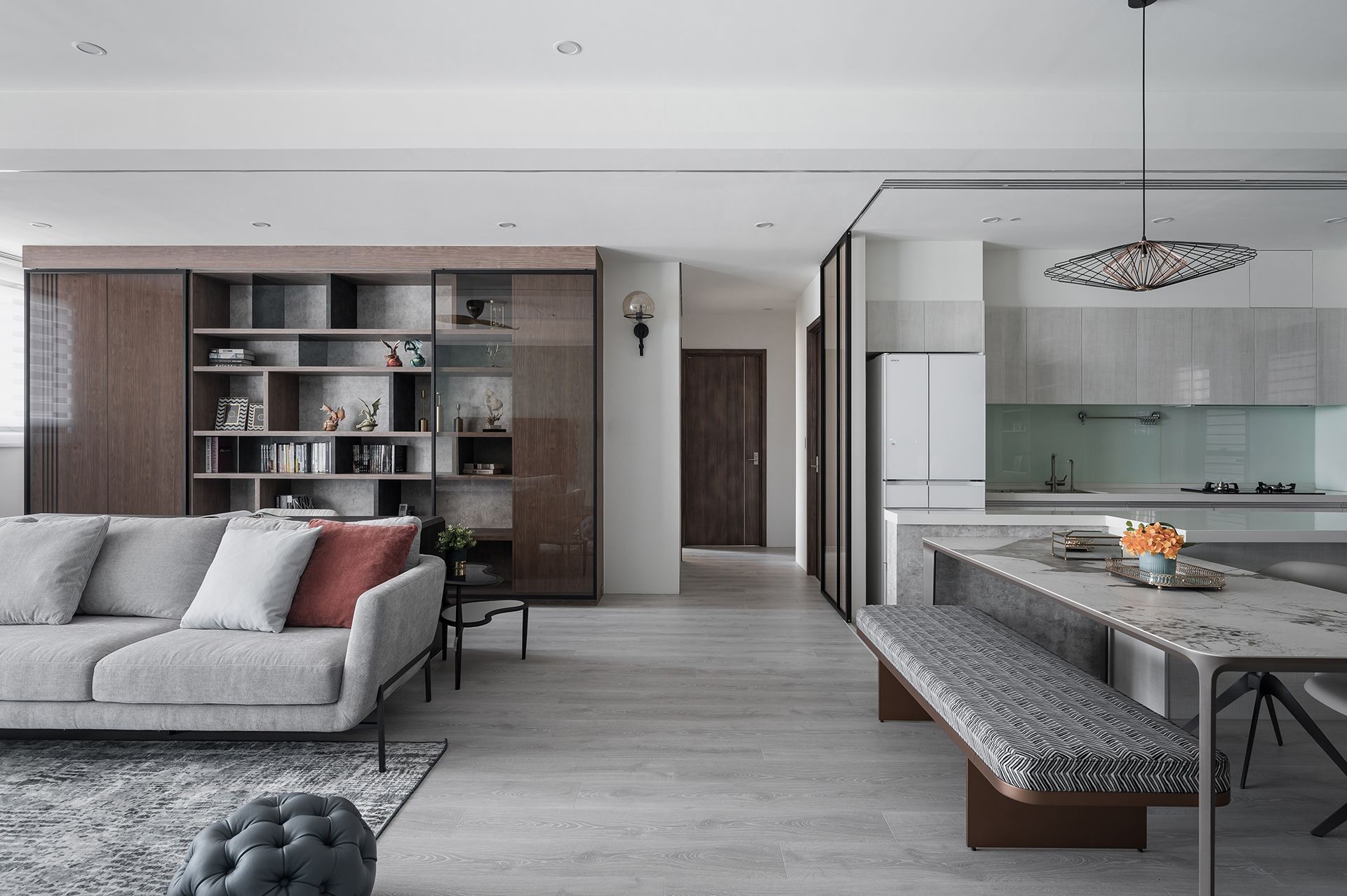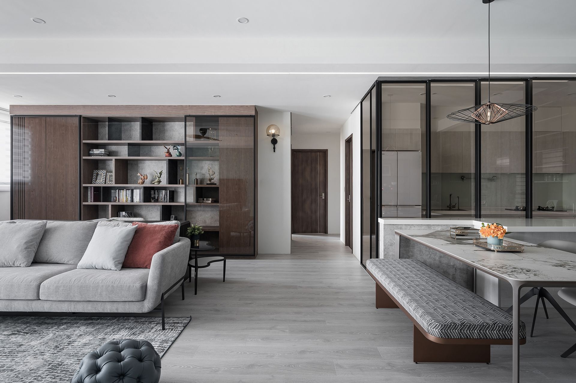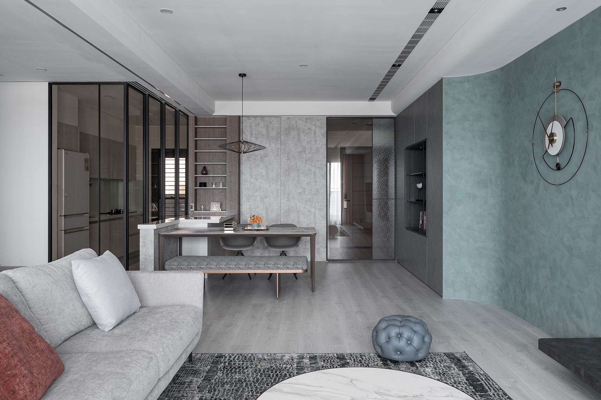 滿足業主對於健康潔淨,安心舒適的需求,玄關設置可定時消毒的紫外線殺菌燈,以及可臭氧殺菌的電子衣櫃,不必擔心外界雜質進入室內。廚房設計可完全封閉遮擋的玻璃門,做菜時能充分享受樂趣又不必受油煙干擾。