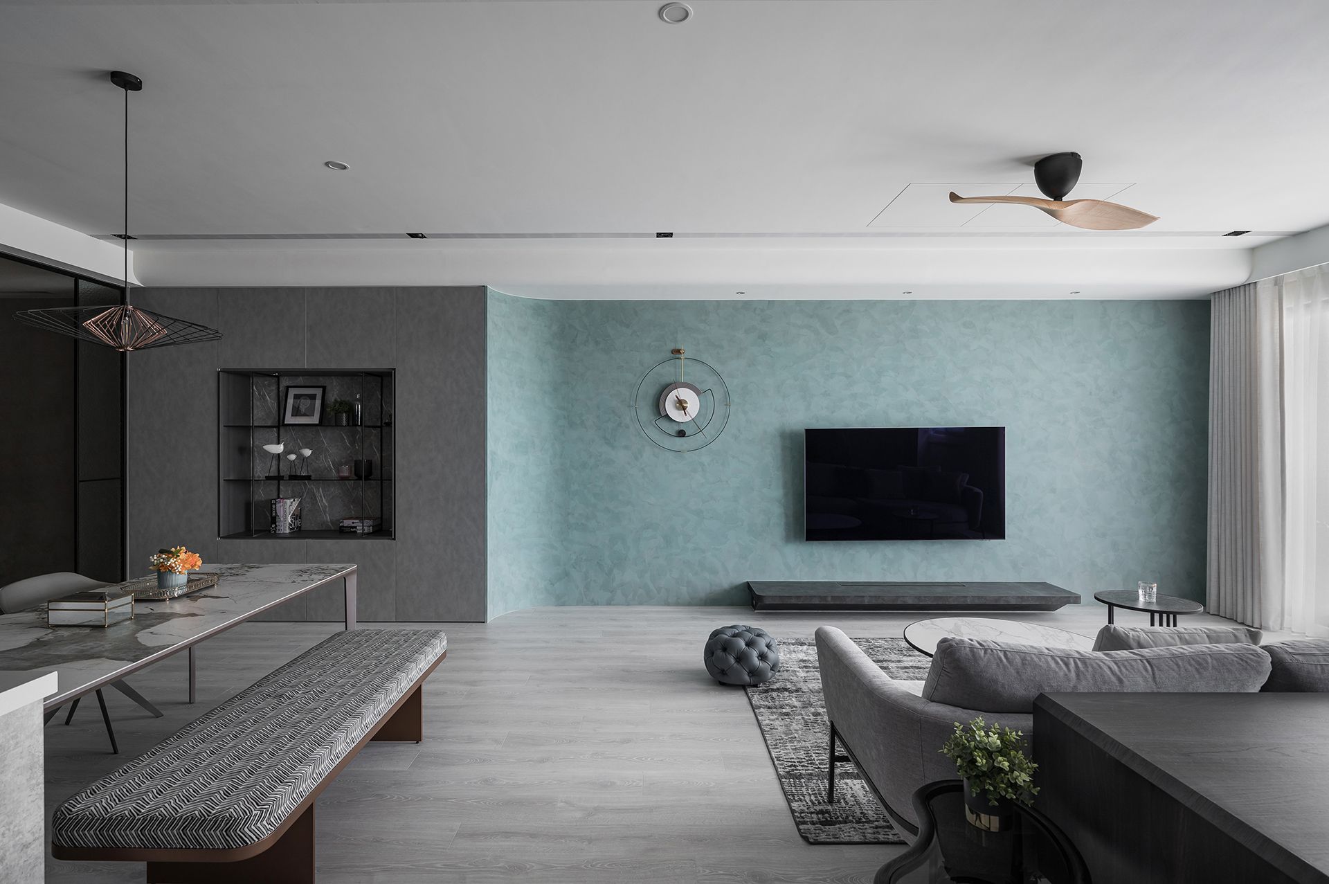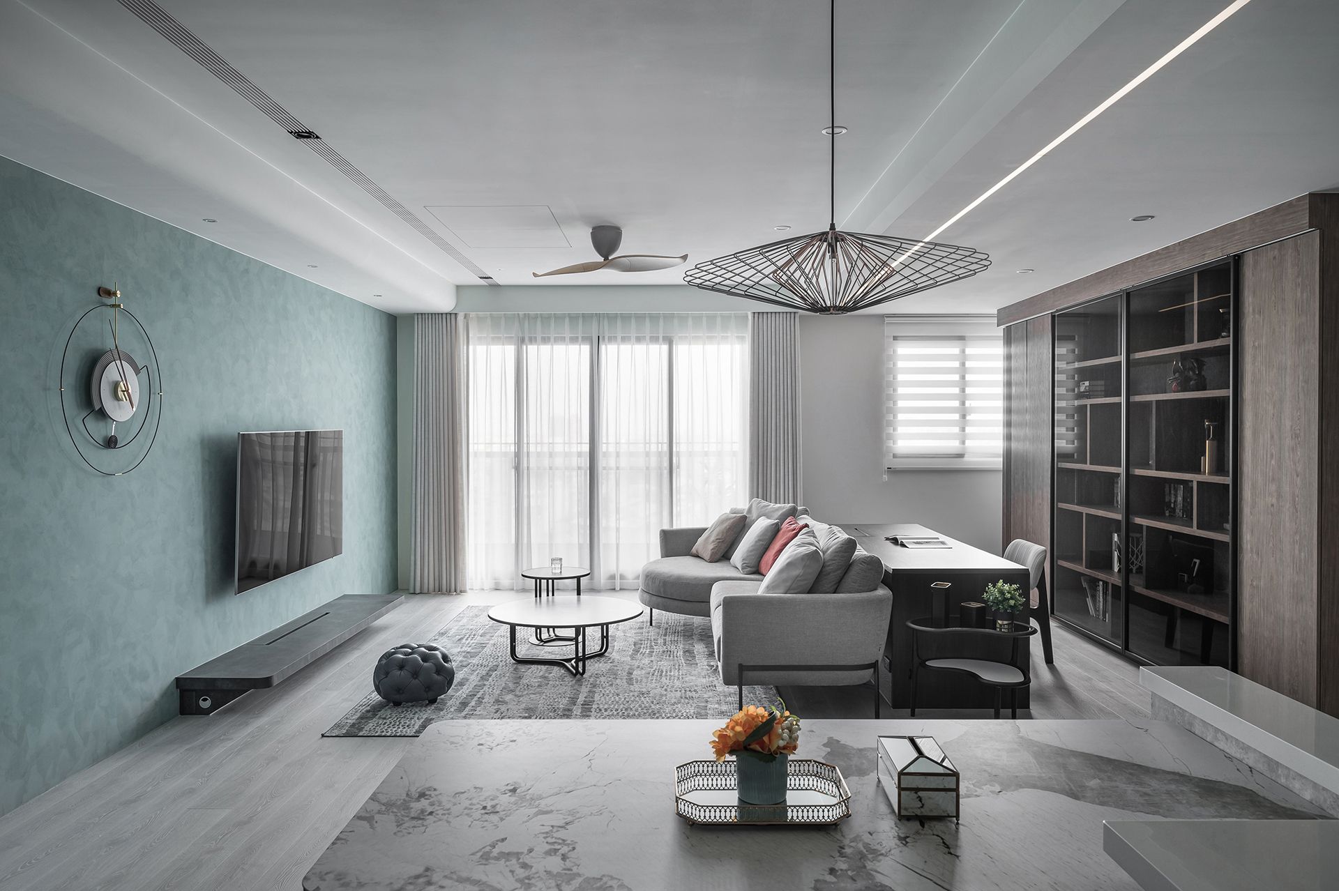 以綠色手工塗料粉刷電視主牆,引入大自然的活力氣息,在視覺上達成單純質感與放大的空間感。木頭材質的吊扇成了客廳另一個焦點,與大理石紋路的茶几呼應共同的自然情調。收納工作用品的行李箱可放在書櫃中,不須特別打理,拉著行李箱就可立即外出工作。