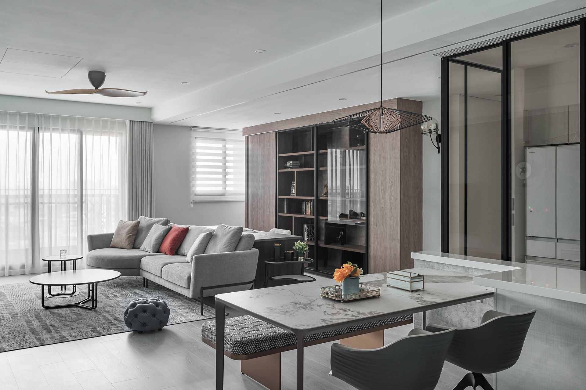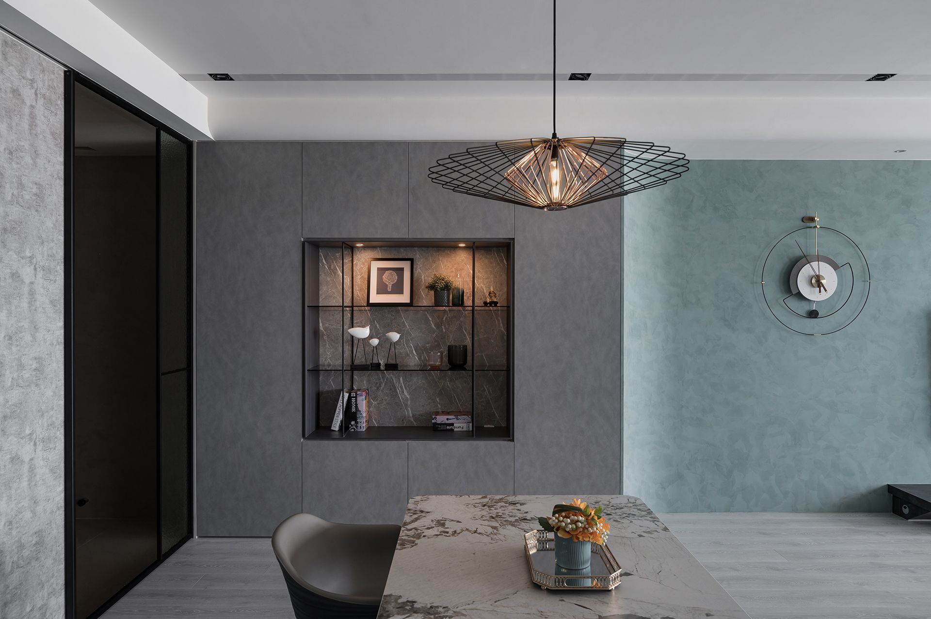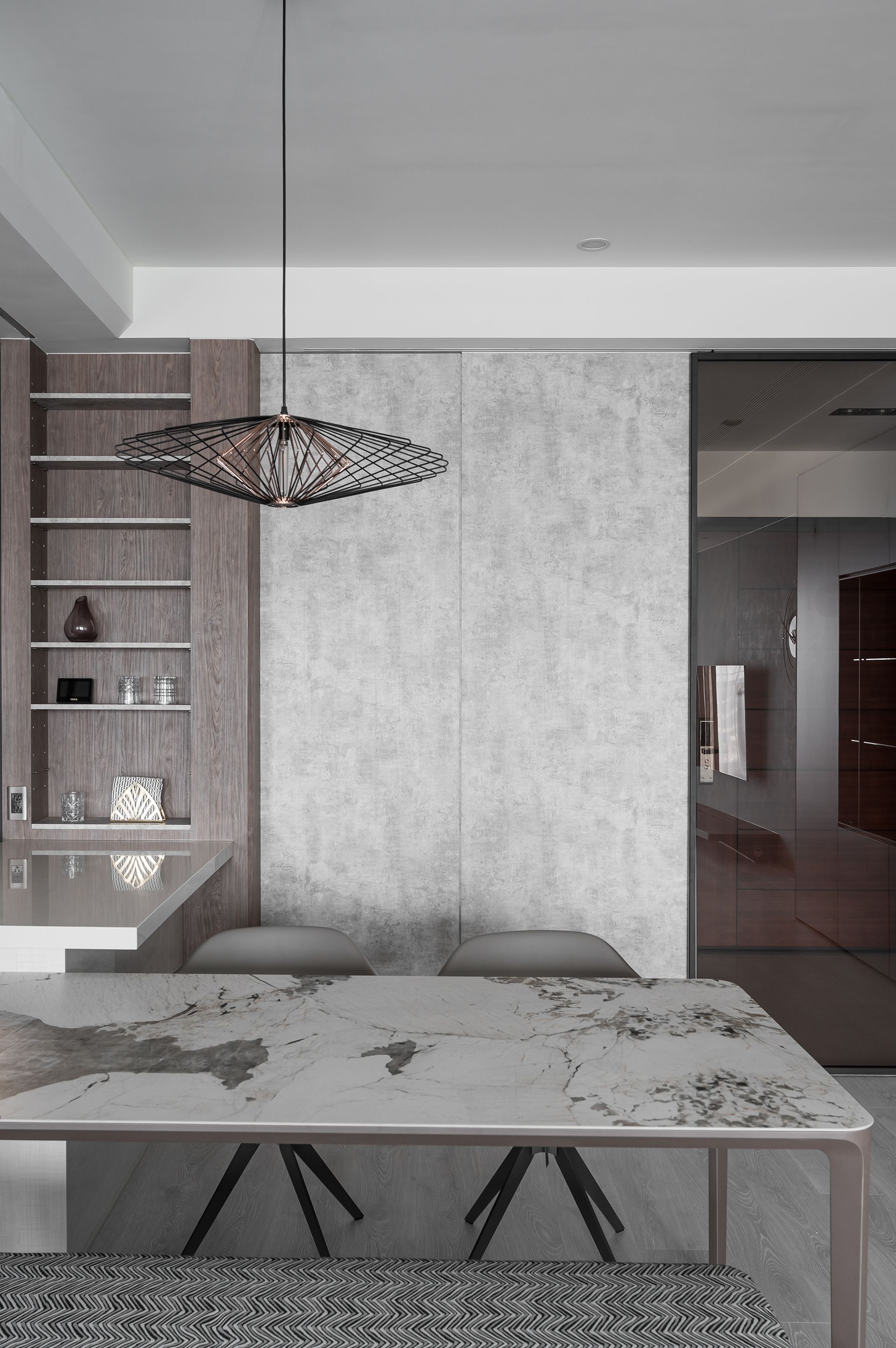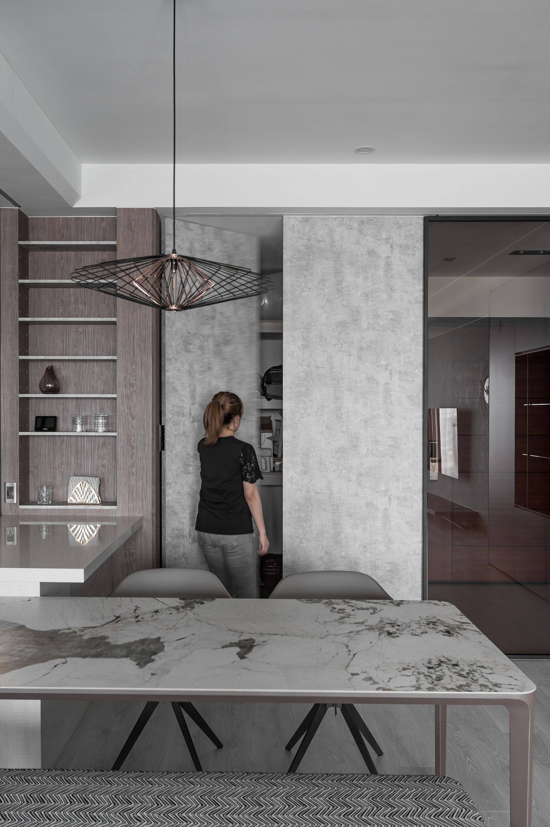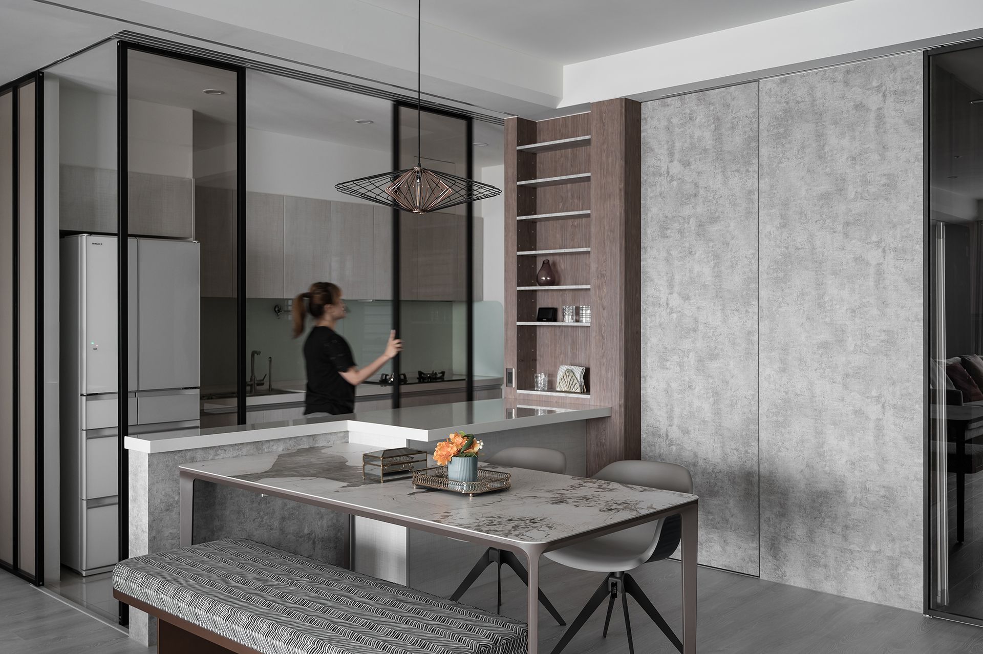 用餐區設有與中島連在一起的六人座餐桌,必要時可外移,延伸出更多待客的座位,方便下廚招待友人,以及輕鬆隨意地互動。多片隱藏玻璃拉門可將廚房獨立封閉,避免製作餐點時油煙四溢,平時可自由選擇開放或關閉。櫥櫃旁設有大型步入式儲藏室,完整收納行李箱、鋁梯、吸塵器、衛生紙備品等大型物品。
