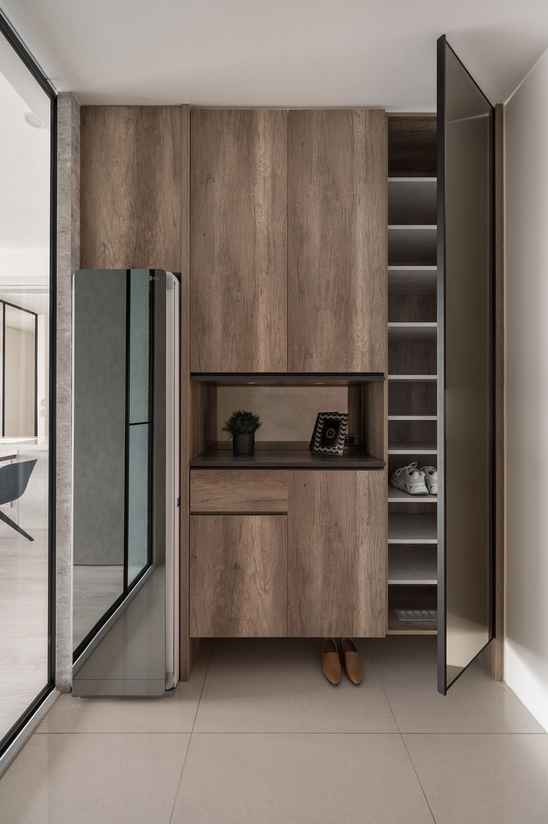 使用玻璃拉門完全切割落塵區和室內空間,因應屋主對於潔淨的要求。上方天花板設有隱藏的紫外線殺菌燈,以利玄關區定時消毒,殺菌燈的開關設置在居家走道內部,避免誤觸開關。大容量鞋櫃旁另外設置電子衣櫃,一回家就能將外套、工作服、包包等物品放入,去除灰塵並以臭氧殺菌。