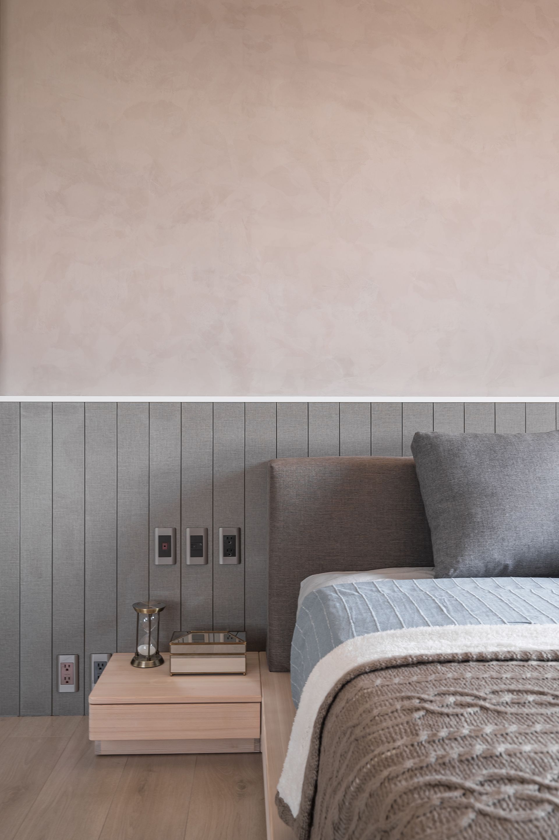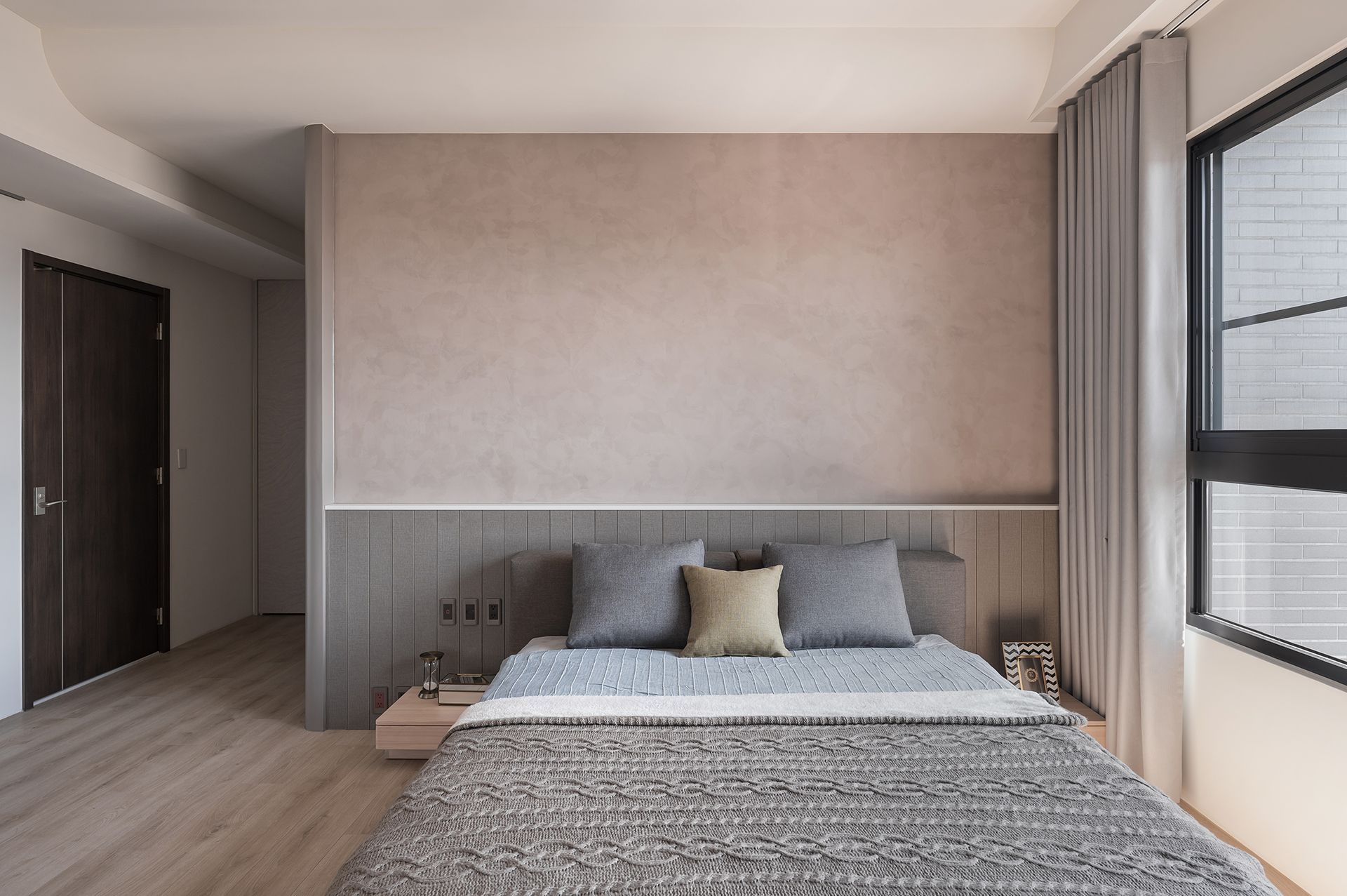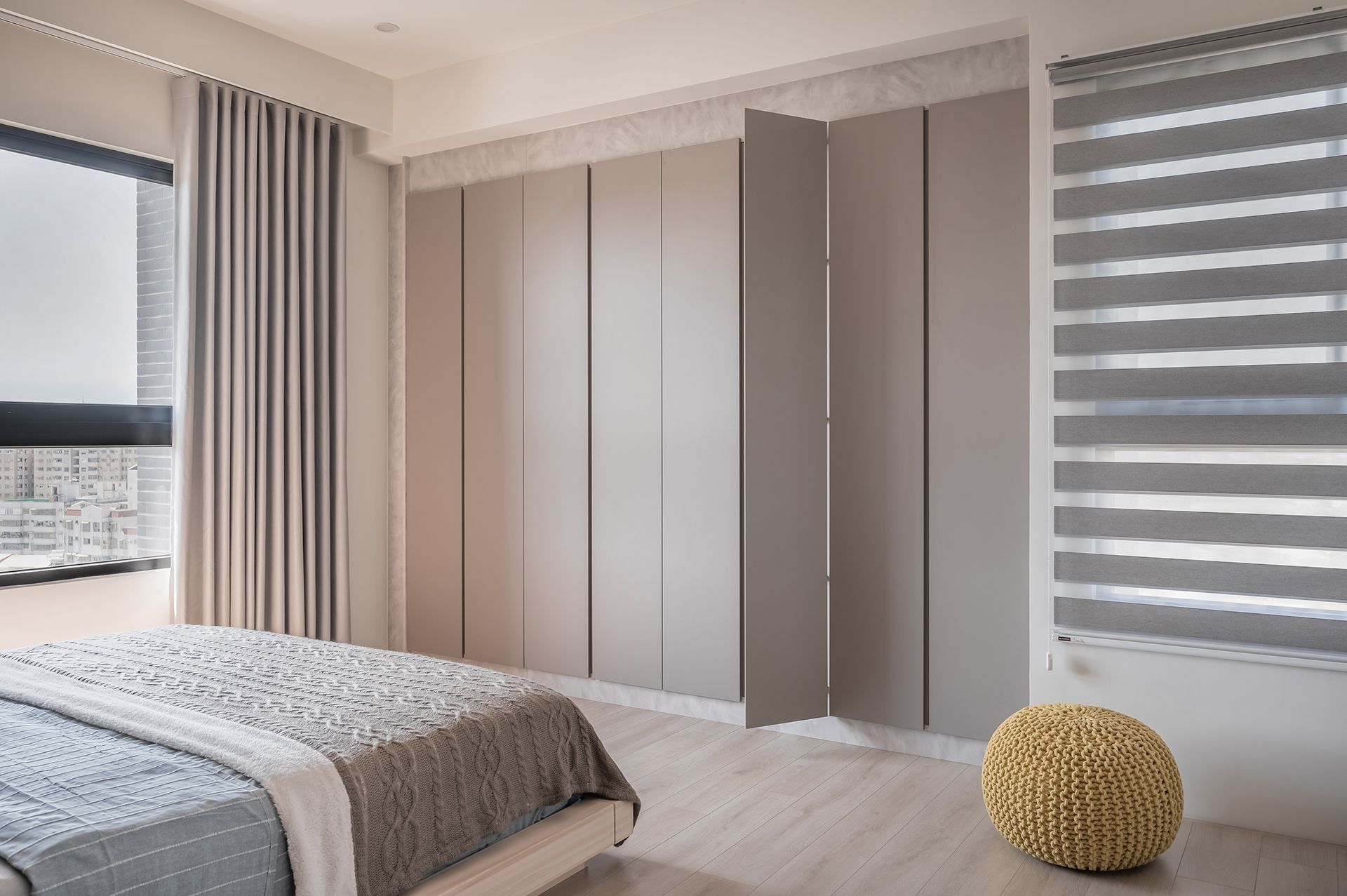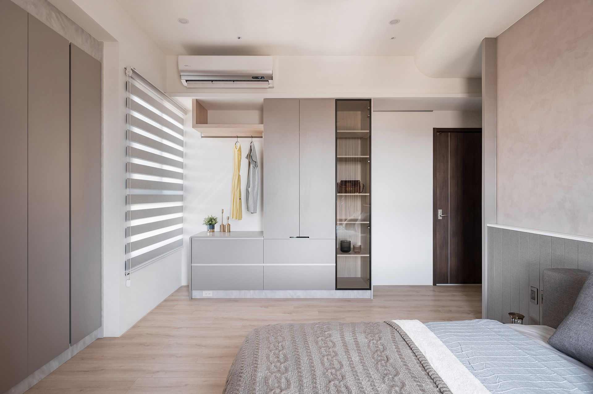 臥室、衣櫃、更衣室都是溫暖的奶茶色系,為睡眠區營造更安心紓壓的氛圍。Queen size的雙人床兩端特別設置大容量衣櫃,側面也配置展示包包用的玻璃層櫃,在收納上不再有心理上的侷限和負擔。