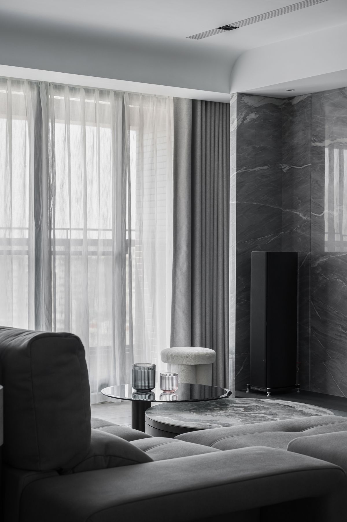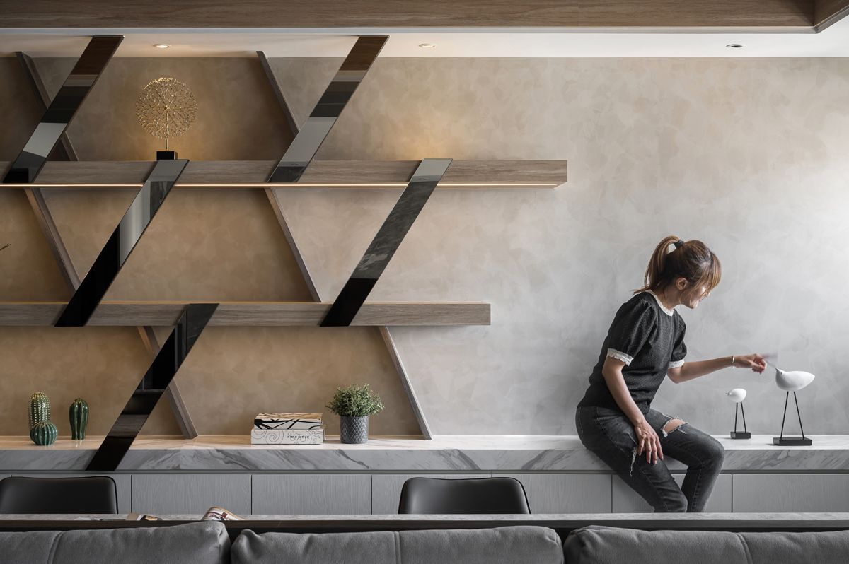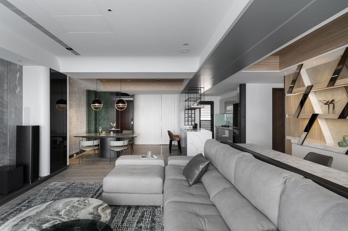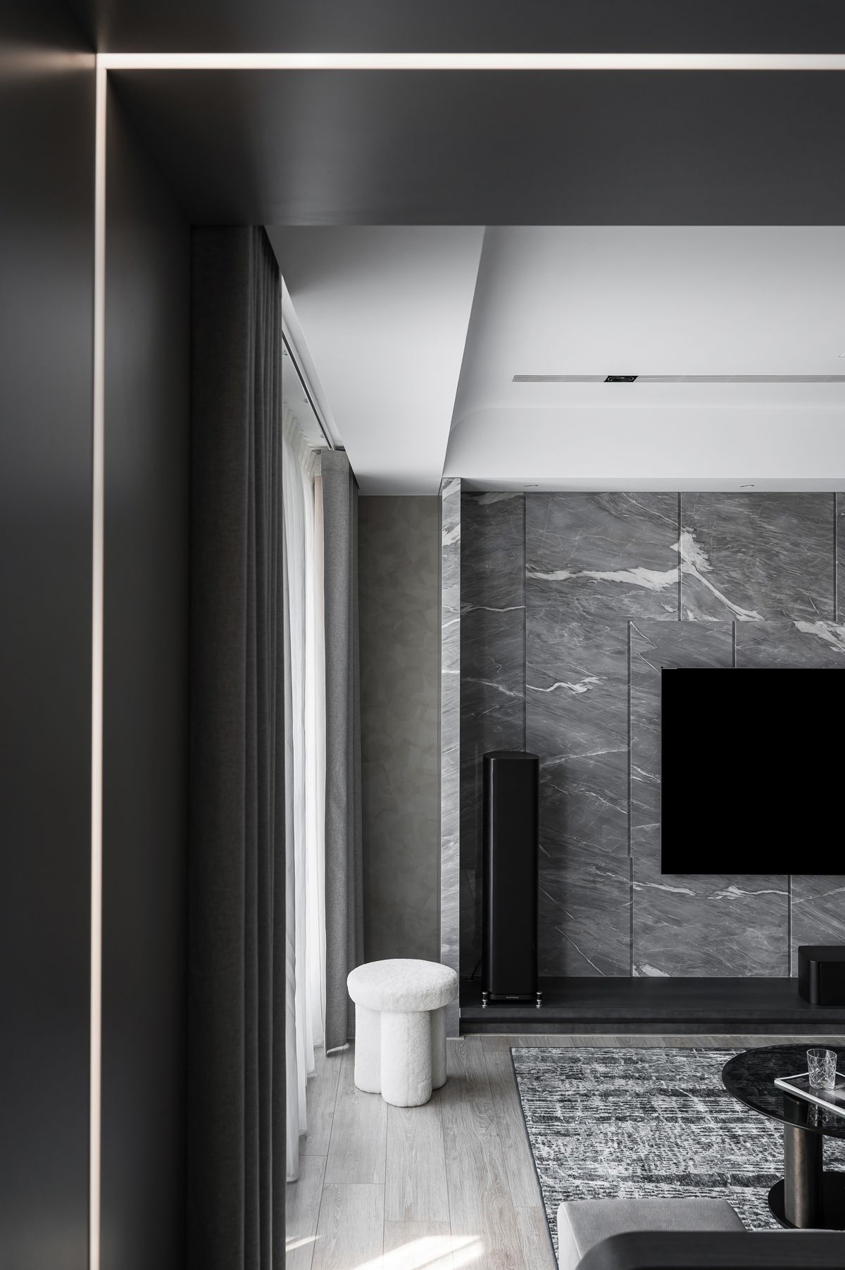 不同於線條及色彩活潑的玄關與餐廳,客廳回歸休憩本質,以沉靜色調為基底,大片純白的天花板,寓示著讓生活留有餘裕,偶爾留白、放空,享受餘閒時刻。電視牆採用灰色大理石鋪面,以俐落線條堆疊,創造視覺層次的趣味, 如同平實的日常裡,偶爾加入巧思,便能感受不一樣的樂趣。