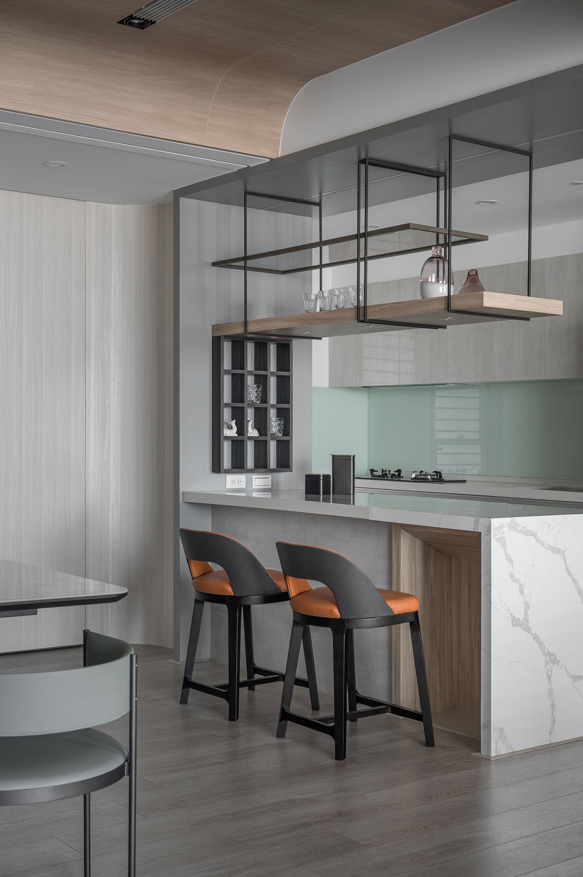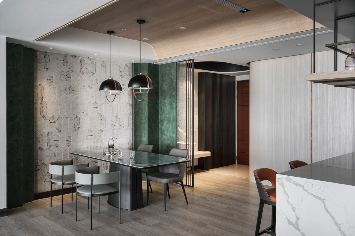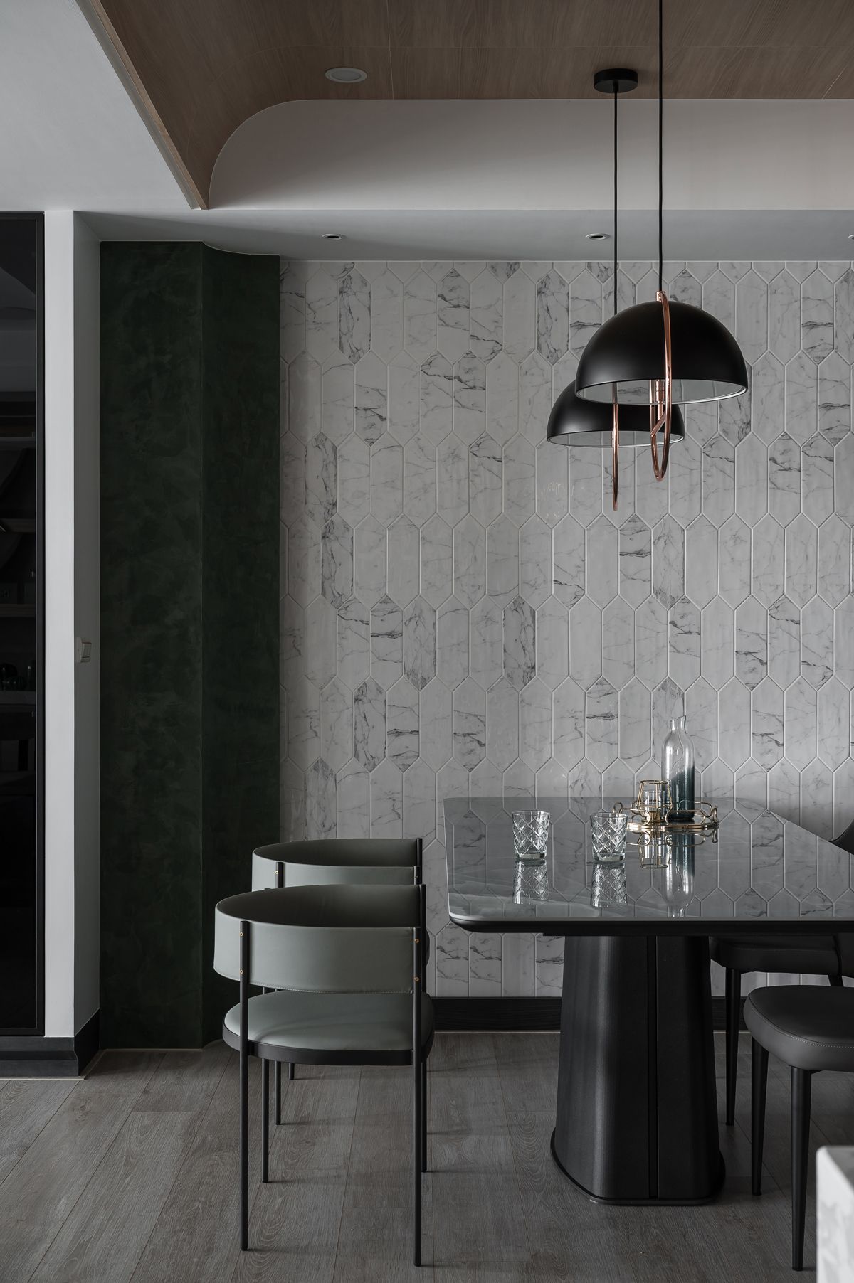 延續玄關的圓弧語彙,餐廳區的天花板,同樣借用此元素,將弧度向上凹折, 拉伸視覺高度,並拼貼柔和木紋,以此界定出與玄關不同的空間機能。軟裝部分則採用深色調,與之形成對比——鈦金色邊框搭佐黑色燈罩、鐵件桌腳承載薄陶板桌面,為餐區注入一絲沉穩的儀式感。