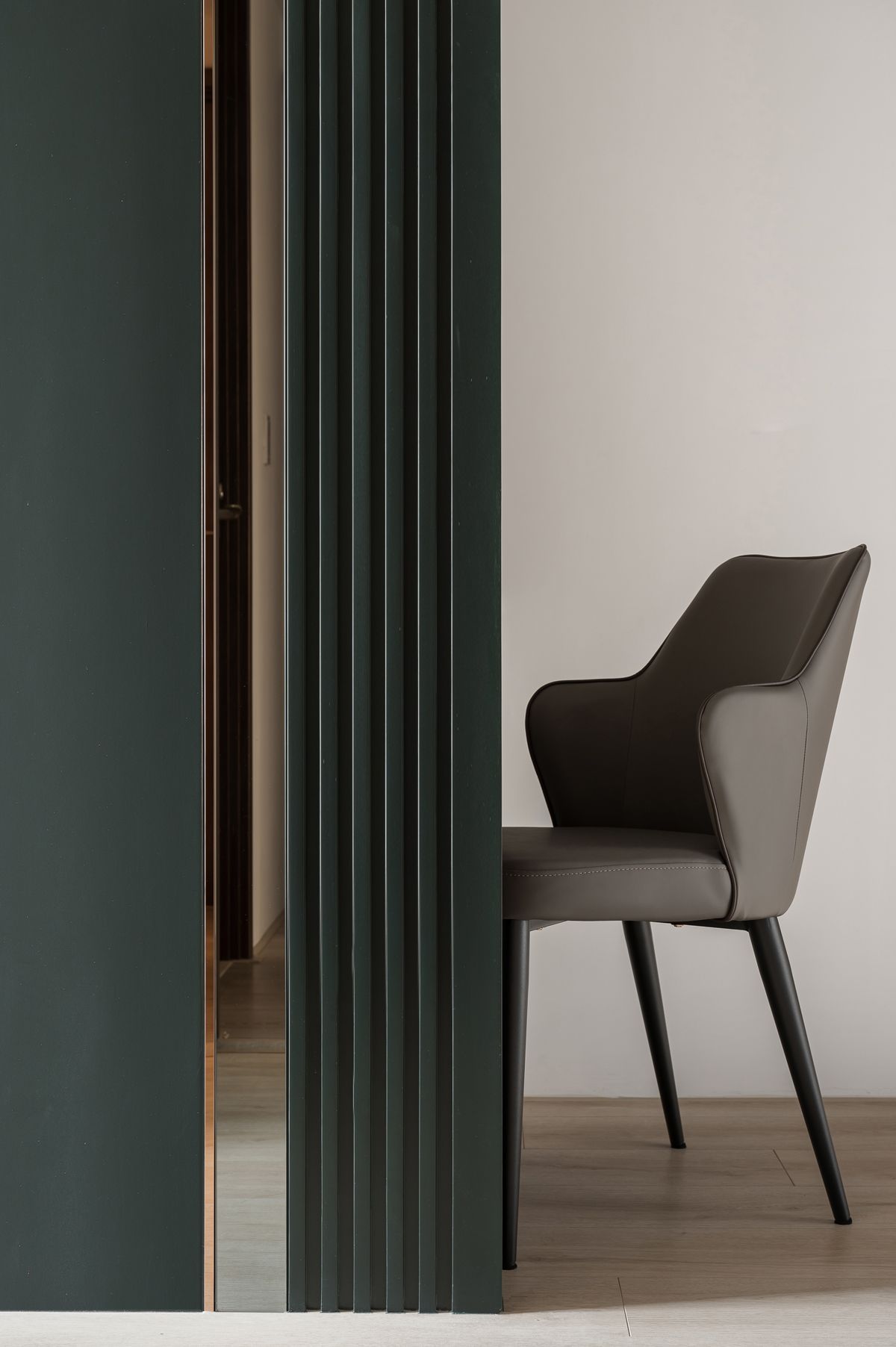 除了線條感的暗示效果,我們也藉由通透性材質,放大整體空間視感——鏤空天花板,加乘側邊立鏡,延伸玄關視覺;鐵件格柵及毛玻璃半掩,使日光透進,形塑輕盈質地。手工綠色塗料鋪陳牆面,拼貼大理石紋劍形磚,消光與亮面肌理,形成質材對比,構築一處室內森林,靜享舒緩放鬆的日常時光。