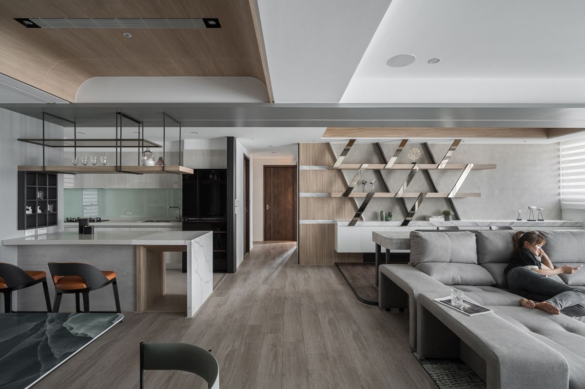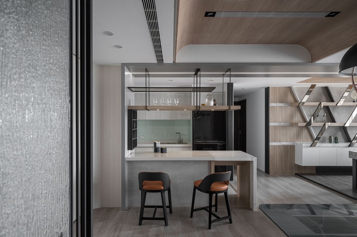 我們將餐廳與廚房的中軸拉出,透過中島來劃分場域性質,並利用其中的畸零空間,置入收納機能,設計為儲藏室,提供屋主放置行李箱及備品。而中島做為廊道的過渡,也巧妙的藉用壁面延伸梁柱,架構出ㄇ字型框景,內嵌線性燈源,串連整個公領域。