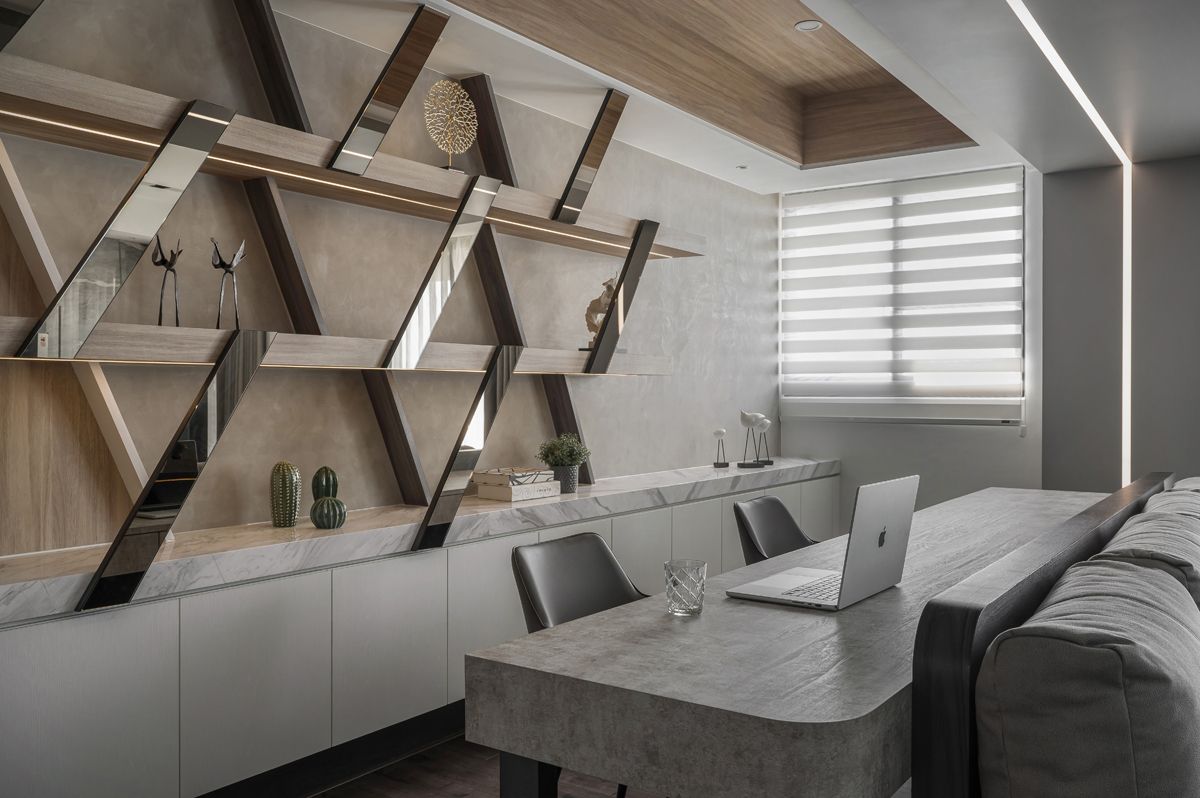 為了不讓整體空間顯的狹仄,我們打破公領域隔間,僅利用沙發椅背搭配短牆,打造開放式的互動書房。桌腳及櫃體下方也採用鏤空設計,使視覺上更加輕盈,同時方便掃地機清潔。書房背牆以藕色手工塗料粉飾,搭配木質立面, 鋪展柔和氛圍;而我們不希望它僅是滿足收納需求,因此擷取鏡面與木板材料,做V字造型堆疊,創造視覺焦點,形構一幅藝術端景。