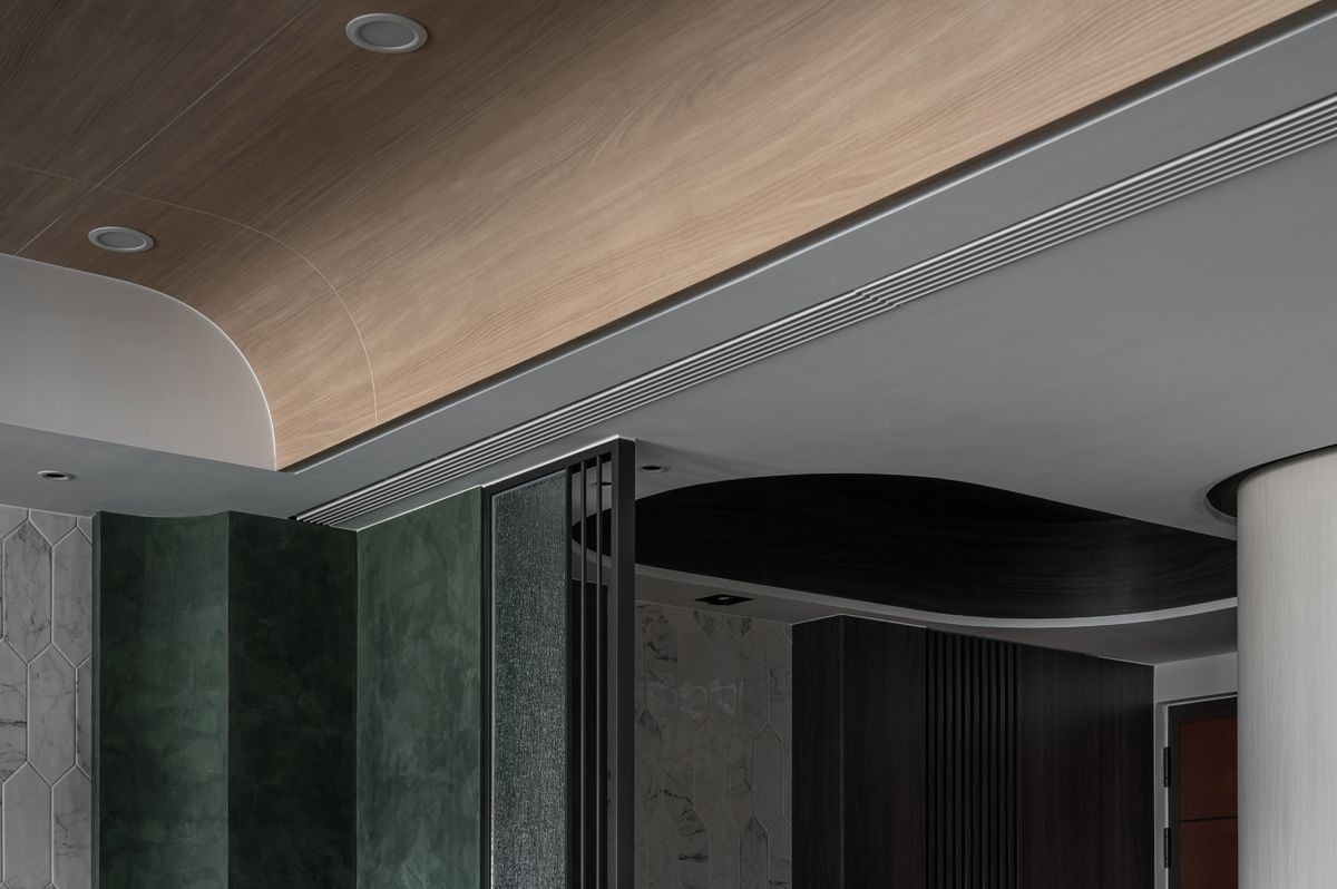 玄關區在天、地、壁皆運用了「圓弧」元素,營造柔和圓潤的氛圍——天花板以鏤空的深色漆面,沉澱歸家之人的心緒;落塵區及穿鞋椅的圓弧線條,包納返家時的情緒紛擾;壁面以木質圓弧包覆,為其劃設了步入室衣帽間,能夠於此稍作停留休息,褪去身上的疲憊。